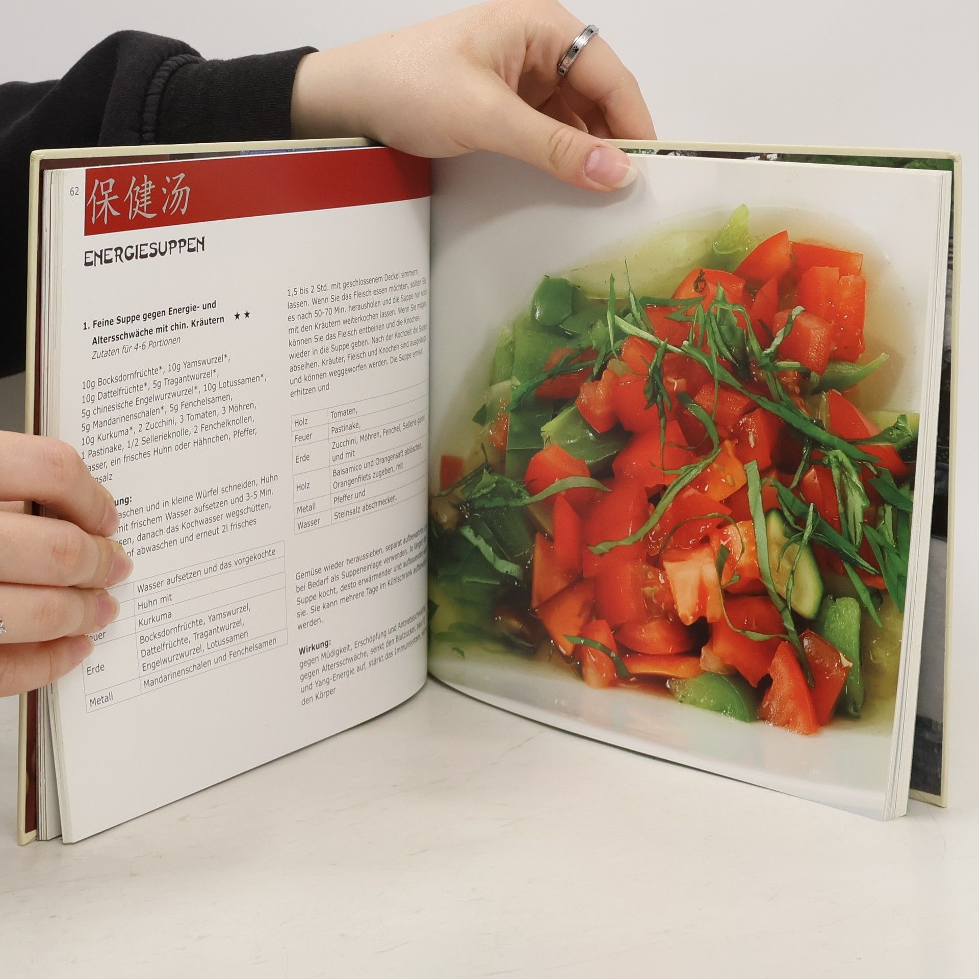 Yin, Yang und die fünf Elemente Hauptenergiequelle: Ernährung nach TCM Dieses Kochbuch beweist, dass es gar nicht so schwer ist, Gesundheit mit lecker schmeckenden Mahlzeiten zu vereinen. Mit einem Sinn für Harmonie werden aus den verschiedenartigsten Zutaten Gerichte gezaubert, die ein Vergnügen für jeden Gaumen sind. Im Vordergrund steht die energetische Wirkung unserer Speisen auf Körper, Geist und Seele. Der Interessierte kann seine täglichen Mahlzeiten selbst zubereiten und dabei ein tiefes Verständnis dafür entwickeln, was ihm gut tut und was nicht. Die abwechslungsreiche Auswahl und leichte Zubereitung der Gerichte macht dieses Buch zu einem beliebten täglichen Begleiter und wird dem Wunsch nach Gesundheitsvorsorge und Heilung aus der Küche gerecht. Alle Rezepte sind erprobt und können mit Speisen aus anderen Ländern kombiniert werden.