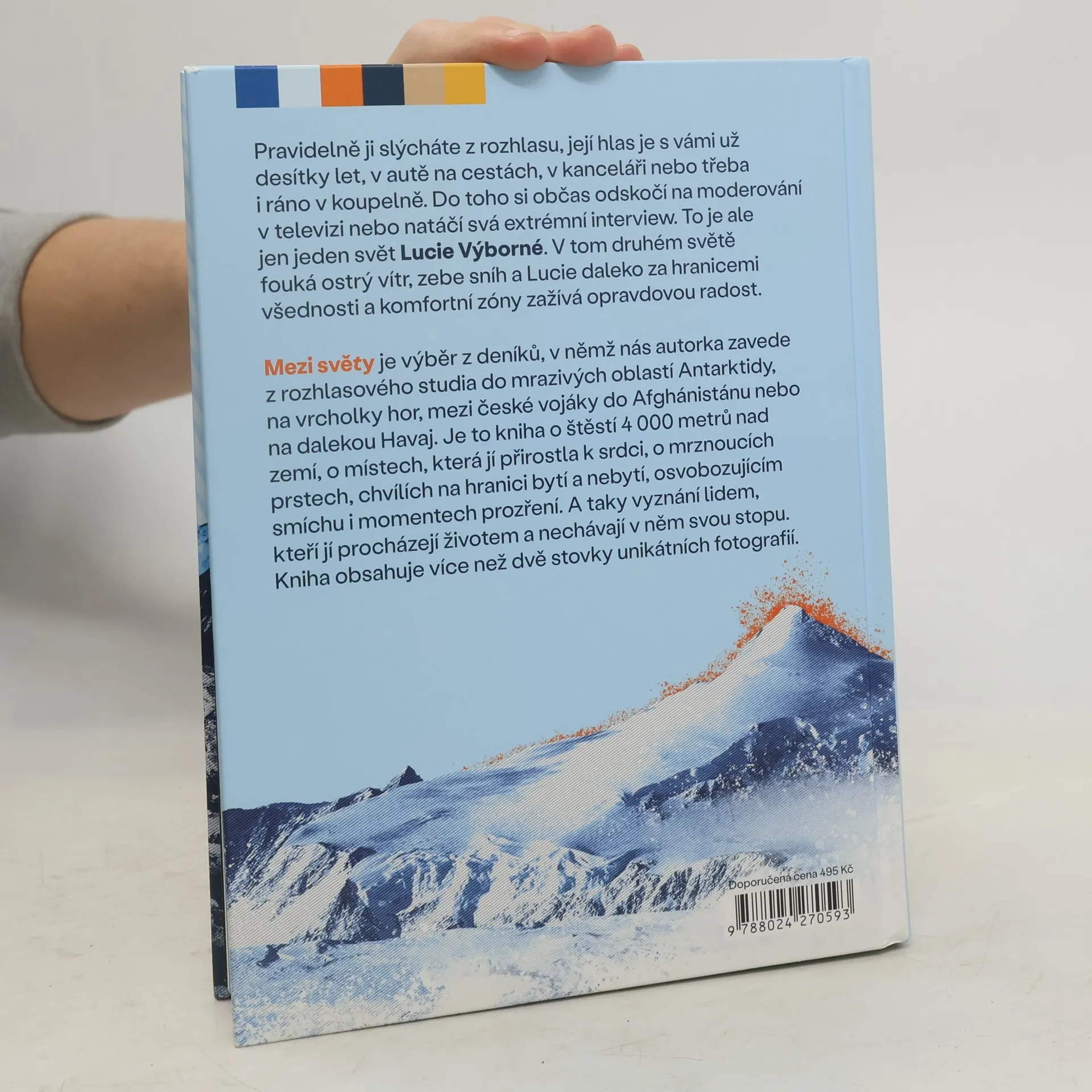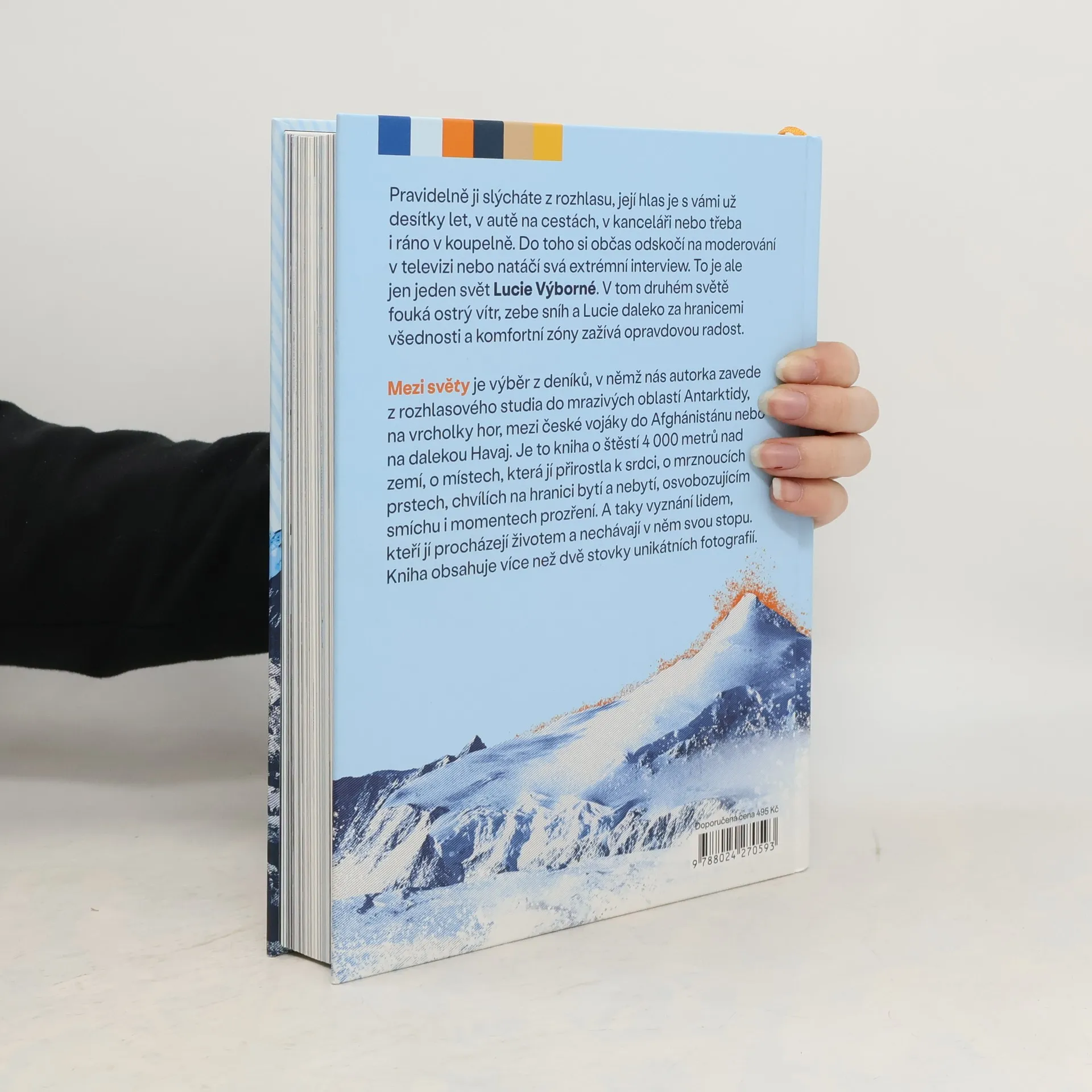 Pravidelně ji slýcháte z rozhlasu, její hlas je s vámi už desítky let, v autě na cestách, v kanceláři nebo třeba i ráno v koupelně. Do toho si občas odskočí na moderování v televizi nebo natáčí svá extrémní interview. To je ale jen jeden svět Lucie Výborné. V tom druhém světě fouká ostrý vítr, zebe sníh a Lucie daleko za hranicemi všednosti a komfortní zóny zažívá opravdovou radost. MEZI SVĚTY je výběr z deníků, v nichž nás autorka zavede z rozhlasového studia do mrazivých oblastí Antarktidy, na vrcholky hor, mezi české vojáky do Afghánistánu nebo na dalekou Havaj. Je to kniha o štěstí 4 000 metrů nad zemí, o místech, která jí přirostla k srdci, o mrznoucích prstech, chvílích na hranici bytí a nebytí, osvobozujícím smíchu i momentech prozření. A taky vyznání lidem, kteří jí procházejí životem a nechávají v něm svou stopu. Kniha obsahuje více než dvě stovky unikátních fotografií.