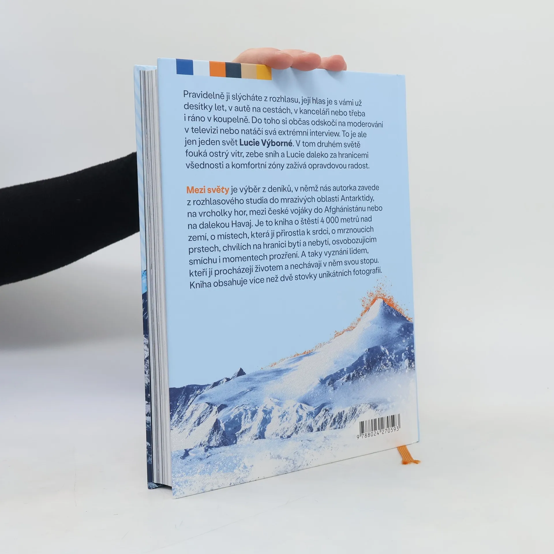 Pravidelně ji slýcháte z rozhlasu, její hlas je s vámi už desítky let, v autě na cestách, v kanceláři nebo třeba i ráno v koupelně. Do toho si občas odskočí na moderování v televizi nebo natáčí svá extrémní interview. To je ale jen jeden svět Lucie Výborné. V tom druhém světě fouká ostrý vítr, zebe sníh a Lucie daleko za hranicemi všednosti a komfortní zóny zažívá opravdovou radost. MEZI SVĚTY je výběr z deníků, v nichž nás autorka zavede z rozhlasového studia do mrazivých oblastí Antarktidy, na vrcholky hor, mezi české vojáky do Afghánistánu nebo na dalekou Havaj. Je to kniha o štěstí 4 000 metrů nad zemí, o místech, která jí přirostla k srdci, o mrznoucích prstech, chvílích na hranici bytí a nebytí, osvobozujícím smíchu i momentech prozření. A taky vyznání lidem, kteří jí procházejí životem a nechávají v něm svou stopu. Kniha obsahuje více než dvě stovky unikátních fotografií.