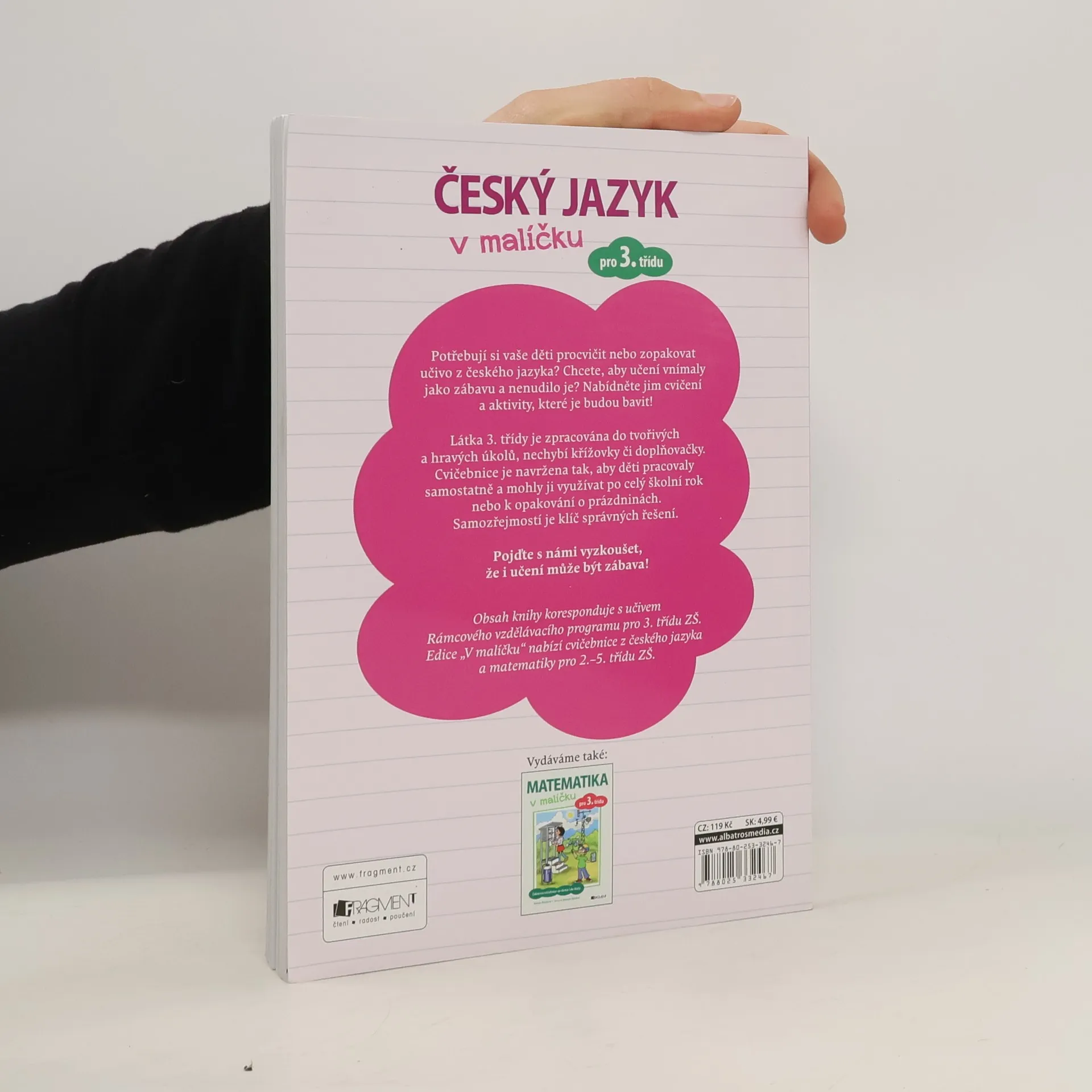 Potřebují si vaše děti procvičit nebo zopakovat učivo z českého jazyka? Chcete, aby učení vnímaly jako zábavu a nenudilo je? Nabídněte jim cvičení a aktivity, které je budou bavit! Látka 3. třídy je zpracována do tvořivých a hravých úkolů, nechybí křížovky či doplňovačky. Cvičebnice je navržena tak, aby děti pracovaly samostatně a mohly ji využívat po celý školní rok nebo k opakování o prázdninách. Samozřejmostí je klíč správných řešení. Pojďte s námi vyzkoušet, že i učení může být zábava! Obsah knihy koresponduje s učivem Rámcového vzdělávacího programu pro 3. třídu ZŠ.