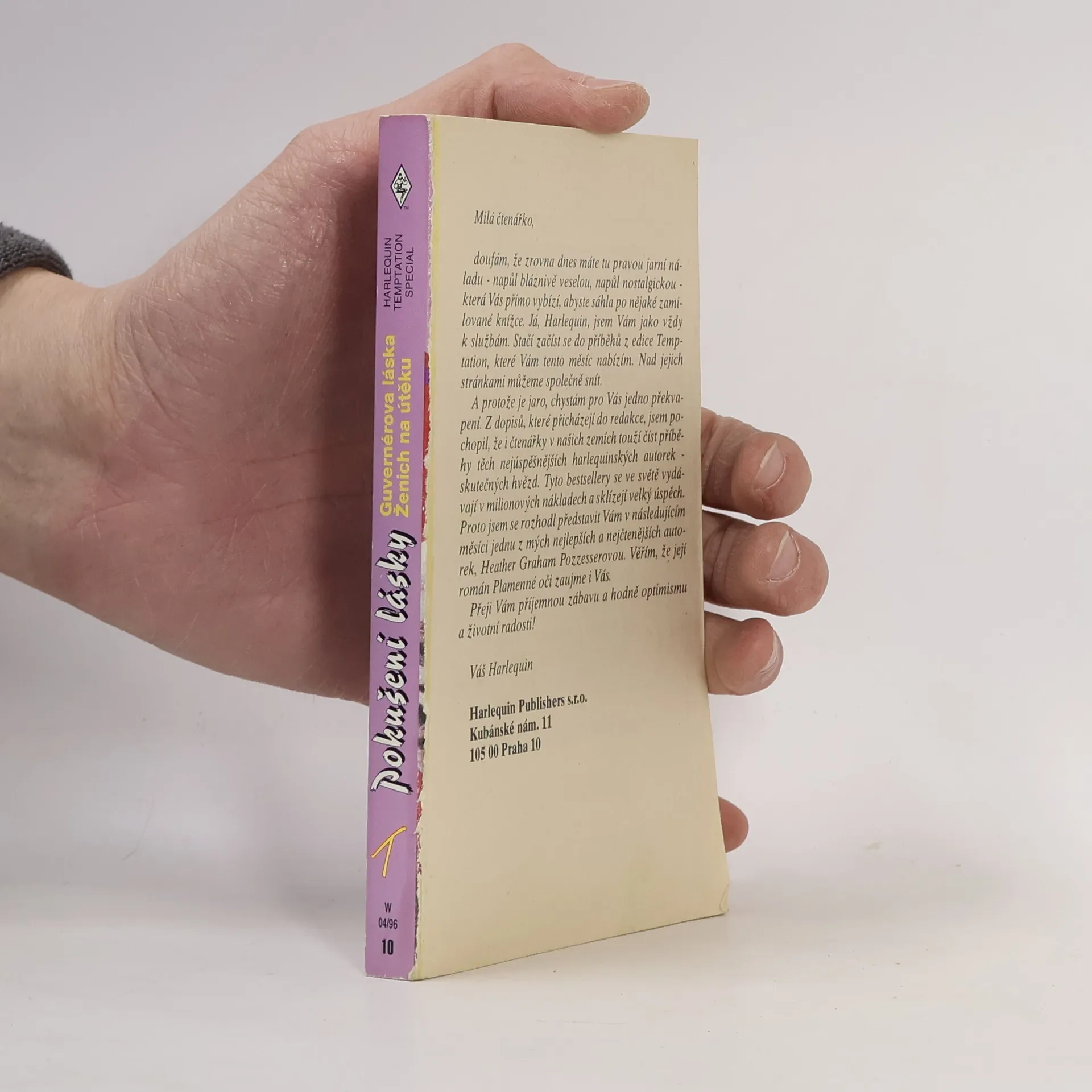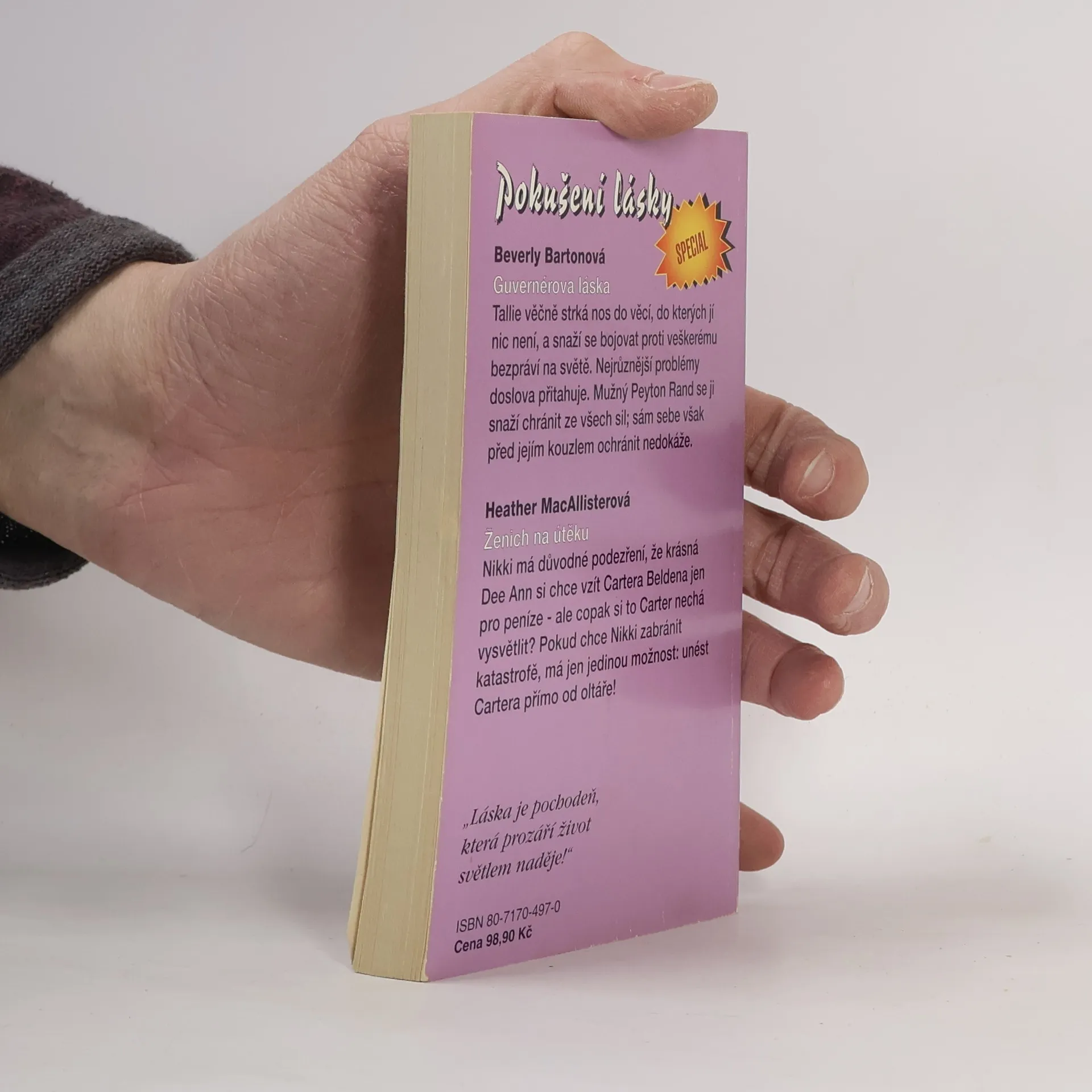 Guvernérova láska - Tallie věčně strká nos do věcí, do kterých jí nic není, a snaží se bojovat proti veškerému bezpráví na světě. nejrůznější problémy doslova přitahuje. Mužný Peyton Rand se jí snaží chránit ze všech sil; sám sebe však před jejím kouzlem ochránit nedokáže. Ženich na útěku - Nikki má důvodné podezření, že krásná Dee Ann si chce vzít Cartera Beldena jen pro peníze - ale copak si to Carter nechá vysvětlit? Pokud chce Nikki zabránit katastrofě, má jen jedinou možnost: unést Cartera přímo od oltáře!