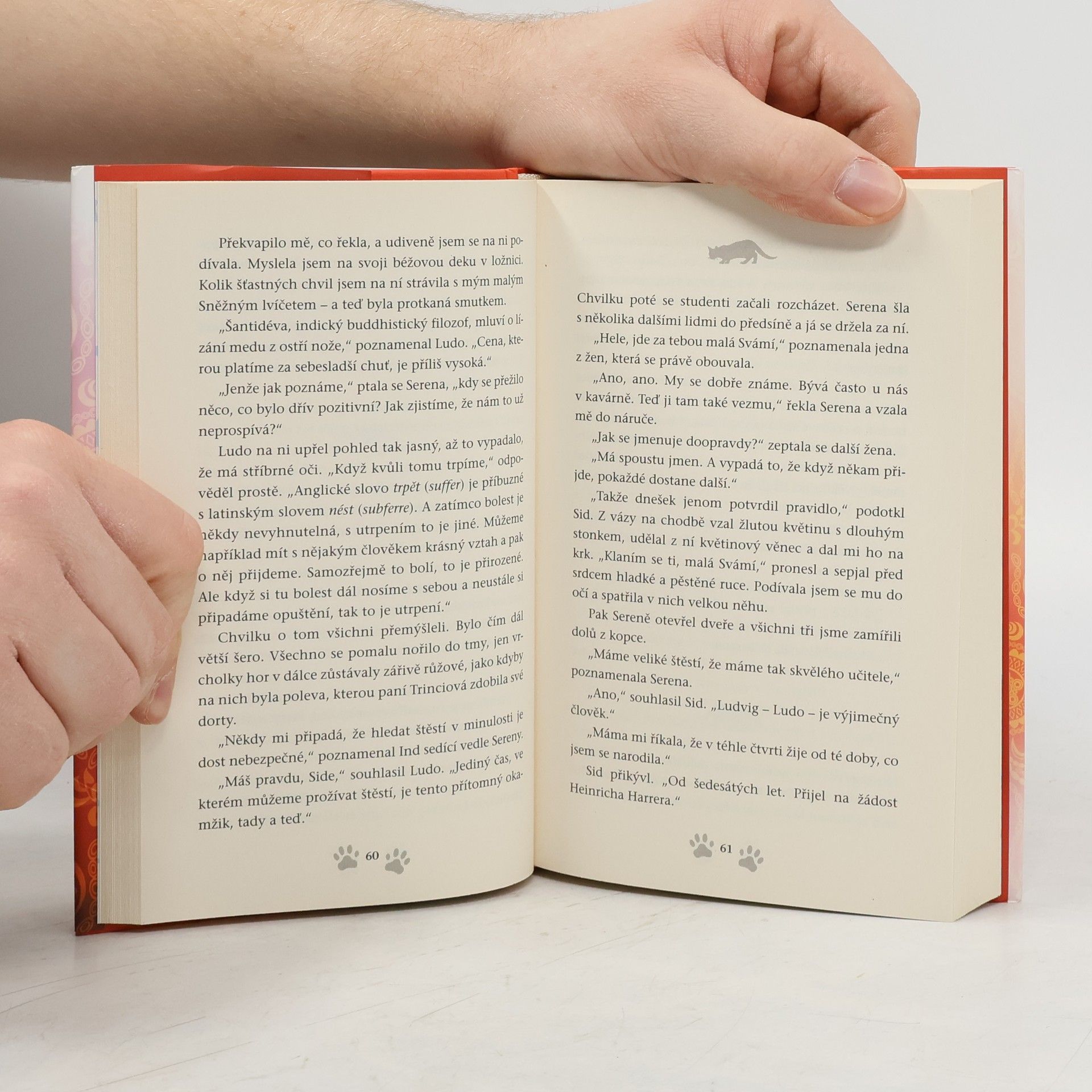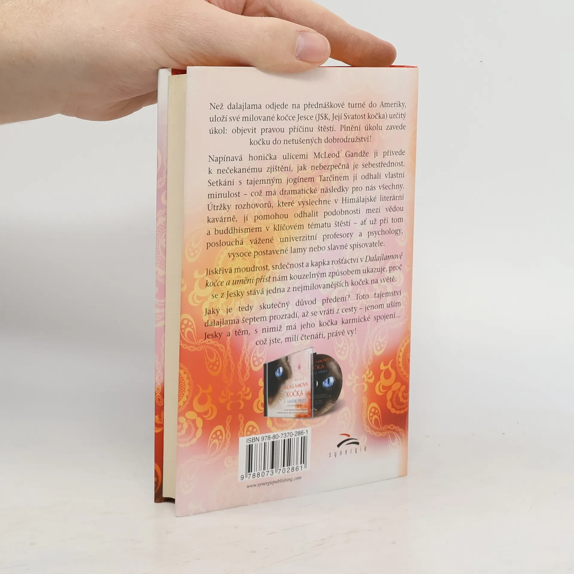 Než dalajlama odjede na přednáškové turné do Ameriky, uloží své milované kočce Jesce (JSK, Její Svatosti Kočce) určitý úkol: objevit pravou příčinu štěstí. Plnění úkolu zavede kočku do netušených dobrodružství! Napínavá honička ulicemi McLeod Gandže ji dovede k nečekanému zjištění o tom, jak je nebezpečná sebestřednost. Setkání s tajemným jogínem Tarčinem jí odhalí vlastní minulost – což má dramatické následky pro nás pro všechny. Útržky rozhovorů, které vyslechne v Himálajské literární kavárně, jí pomůžou odhalit podobnosti mezi vědou a buddhismem v klíčovém tématu štěstí – ať už při tom poslouchá vážené univerzitní profesory a psychology, vysoce postavené lamy nebo slavné spisovatele.Jiskřivá moudrost, srdečnost a kapka rošťáctví v Dalajlamově kočce a umění příst nám kouzelným způsobem ukazuje, proč se z Jesky stává jedna z nejmilovanějších koček na světě. Jaký je tedy skutečný důvod předení? Toto tajemství dalajlama šeptem prozradí, až se vrátí z cesty – jenom uším Jesky a těm, s nimiž má jeho kočka karmické spojení… což jste, milí čtenáři, právě vy! Tato knížka je volným pokračováním knížky Dalajlamova kočka.