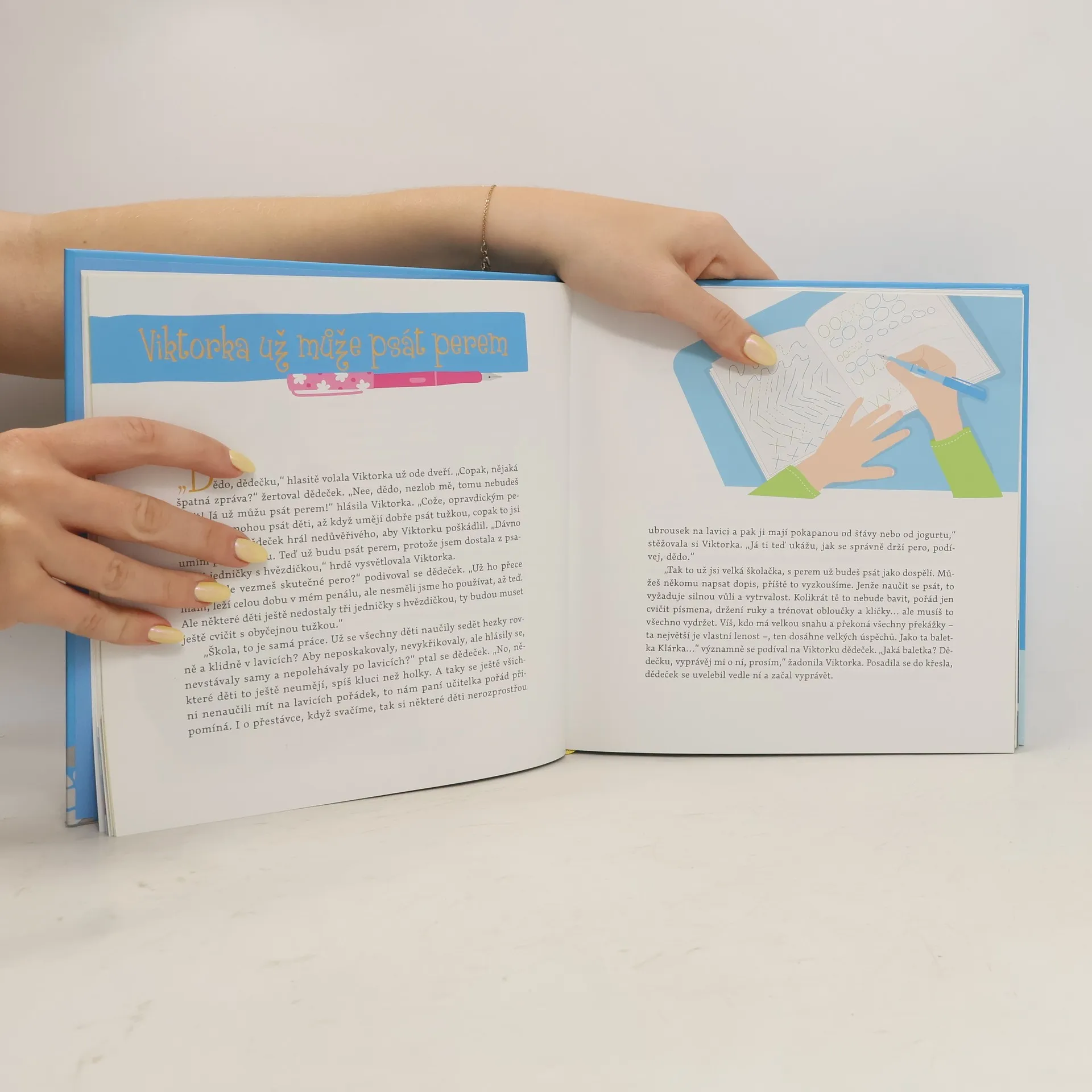 Dědečku, už chodím do školy je dalším pokračováním oblíbené série knížek Dědečku, vyprávěj a Dědečku, ještě vyprávěj. Laskavý dědeček si opět povídá se svou zvídavou vnučkou Viktorkou o světě kolem nich. Viktorka už je ovšem školačka, chodí do první třídy, a proto si přináší spoustu nových podnětů a otázek ze školního prostředí. Knížka pomůže rodičům v touze rozvíjet dobré vlastnosti jejich dětí, vštěpovat jim mravní hodnoty současného světa, pěstovat v nich silnou vůli, vytvářet správné návyky chování mezi lidmi a v různých situacích, které Viktorku potkávají. Děti si ji tak při poslechu mohou podle obrázků „číst“ samy, ty starší si pak knihu s dědečkem budou číst společně.