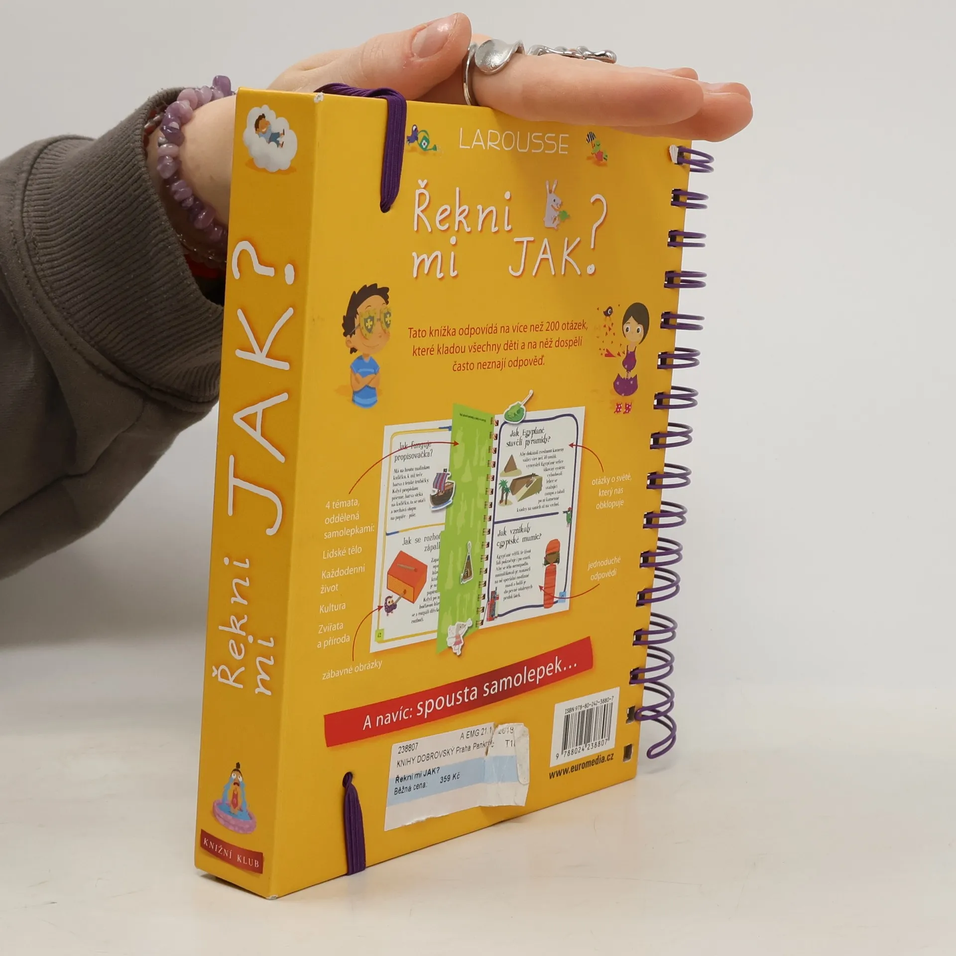 Další z úspěšných encyklopedií pro nejmenší obsahuje odpovědi na více než 200 běžných dětských otázek. Jsou seřazené podle témat do čtyř velkých oblastí: lidské tělo, každodenní život, kultura, zvířata a příroda. Dozvíte se například, jak dýchají rostliny, jak funguje klavír, jak se léčí zubní kazy, jak se dělá čokoláda, jak se jedlo ve středověku a spoustu, spoustu dalšího. Každou tematickou kapitolu doplňují samolepky a veselé obrázky.