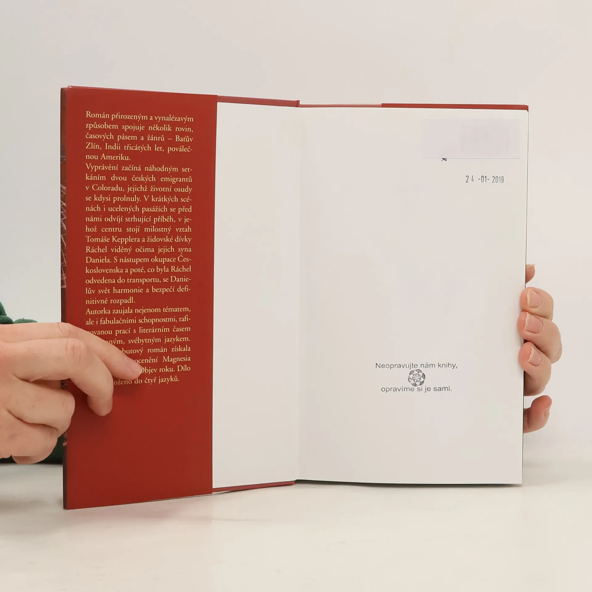 Román přirozeným a vynalézavým způsobem spojuje několik rovin, časových pásem a žánrů - Baťův Zlín, Indii třicátých let, poválečnou Ameriku. Vyprávění začíná náhodným setkáním dvou českých emigrantů v Coloradu, jejichž životní osudy se kdysi prolnuly. V krátkých scénách i ucelených pasážích se před námi odvíjí strhující příběh, v jehož centru stojí milostný vztah Tomáše Kepplera a židovské dívky Ráchel viděný očima jejich syna Daniela. S nástupem okupace Československa a poté, co byla Ráchel odvedena do transportu, se Danielův svět harmonie a bezpečí definitivně rozpadl. Autorka zaujala nejenom tématem, ale i fabulačními schopnostmi, rafinovanou prací s literárním časem a výrazným, svébytným jazykem. Za svůj debutový román získala v roce 2002 ocenění Magnesia Litera v kategorii Objev roku. Dílo bylo přeloženo do čtyř jazyků.