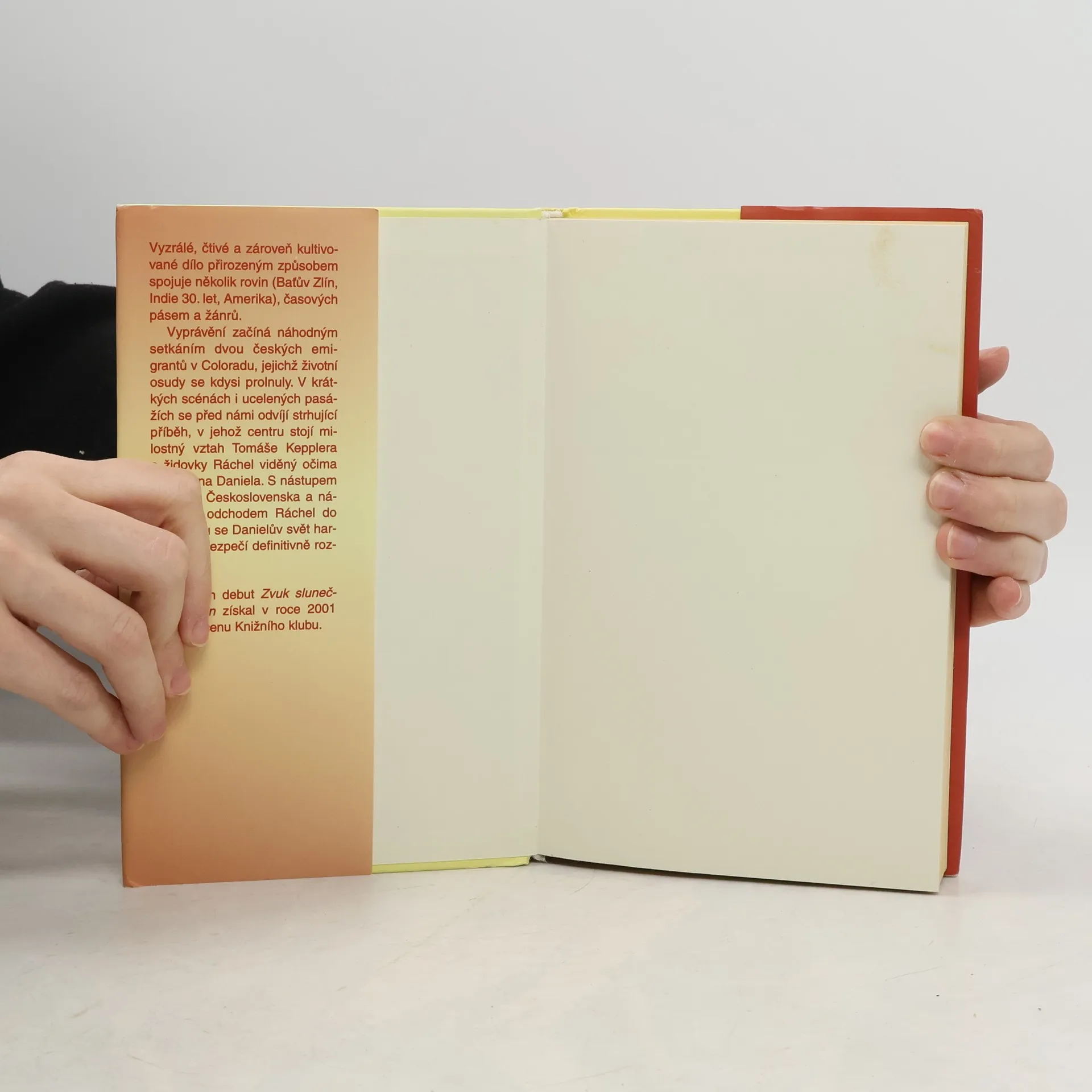 Debutový román Hany Andronikové spojuje několik časových rovin – Prahu v době okupace nacisty, Baťův Zlín, Indii třicátých let 20. století a americké Colorado „současnosti“. Ústředním motivem je příběh Tomáše Kepplera, za první republiky pracujícího pro firmu Baťa, a jeho ženy Rachel, židovské dívky, viděný jejich synem Danielem. Daniel po 2. světové válce emigroval do Spojených států amerických, kde se v Coloradu, v předvečer silvestrovské noci, setkal s majitelkou hotelu, starší ženou Anne, jež poté, co přežila koncentrační tábory Terezín a Osvětim, opustila Československo. Oba nečekaně zjišťují, že se jejich životní osudy v minulosti velmi prolnuly. Hana Andronikova za tento román získala Literární cenu Knižního klubu (2001) a cenu Magnesia Litera v kategorii Objev roku (2002). Dílo bylo přeloženo do čtyř jazyků.... celý text