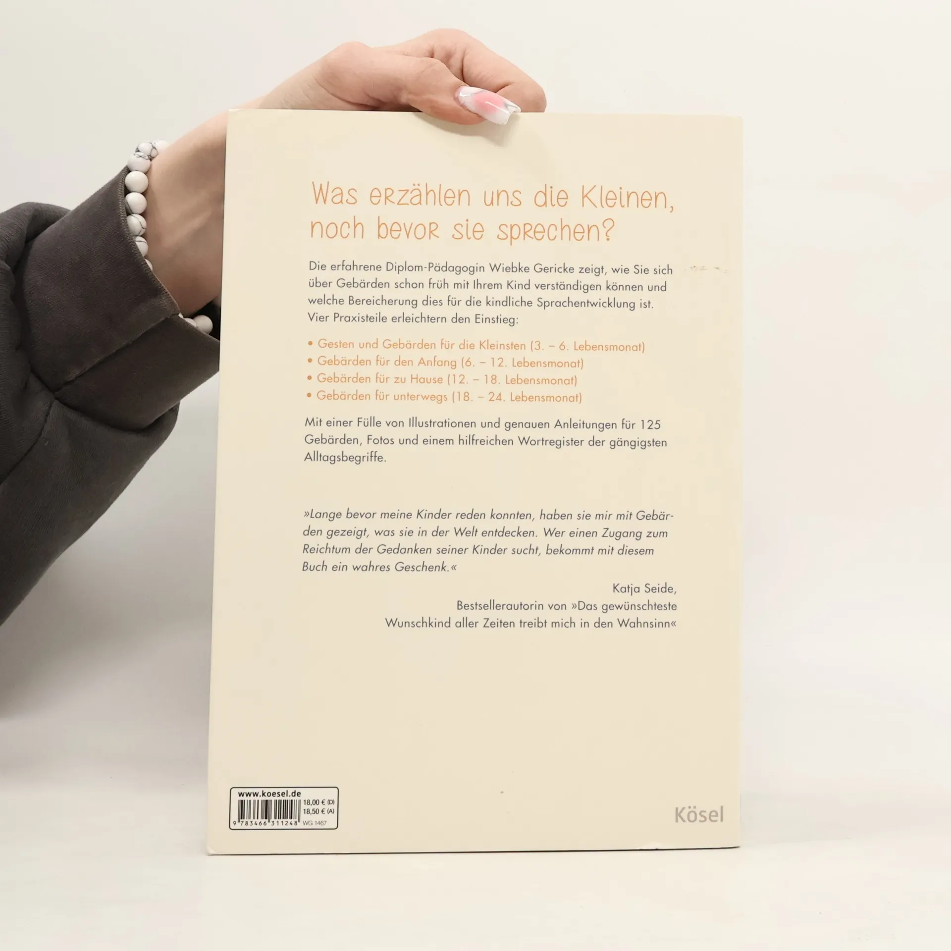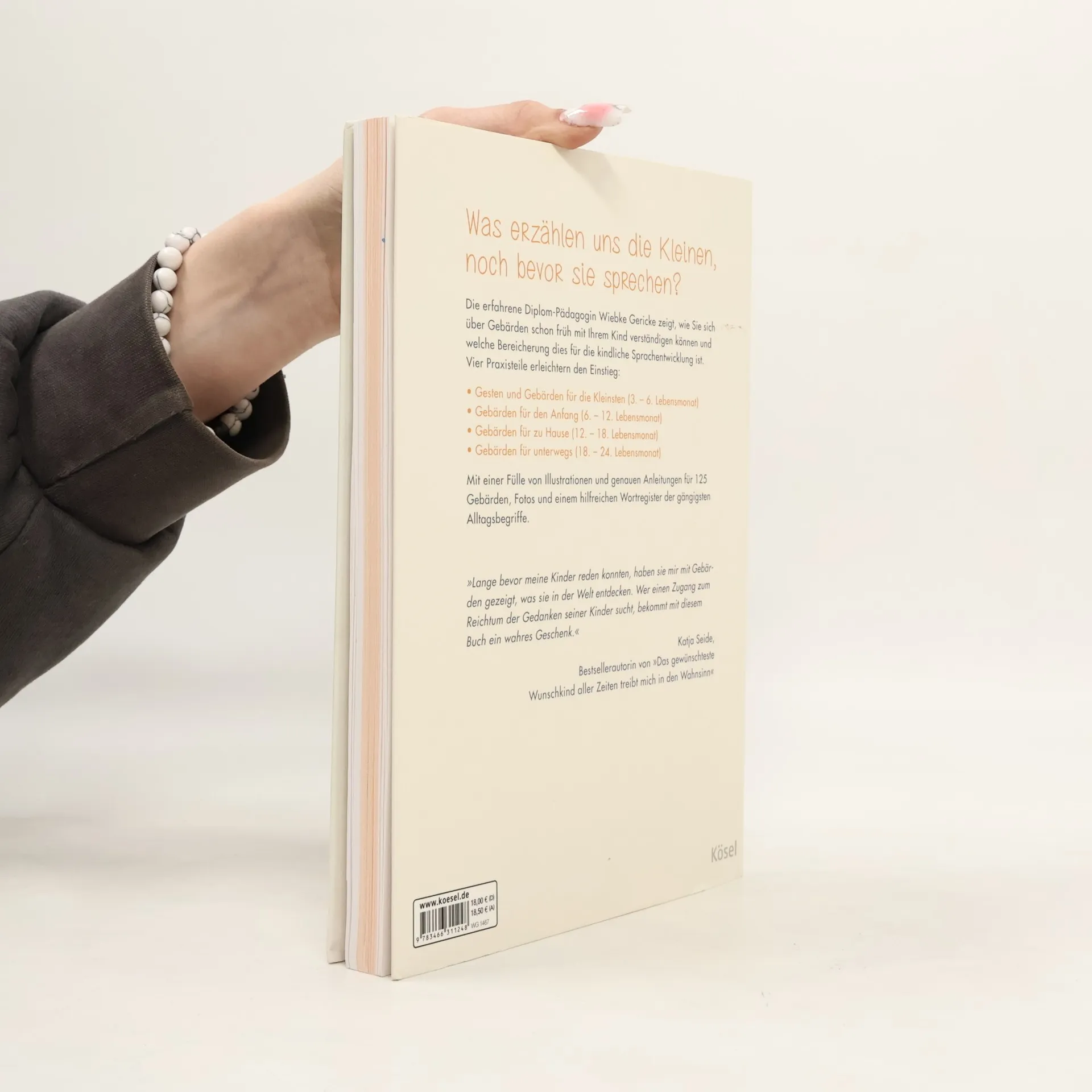 Mit dem Baby kommunizieren, bevor es sprechen kann Was erzählen uns die Kleinen, noch bevor sie sprechen? Dieses Praxisbuch zeigt Eltern das Wichtigste über Babygebärden und wie sie diese konkret und spielerisch mit ihrem Kind im Alltag praktizieren können. Es enthält eine Fülle von Zeichnungen mit genauen Gebärden-Anleitungen, vielen Fotos und ein hilfreiches Wortregister mit den gängigsten Alltagsbegriffen. Für Eltern und pädagogische Fachkräfte Gute Verständigung im Alltag mit Kindern zwischen 3 Monaten und 3 Jahren Der erfolgreiche Longseller mit jetzt insgesamt 125 Gebärden Ausstattung: Durchgehend zweifarbig mit Fotos von Knut Gärtner