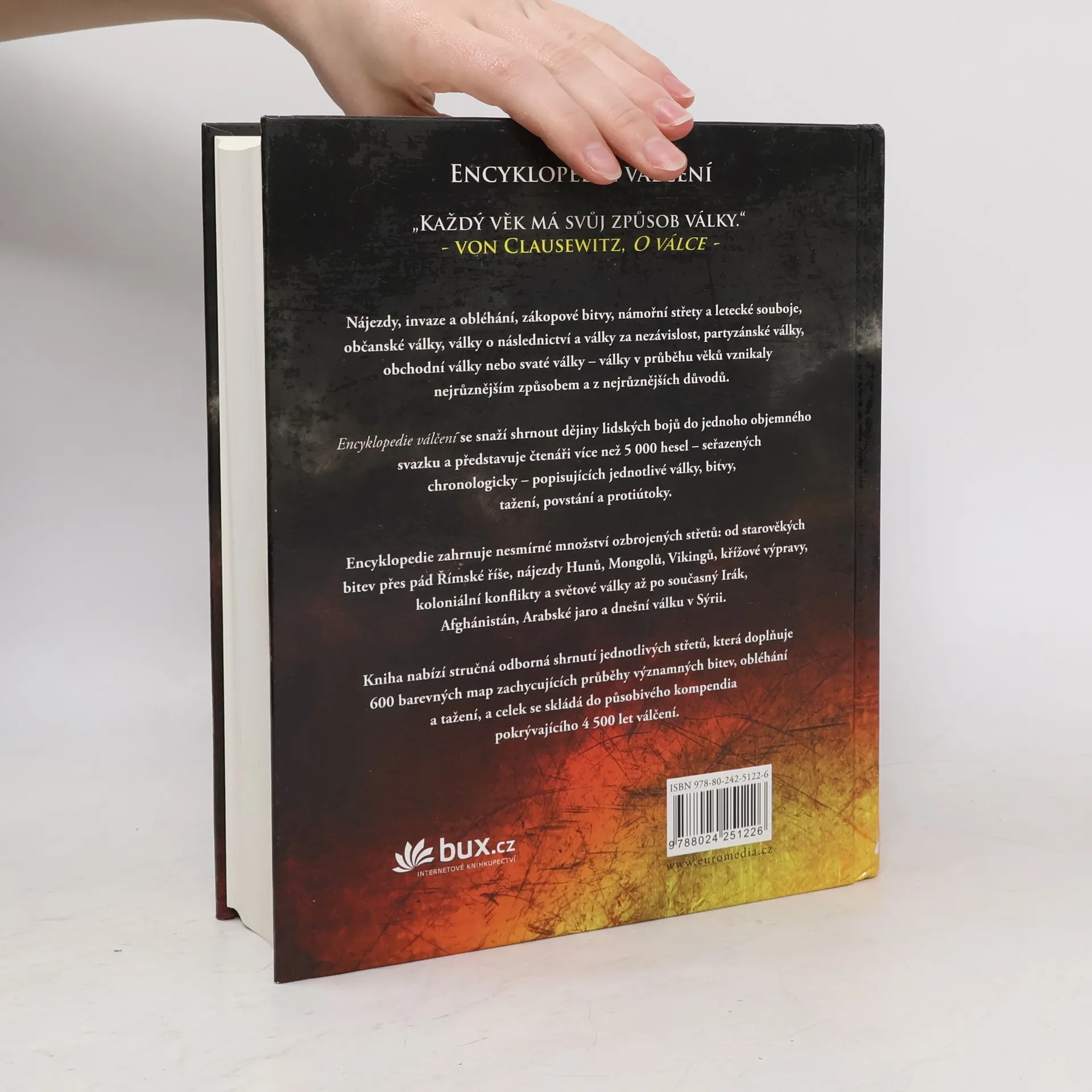 Věcná, textově bohatá encyklopedie válek, od starověku přes nájezdy, invaze a obléhání, zákopové války, námořní bitvy a letecké souboje, občanské války, guerrilové války, obchodní války a jadernou válku, náboženské války, války o následnictví či nezávislost. Obsahuje víc než 5 000 chronologicky řazených hesel o válkách, bitvách, ofenzivách, taženích, povstáních a protireakcích. 600 barevných map. Odráží současné studie vojenských historiků a je přístupná jak studentům, tak obecné veřejnosti. Kompendium téměř pěti tisíc let válčení.