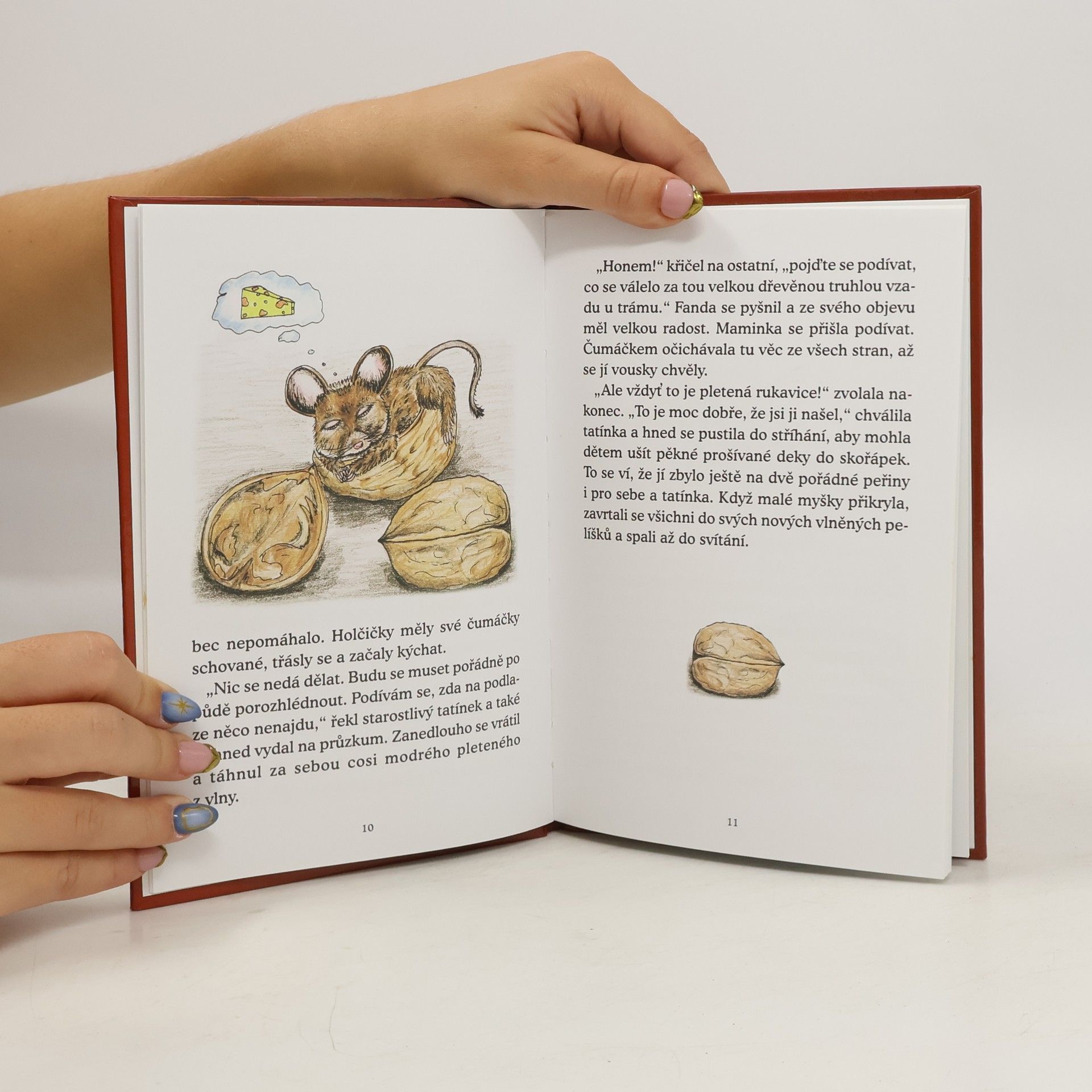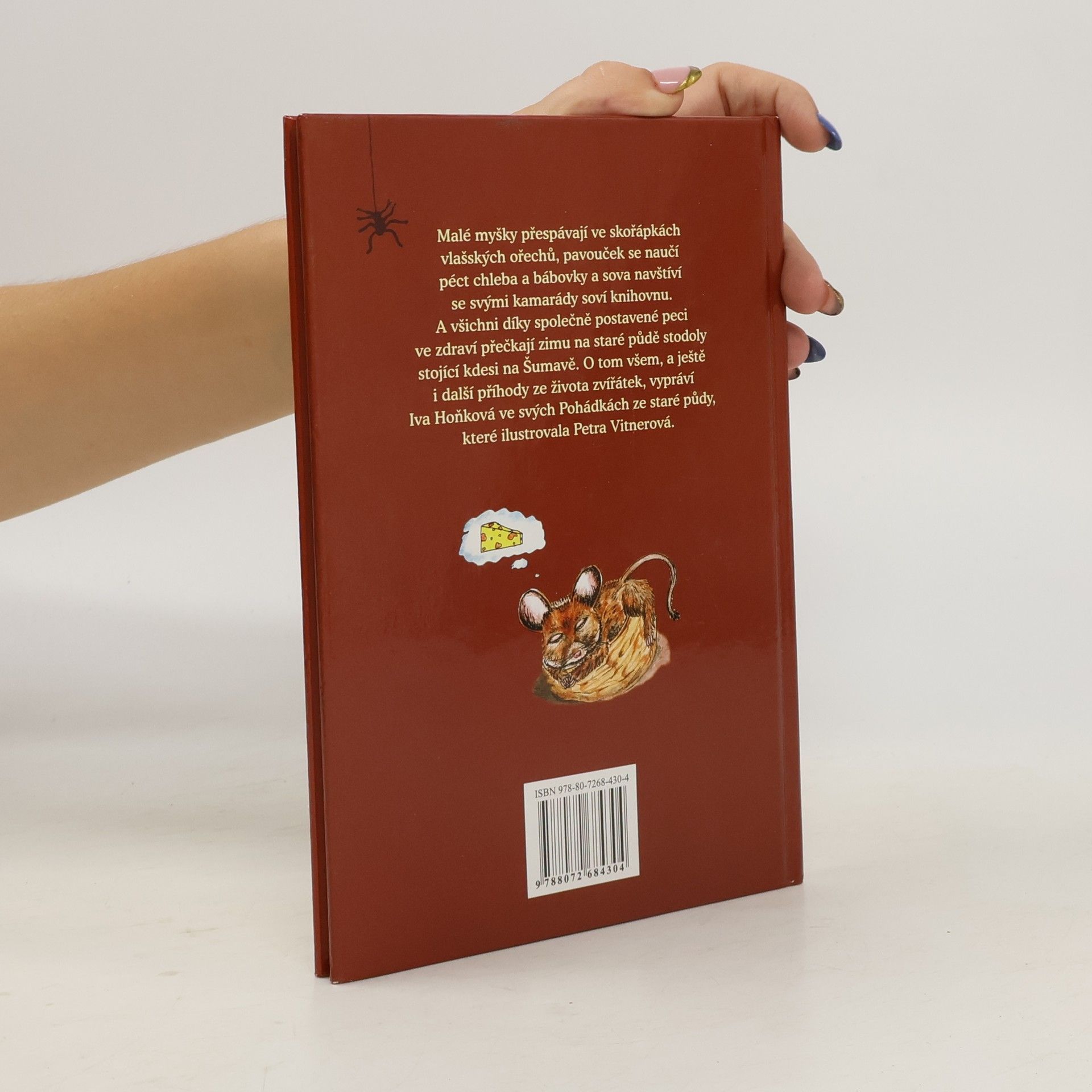 Malé myšky přespávají ve skořápkách ořechů, pavouček se naučí péct chleba a bábovky a sova navštíví se svými kamarády soví knihovnu. O tom všem, a ještě další příhody zvířátek, která žijí na staré půdě stodoly stojící kdesi na Šumavě, jsou pohádky v této knížce.