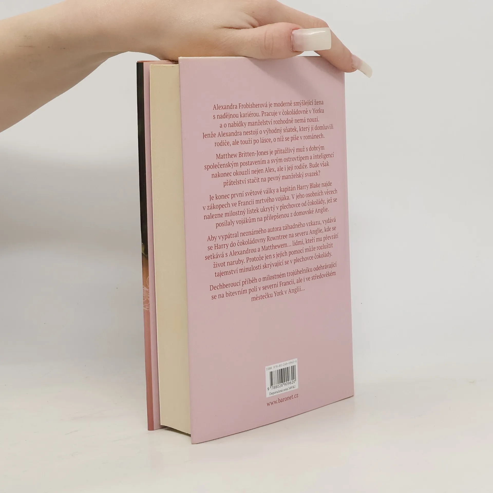 Alexandra Frobisherová je moderně smýšlející žena s nadějnou kariérou. Pracuje v čokoládovně v Yorku a o nabídky manželství rozhodně nemá nouzi. Jenže Alexandra nestojí o výhodný sňatek, který jí domluvili rodiče, ale touží po lásce, o níž se píše v románech. Matthew Britten-Jones je přitažlivý muž s dobrým společenským postavením a svým ostrovtipem a inteligencí nakonec okouzlí nejen Alex, ale i její rodiče. Bude však přátelství stačit na pevný manželský svazek? Je konec první světové války a kapitán Harry Blakeney najde v zákopech ve Francii mrtvého vojáka. V jeho osobních věcech objeví milostný lístek ukrytý v plechovce od čokolády, jaké se posílali vojákům na přilepšenou z domovské Anglie. Aby vypátral neznámého autora záhadného vzkazu, vydává se Harry do čokoládovny Rowntree na severu Anglie, kde se setkává s Alexandrou a Matthewem… lidmi, kteří mu převrátí život naruby. Protože jen s jejich pomocí může rozluštit tajemství minulosti skrývající se v plechovce čokolády. Dechberoucí příběh o milostném trojúhelníku odehrávající se na bitevním poli v severní Francii, ale i ve středověkém městečku York v Anglii…