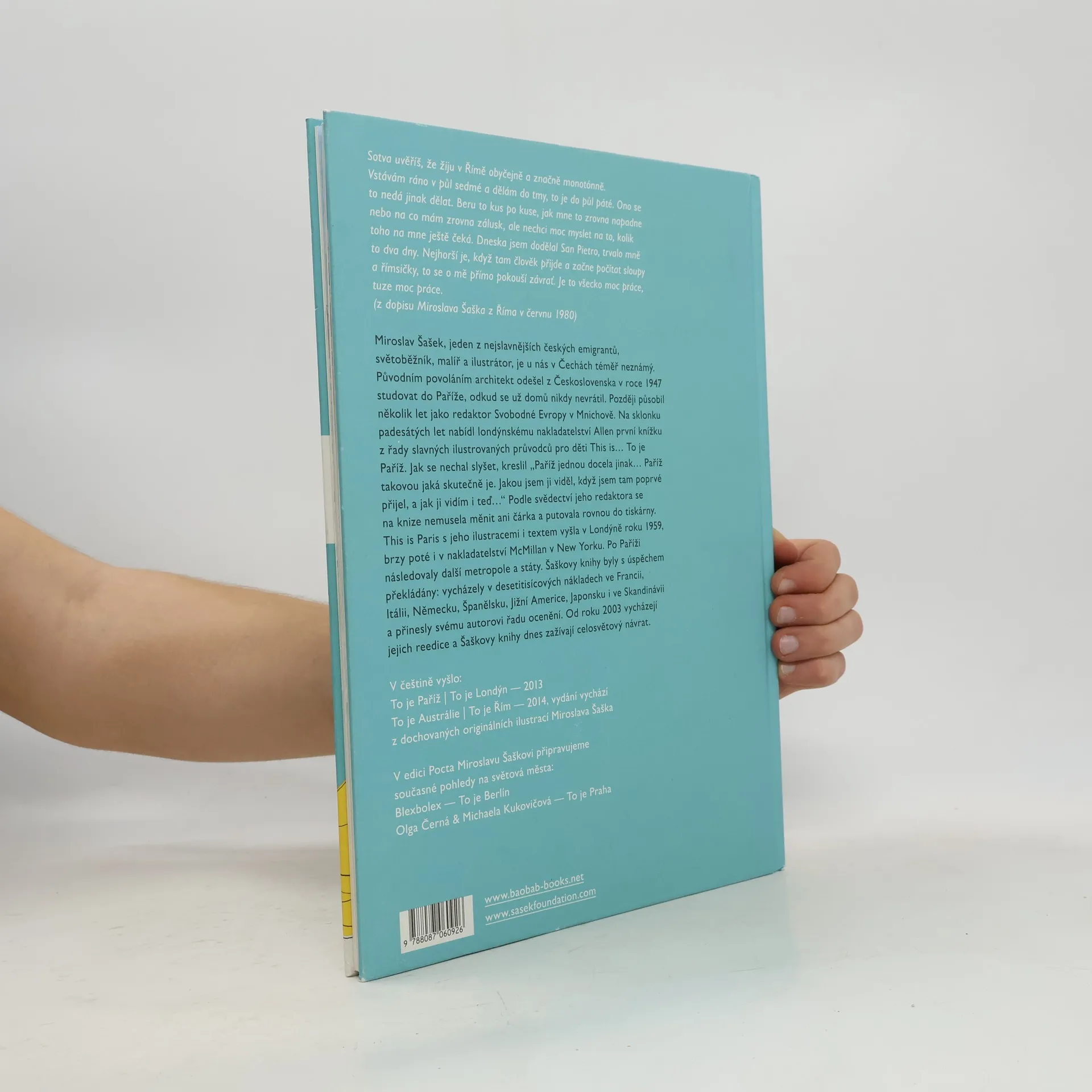 Věčným městem, kolébkou antiky, příbytkem králů, císařů i papežů nás Šašek provádí - jako obvykle - s humorem i poetickou zkratkou. Zachycuje Řím takový, jaký byl před více než čtyřiceti lety a jaký je i dnes: jižanská atmosféra ulic a náměstí, Italové na mopedech, neutuchající automobilové šílenství a všudypřítomné davy zvědavých turistů. Dokázal však vyhmátnout to nejpodstatnější z římských pamětihodností a míst a uspořádat je v jednoduché a funkční procházky. V Římě, v tom chaotickém a divukrásném městě, kde se protínají dějiny, a které patří k nejnavštěvovanějším metropolím světa, s Miroslavem Šaškem rozhodně nezabloudíte.