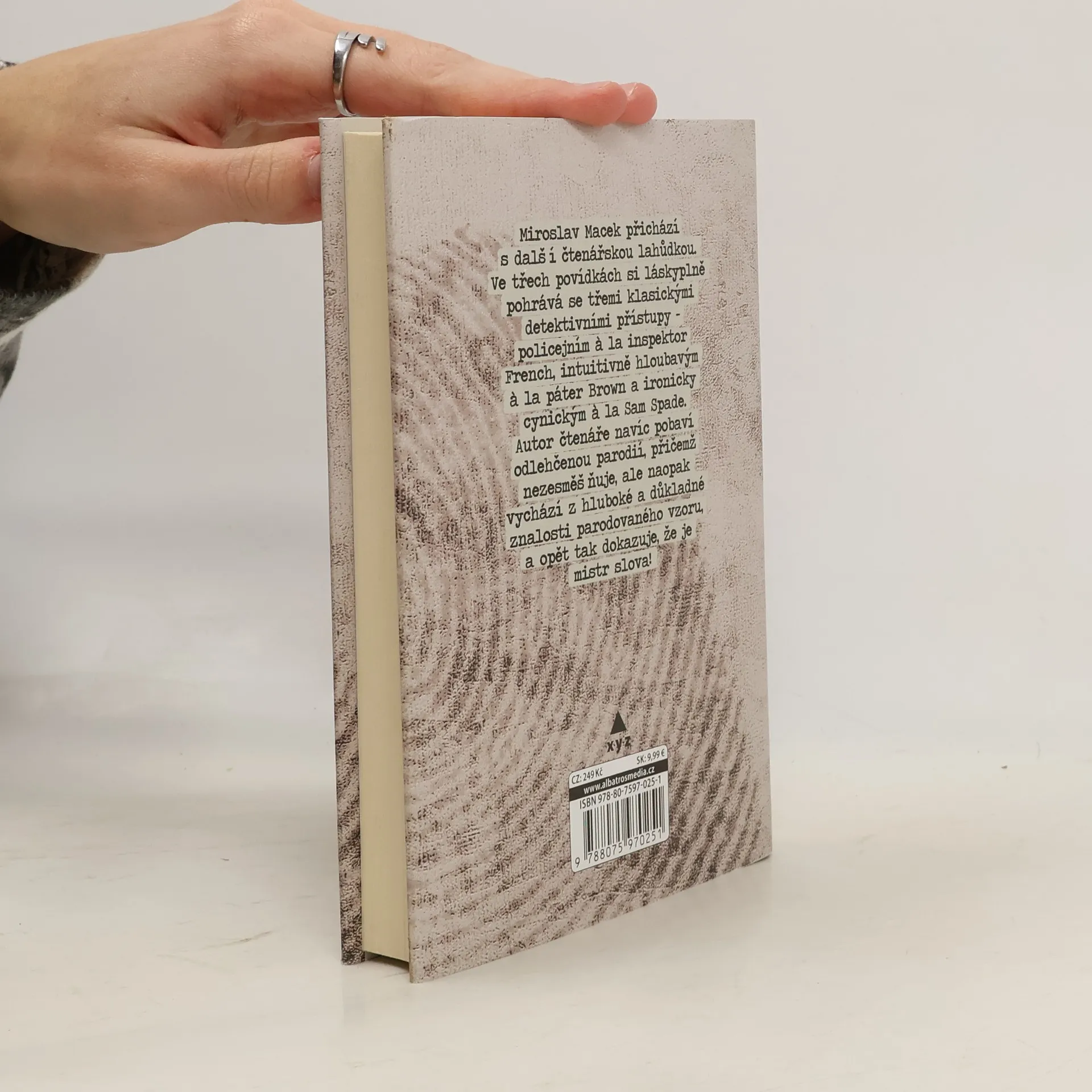 Miroslav Macek přichází s další čtenářskou lahůdkou. Ve třech povídkách si láskyplně pohrává se třemi klasickými detektivními přístupy – policejním a la inspektor French, intuitivně hloubavým a la páter Brown a ironicky cynickým a la Sam Spade. Autor čtenáře navíc pobaví odlehčenou parodií, přičemž nezesměšňuje, ale naopak vychází z hluboké a důkladné znalosti parodovaného vzoru, a opět tak dokazuje, že je mistr slova!