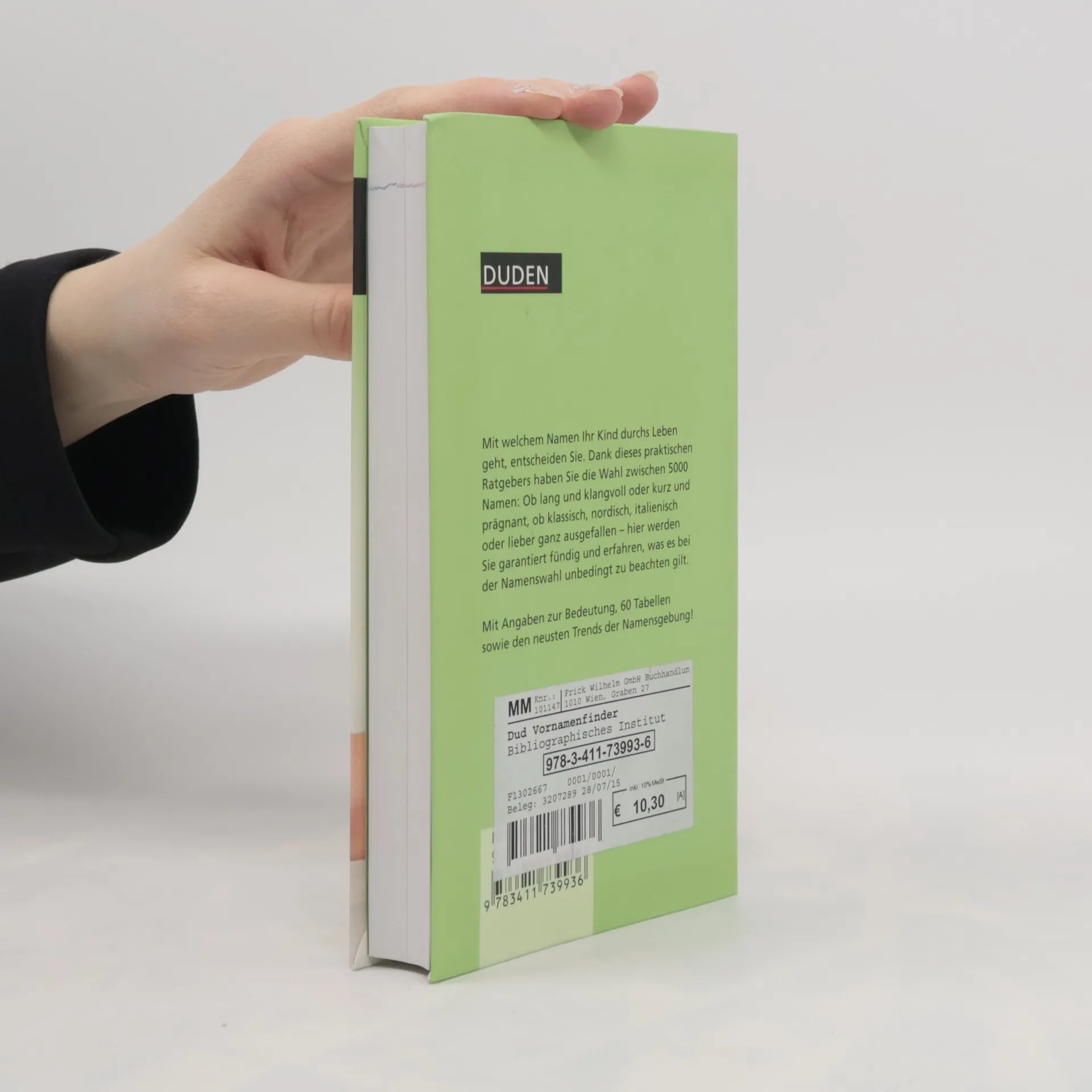 Mit Erfolg zum richtigen Namen! Der Vornamenfinder von Duden ist die kompetente Hilfe bei der Namensuche. Mehr als 5.000 Vornamen, darunter rund 100 neue Einträge, werden mit kurzen und prägnanten Angaben zu Bedeutung und Herkunft vorgestellt. Tipps zur Namenwahl und zahlreiche Tabellen, u. a. zu den schönsten russischen oder spanischen Namen, den schönsten klassischen Namen, den Namen mit der Bedeutung „glücklich“, vervollständigen den Inhalt.