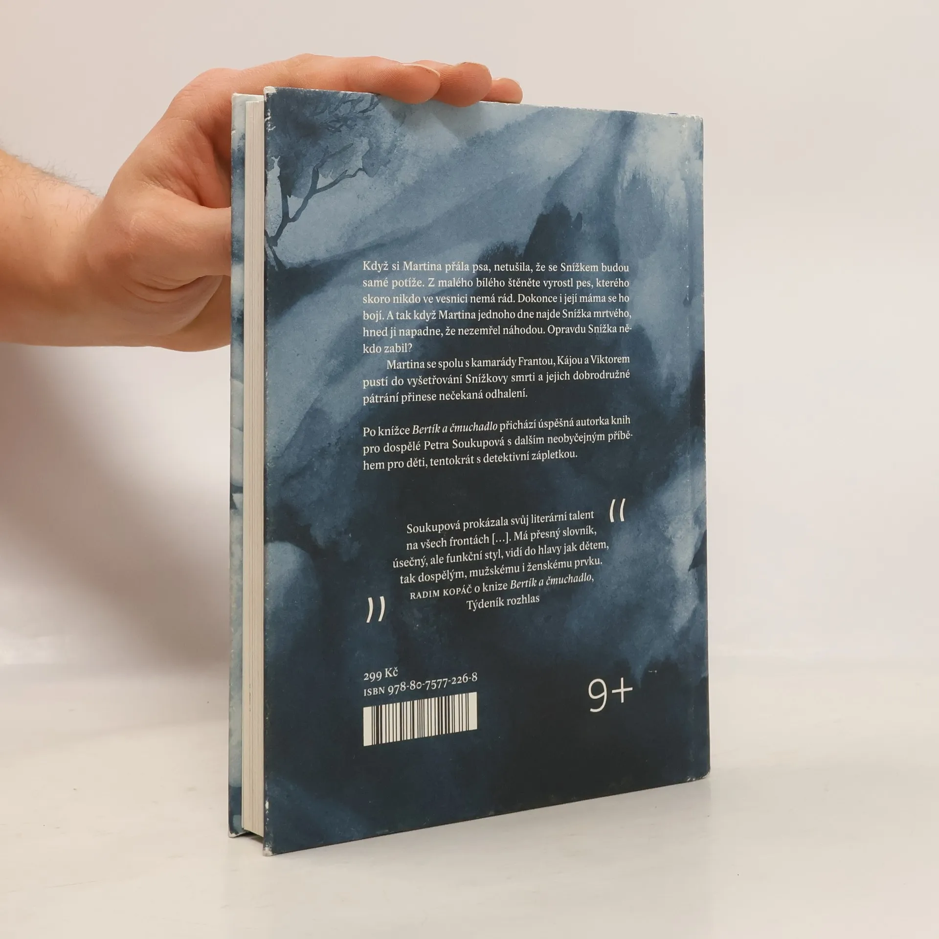 Když si Martina přála psa, netušila, že se Snížkem budou samé potíže. Z malého bílého štěněte vyrostl pes, kterého skoro nikdo ve vesnici nemá rád. Dokonce i její máma se ho bojí. A tak když Martina jednoho dne najde Snížka mrtvého, hned ji napadne, že nezemřel náhodou. Opravdu Snížka někdo zabil? Martina se spolu s kamarády Frantou, Kájou a Viktorem pustí do vyšetřování Snížkovy smrti a jejich dobrodružné pátrání přinese nečekaná odhalení. Po knížce Bertík a čmuchadlo přichází úspěšná autorka knih pro dospělé Petra Soukupová s dalším neobyčejným příběhem pro děti, tentokrát s detektivní zápletkou.