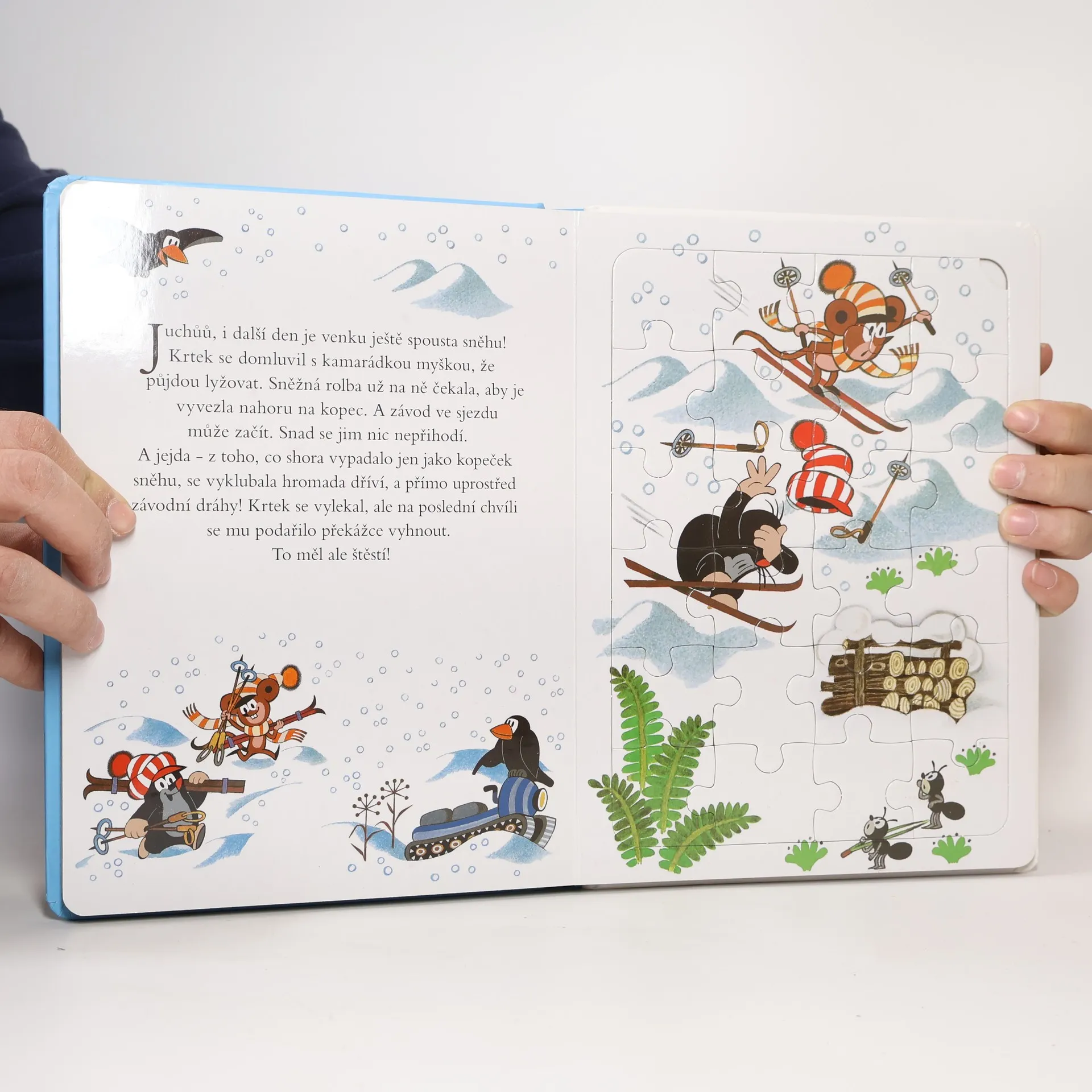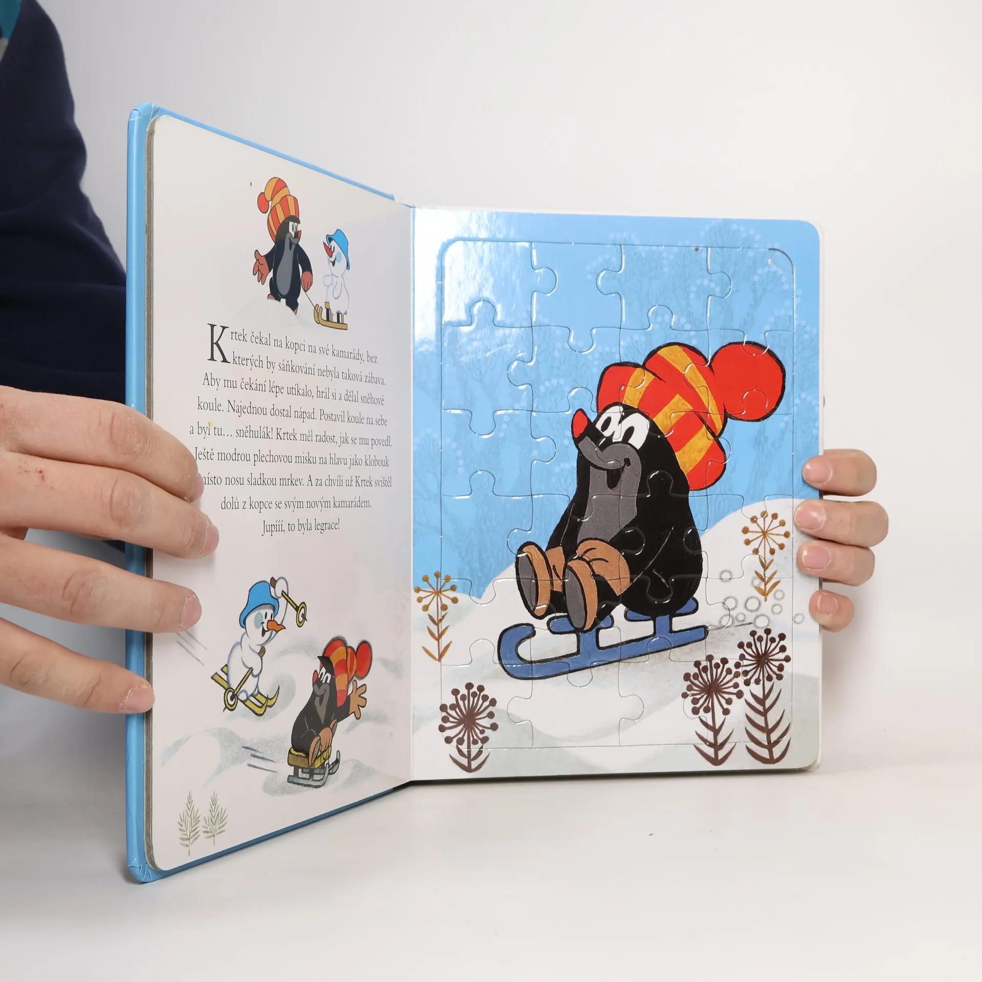 Kniha plná veselých skládaček potěší všechny malé děti. Začala zima a Krtek si ji užívá plnými doušky. Lyžuje, sáňkuje a dokonce si ze sněhu postaví nového kamaráda. S ostatními zvířátky z lesa krásně ozdobí stromeček a oslaví Vánoce. Kniha obsahuje 5 skládaček s 24 dílky.