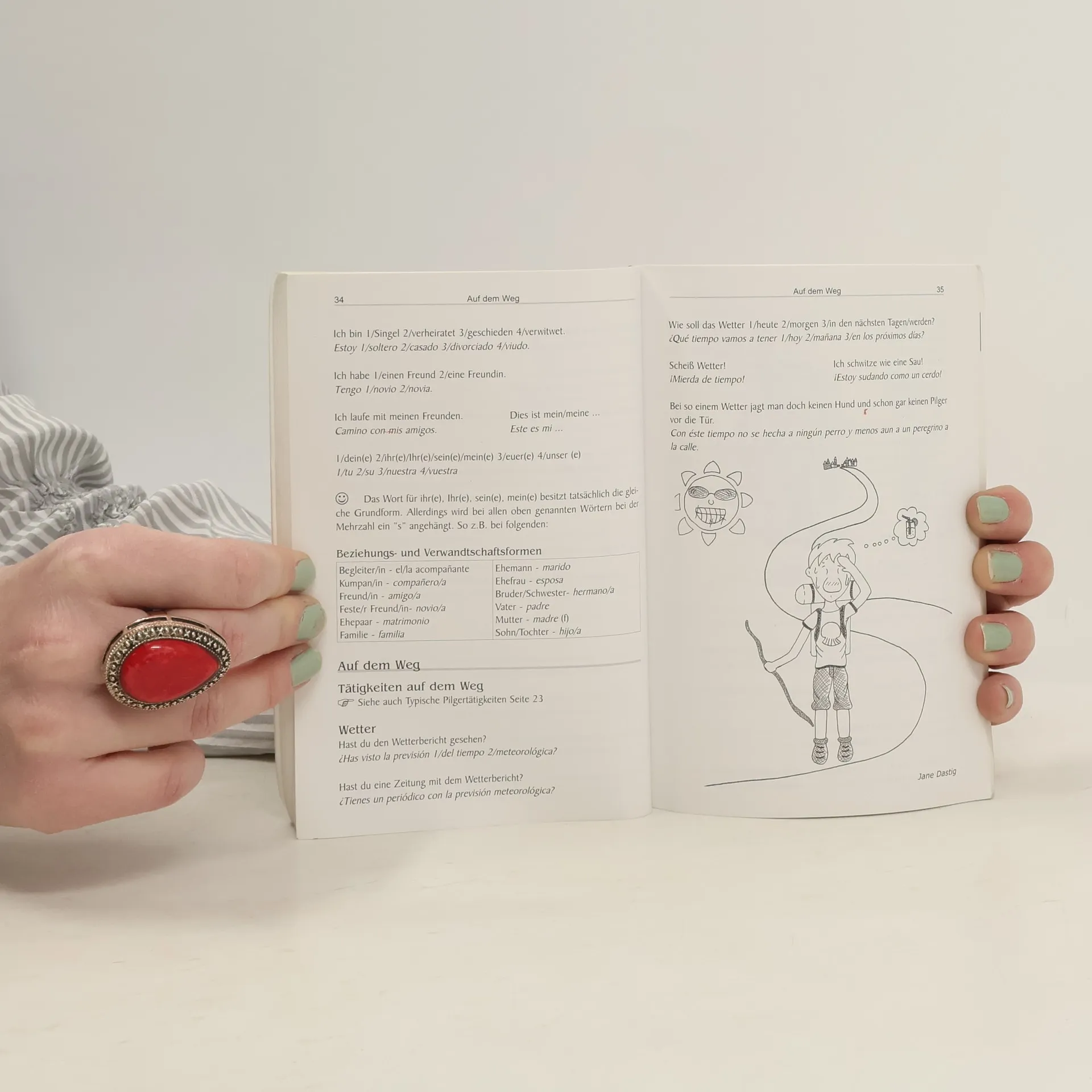 Dieser kleine Sprachführer hilft Ihnen, sich in den besonderen für Pilger typischen Situationen korrekt auf Spanisch verständlich zu machen und bahnt Ihnen darüber hinaus auch mit einer sympathischen Portion Humor den Weg in die heißblütigen Herzen der Menschen des Gastgeberlandes Spanien. Mit nur wenigen Worten auf Baskisch und Galicisch werden Sie in den abgelegensten Dörfern für freudig überraschte Passanten am Wegrand sorgen und auch wer seinen Pilgerbrüdern oder -schwestern aus aller Welt in deren Heimatsprache begrüßen oder seine Liebe gestehen will, findet hier genau die wenigen treffenden Worte dafür. Das vorliegende Handbuch wurde von dem Jakobswegautor Raimund Joos in Zusammenarbeit mit Pilgerfreunden aus den verschiedenen Regionen Spaniens aber auch aus England, Frankreich, Italien, Portugal und den Niederlanden verfasst. Er ist ganz im Sinne der internationalen Kultur des Jakobsweges, vielleicht der erste mehrsprachige Sprachführer der Welt, und vergisst dabei auch die so verbindende Sprache des Lachens nicht.