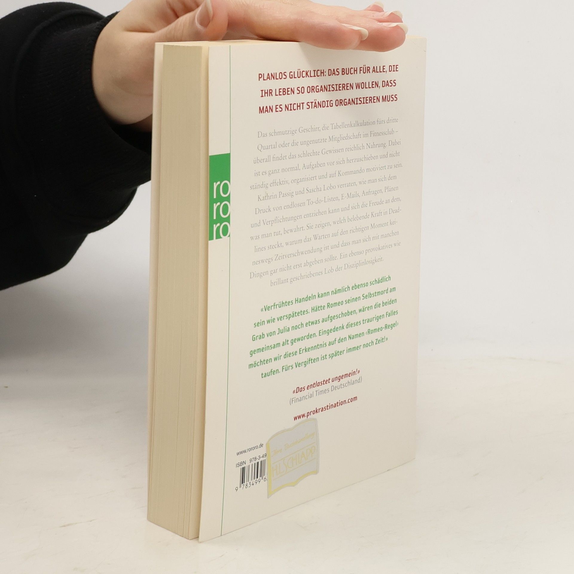 Planlos Glücklich: Das Buch für alle, dieihr Leben so organisieren wollen, dassman es nicht ständig organisieren mussDas schmutzige Geschirr, die Tabellenkalkulation fürs dritte Quartal oder die ungenutzte Mitgliedschaft im Fitnessclub – überall findet das schlechte Gewissen reichlich Nahrung. Dabei ist es ganz normal, Aufgaben vor sich herzuschieben und nicht ständig effektiv, organisiert und auf Kommando motiviert zu sein.Kathrin Passig und Sascha Lobo verraten, wie man sich dem Druck von endlosen To-do-Listen, E-Mails, Anfragen, Plänen und Verpflichtungen entziehen kann und sich die Freude an dem, was man tut, bewahrt. Sie zeigen, welch belebende Kraft in Deadlines steckt, warum das Warten auf den richtigen Moment keineswegs Zeitverschwendung ist und dass man sich mit manchen Dingen gar nicht erst abgeben sollte. Ein ebenso provokatives wie brillant geschriebenes Lob der Disziplinlosigkeit.«Verfrühtes Handeln kann nämlich ebenso schädlichsein wie verspätetes. Hätte Romeo seinen Selbstmord am Grab von Julia noch etwas aufgeschoben, wären die beiden gemeinsam alt geworden. Eingedenk dieses traurigen Falles möchten wir diese Erkenntnis auf den Namen ‹Romeo-Regel› taufen. Fürs Vergiften ist später immer noch Zeit!»«Das entlastet ungemein!»(Financial Times Deutschland)www. prokrastination. com