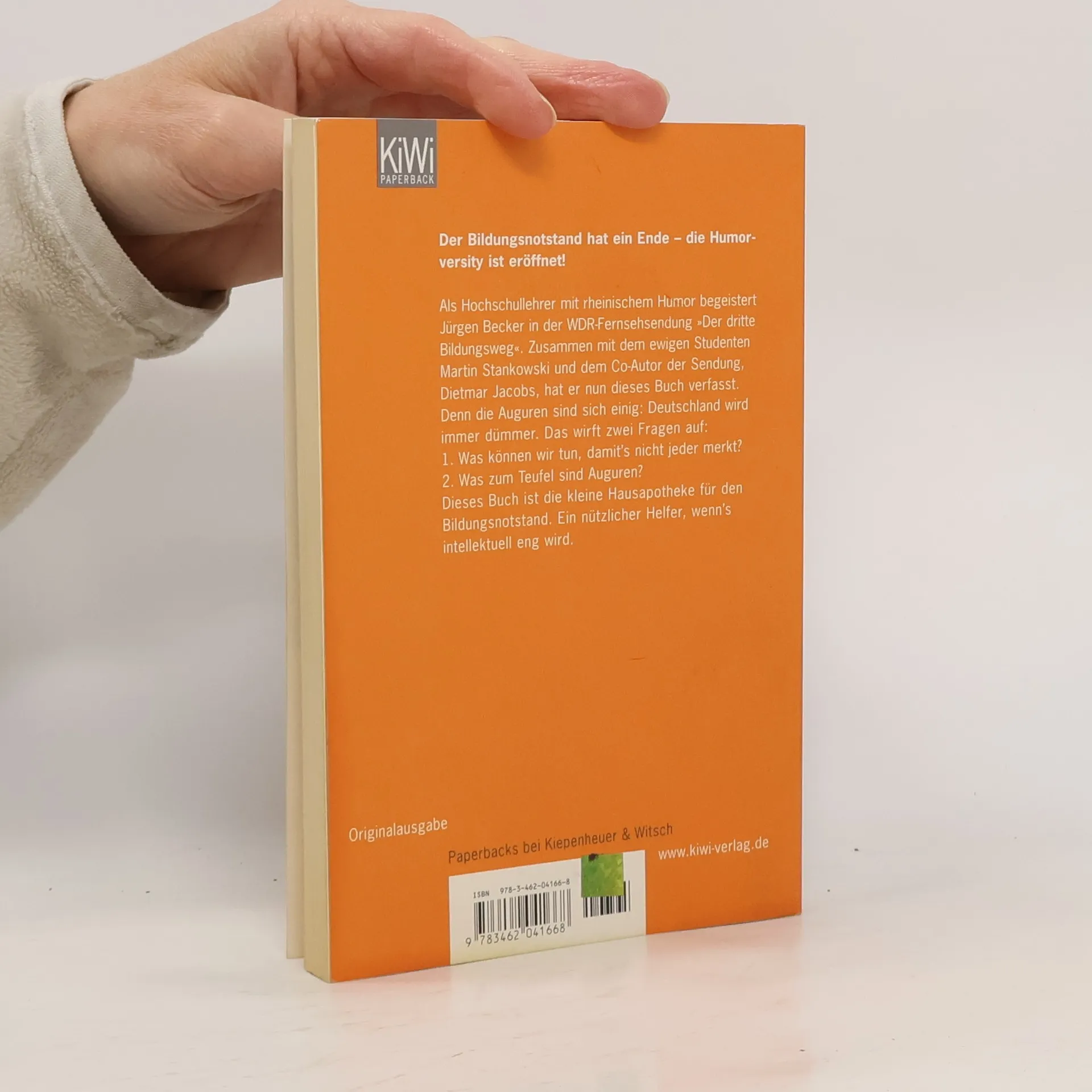 Der Bildungsnotstand hat ein Ende – die Humorversity ist eröffnet! Jürgen Becker, Hochschullehrer mit rheinischem Humor, begeistert in der WDR-Fernsehsendung »Der dritte Bildungsweg«. Gemeinsam mit dem ewigen Studenten Martin Stankowski und Co-Autor Dietmar Jacobs hat er dieses Buch verfasst, während sie ab September 2009 auf Tour gehen. Experten sind sich einig: Deutschland wird immer dümmer. Das wirft zwei Fragen auf: 1. Was können wir tun, damit’s nicht jeder merkt? 2. Was sind Auguren? In Bewerbungsgesprächen, in der Familie oder beim Anbaggern ist es wichtig, bildungsmäßig nicht hinten anzustehen. Wenn der Papst von »Eros und Agape« spricht, ist es besser, nicht zu denken, das sei ein Gesangsduo, sondern zu wissen: Eros ist ein römischer Gott und Agape eine Pflanze für Tequila. Dieses Buch ist die kleine Hausapotheke für den Bildungsnotstand und ein nützlicher Helfer, wenn’s intellektuell eng wird. Warum sind Flitzer peinlich? Wie kam das Lachen in die Kultur? Becker zeigt in seiner Sendung, wie man mit Witz und Humor Bildung und Halbbildung vermittelt. Hier führt er das fort, beleuchtet zahlreiche Themen des Weltwissens, liefert neue Fakten und erklärt Zusammenhänge, wo es bislang keine gab. Getreu dem Motto: Man muss nicht alles verstanden haben, aber alles erklären können!