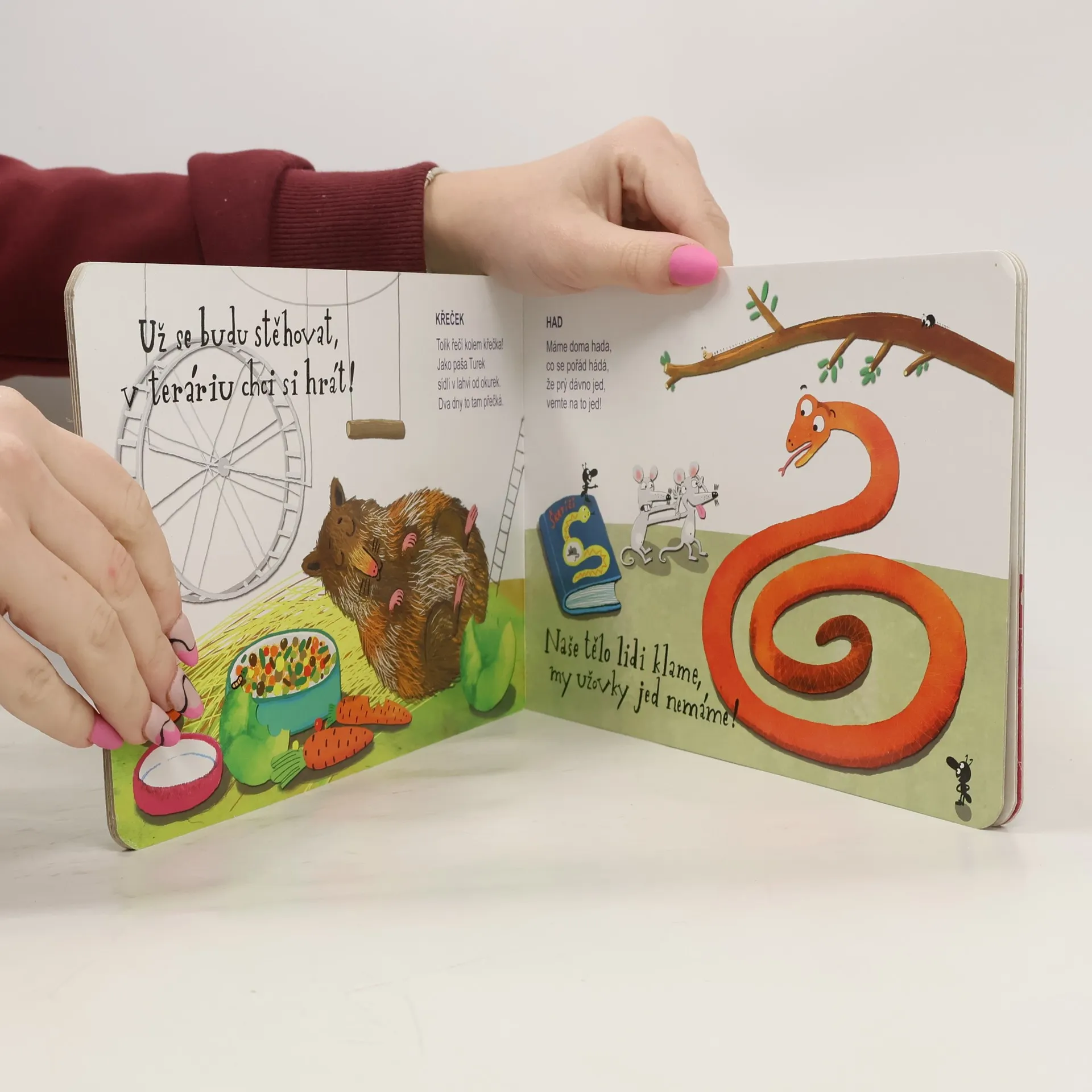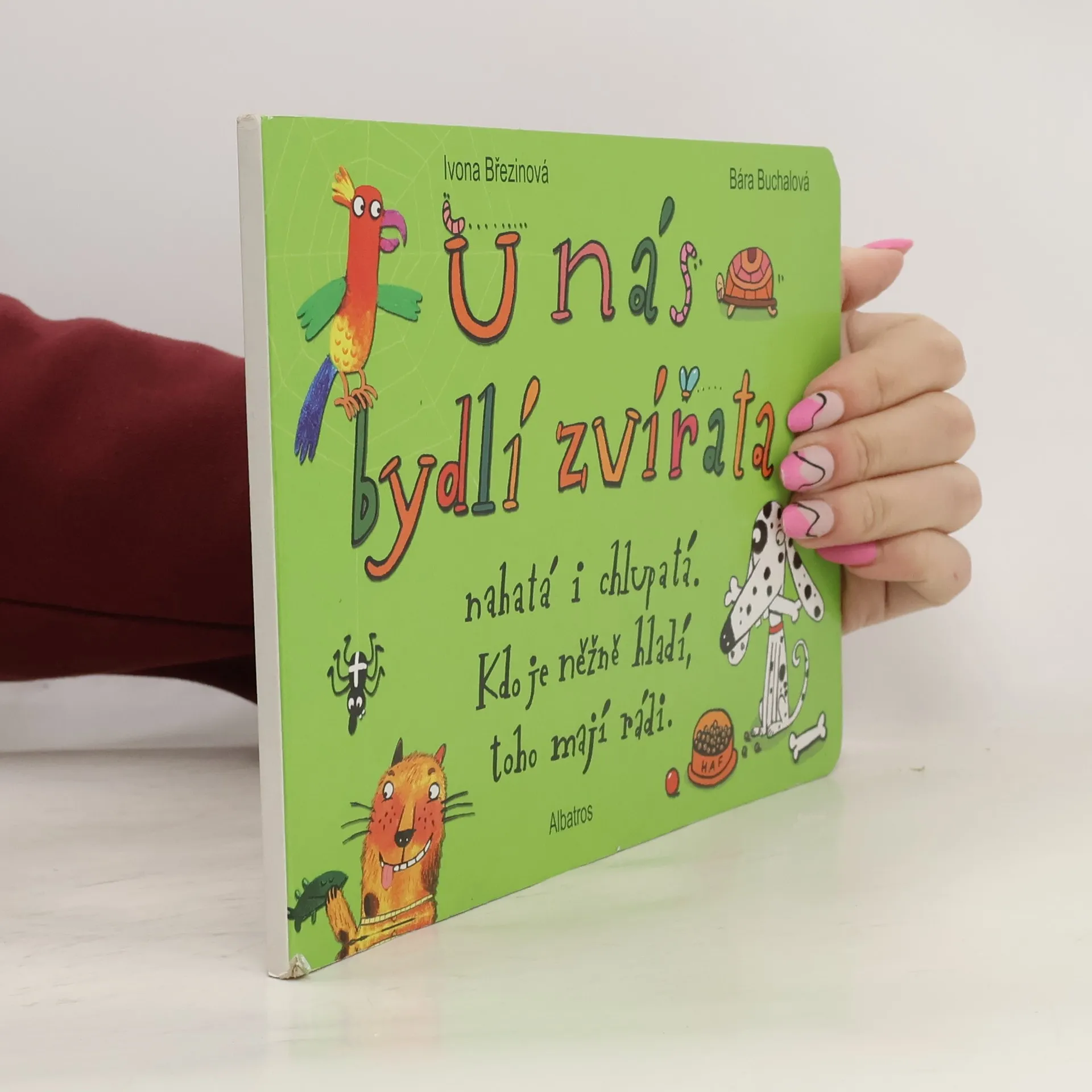 U nás bydlí zvířata nahatá i chlupatá. Kdo je něžně hladí, toho mají rádi. Veselé veršované leporelo Ivony Březinové o zvířatech, která můžete směle doma chovat. Patří mezi ně pes, kočka, akvarijní rybičky, myš, želva, křeček, had, pískomil, papoušek, leguán a morče.