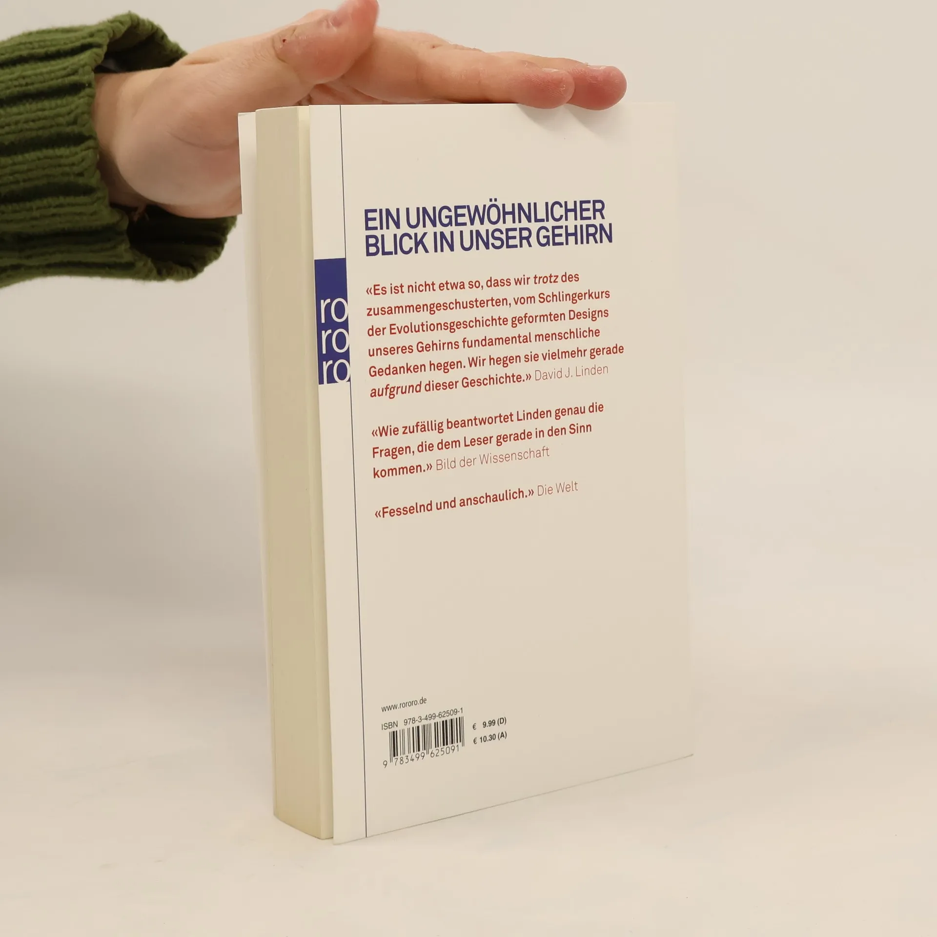 Ein ungewöhnlicher Blick in unser Gehirn «Es ist nicht etwa so, dass wir trotz des zusammengeschusterten, vom Schlingerkurs der Evolutionsgeschichte geformten Designs unseres Gehirns fundamental menschliche Gedanken hegen. Wir hegen sie vielmehr gerade aufgrund dieser Geschichte.» David J. Linden «Wie zufällig beantwortet Linden genau die Fragen, die dem Leser gerade in den Sinn kommen.» Bild der Wissenschaft «Fesselnd und anschaulich.» Die Welt