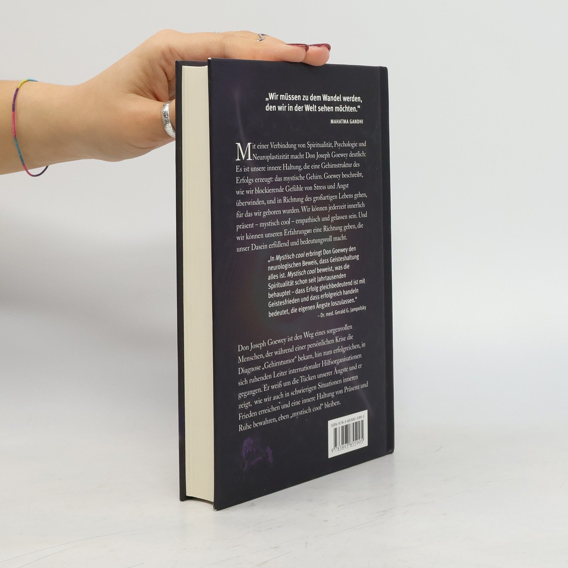 „Wir müssen zu dem Wandel werden, den wir in der Welt sehen möchten.“ – MAHATMA GANDHI Mit einer Verbindung von Spiritualität, Psychologie und Neuroplastizität macht Don Joseph Goewey deutlich: Es ist unsere innere Haltung, die eine Gehirnstruktur des Erfolgs erzeugt: das mystische Gehirn. Goewey beschreibt, wie wir blockierende Gefühle von Stress und Angst überwinden, und in Richtung des großartigen Lebens gehen, für das wir geboren wurden. Wir können jederzeit innerlich präsent – mystisch cool – empathisch und gelassen sein. Und wir können unseren Erfahrungen eine Richtung geben, die unser Dasein erfüllend und bedeutungsvoll macht. Don Joseph Goewey ist den Weg eines sorgenvollen Menschen, der während einer persönlichen Krise die Diagnose „Gehirntumor“ bekam, hin zum erfolgreichen, in sich ruhenden Leiter internationaler Hilfsorganisationen gegangen. Er weiß um die Tücken unserer Ängste und er zeigt, wie wir auch in schwierigen Situationen inneren Frieden erreichen und eine innere Haltung von Präsenz und Ruhe bewahren, eben „mystisch cool“ bleiben. „In Mystisch cool erbringt Don Goewey den neurologischen Beweis, dass Geisteshaltung alles ist. Mystisch cool beweist, was die Spiritualität schon seit Jahrtausenden behauptet – dass Erfolg gleichbedeutend ist mit Geistesfrieden und dass erfolgreich handeln bedeutet, die eigenen Ängste loszulassen.“ – Dr. med. Gerald G. Jampolsky