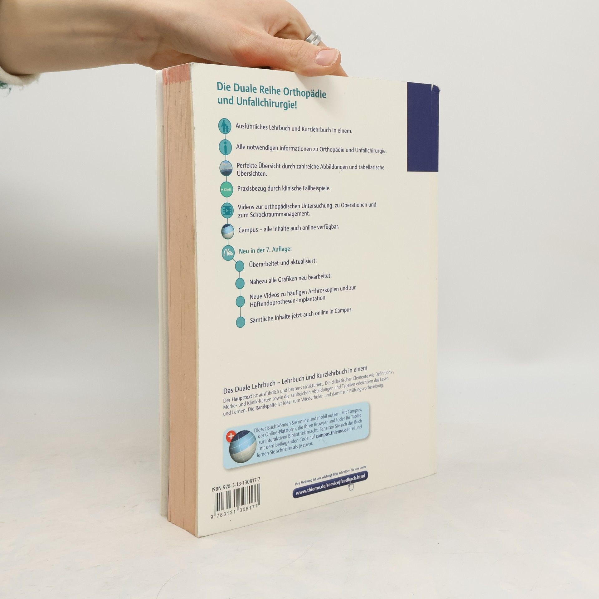 Die Duale Reihe Orthopädie hat alles, was Du zum Thema Orthopädie und Unfallchirurgie wissen musst: - die Inhalte sind perfekt strukturiert, mit vielen Querverweisen, aber trotzdem kurzen Erklärungen, sodass man nicht immer hin- und herblättern muss, - über 1200 exzellente Abbildungen, Graphiken, Röntgenbilder und Tabellen - ausgezeichnete Gewichtung der Fakten - ausführlich wenn nötig, stichwortartig wenn ausreichend. - hoher Praxisbezug durch zahlreiche klinische Fallbeispiele- Unbedingt sehenswert sind die Filmbeiträge zu folgenden Themen: - klinisch-orthopädische Untersuchung - Vorgehen im Rahmen der Versorgung eines Unfallpatienten im Schockraum (ATLS®-Konzept) - diagnostische und therapeutische Arthroskopien von Schulter-, Knie- und Hüftgelenk.