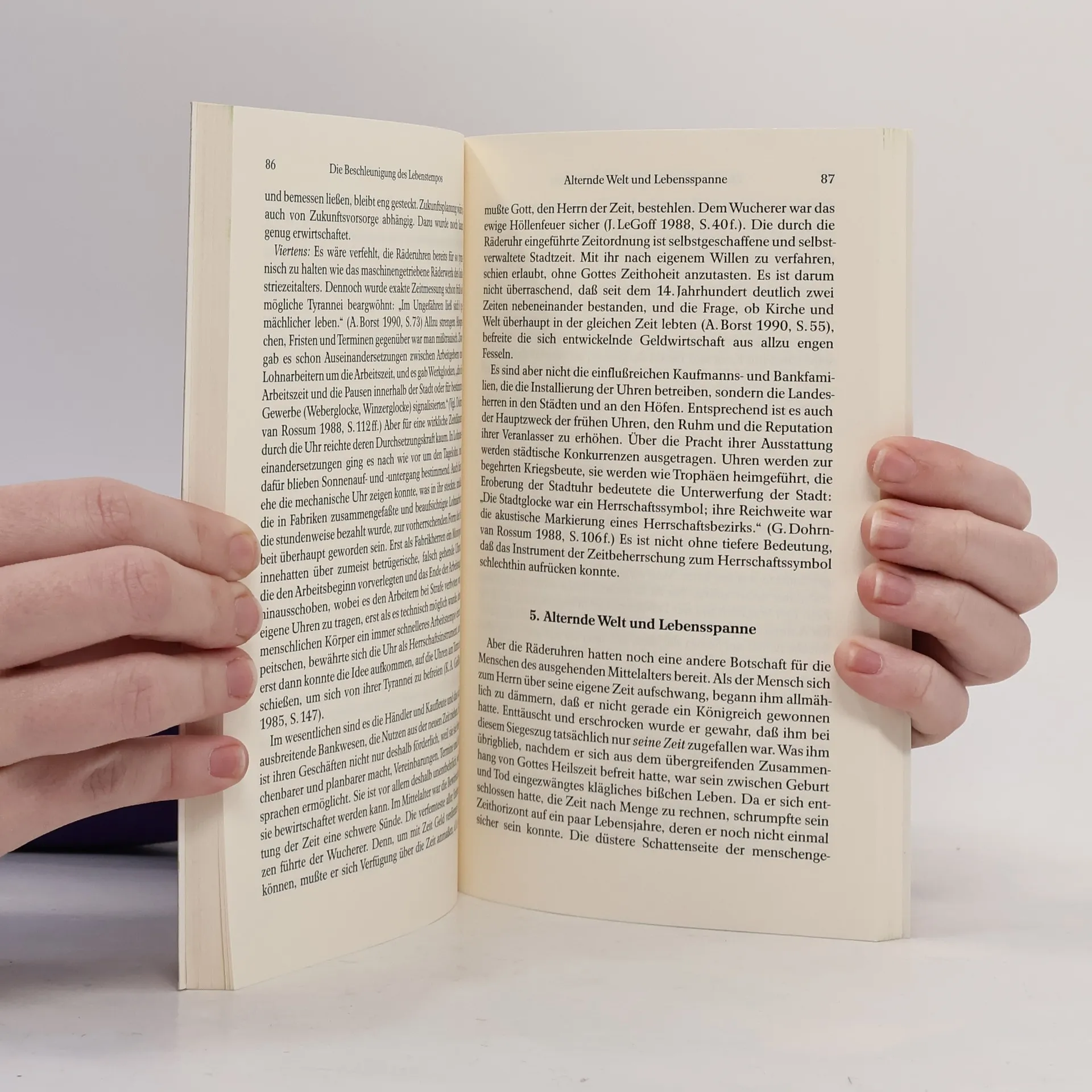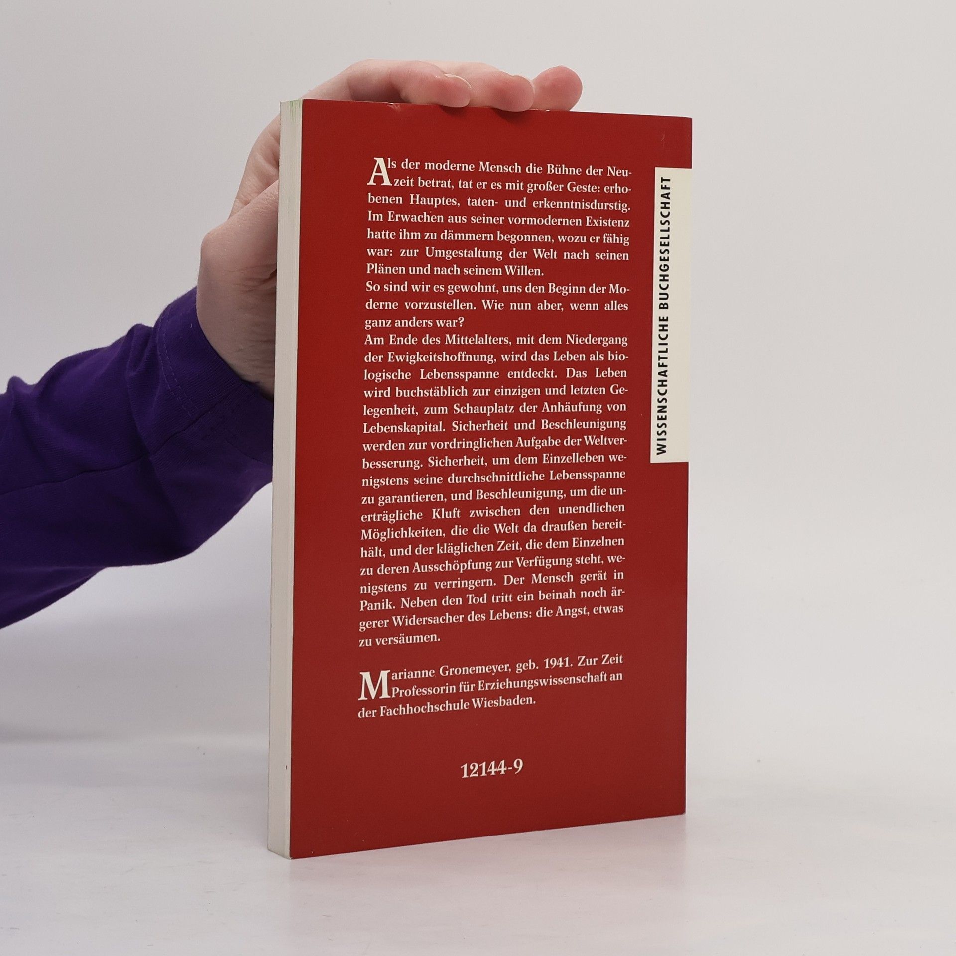 Ähnlich wie E. Friedell sieht Gronemeyer den Beginn der Moderne im 14. Jh. und somit in der Zeit der großen Pestepidemien. Der Tod zeigte sein lebensverneinendes Gesicht, wurde als unabänderliche Naturgewalt erfahren. Er verlor angesichts des Grauens seine heilsgeschichtliche Bedeutung und forderte seine Bekämpfung heraus. Die Anstrengung des modernen Menschen hat seitdem drei Stoßrichtungen: das Leben muss sicherer werden, es muß schneller werden und das Fremde muß getilgt werden. Die große Presseresonanz und die hohen Verkaufszahlen zu diesem Buch zeigen, wie sehr die Autorin einen empfindlichen Nerv unserer Zeit trifft. Die „Woche“ sprach von einer lohnenden Lektüre und „Pro Zukunft“ nannte die Analyse „schonungslos“ und „gerade deshalb überzeugend“. Am Beginn der Moderne, so schreibt Marianne Gronemeyer im Konzept zu diesem Buch, wird das Leben als biologische Lebensspanne konstituiert. Es wird buchstäblich zur einzigen und letzten Gelegenheit; nicht für die Rettung der Seele, sondern für die Anhäufung von Lebenskapital. Das Leben gerät unter das Gesetz der Akkumulation. Es wird panisch. Neben den Tod tritt ein anderer, beinah noch ärgerer Widersacher des Lebens: das Versäumnis.