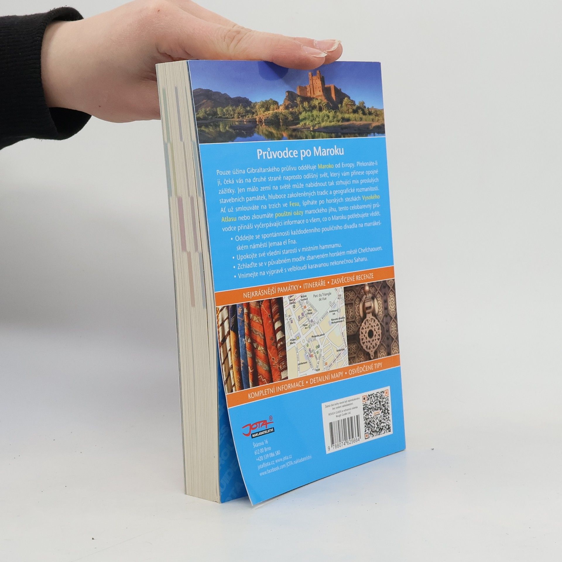 Pouze úžina Gibraltarského průlivu odděluje Maroko od Evropy. Překonáte-li ji, čeká vás na druhé straně naprosto odlišný svět, který vám přinese opojné zážitky. Jen málo zemí na světě může nabídnout tak strhující mix proslulých stavebních památek, hluboce zakořeněných tradic a geografické rozmanitosti. Ať už smlouváte na soukách ve Fesu, šplháte po horských stezkách Vysokého Atlasu nebo zkoumáte pouštní oázy marockého jihu, tento celobarevný průvodce přináší vyčerpávající informace o všem, co o Maroku potřebujete vědět. Oddejte se spontánnosti každodenního pouličního divadla na marrakešském náměstí Jemaa el Fna. Upokojte své všední starosti v místním hammamu. Zchlaďte se v půvabném modře zbarveném horském městě Chefchaouen. Vnímejte na výpravě s velbloudí karavanou nekonečnou Saharu. Průvodce Rough Guide je jedním z nejkomplexnějších knižních průvodců po této fascinující zemi. Každá kapitola obsahuje detailní informace o daném místě, seznam hotelů i restaurací a věnuje se i všemu zajímavému: od lidových svátků a jazyka po média a sport. Najdete tu rovněž základní informace o životním prostředí, politice, kultuře, hudbě a historii. Nová celobarevná koncepce knihy kombinuje nádherné fotografie, které povzbudí vaši chuť cestovat, s praktickým řazením textů a spoustou přehledných map. Ty vás bezpečně provedou centry měst, oázami, plážemi i horami. Objevte Maroko – průvodce Rough Guide vám bude skvělým společníkem.