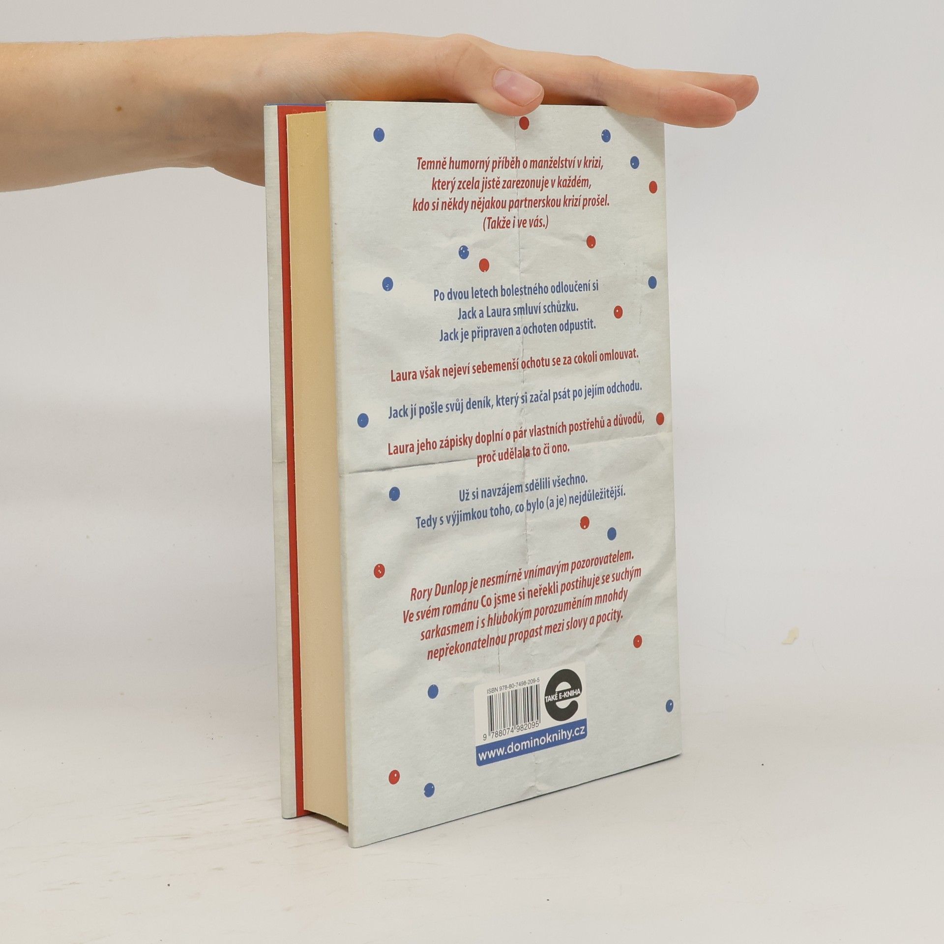 Temně humorný příběh o manželství v krizi, který zcela jistě zarezonuje v každém, kdo si někdy nějakou partnerskou krizí prošel. (Takže i ve vás.) Po dvou letech bolestného odloučení si Jack a Laura smluví schůzku. Jack je připraven a ochoten odpustit. Laura však nejeví sebemenší ochotu se za cokoli omlouvat. Jack jí pošle svůj deník, který si začal psát po jejím odchodu. Laura jeho zápisky doplní o pár vlastních postřehů a důvodů, proč udělala to či ono. Už si navzájem sdělili všechno. Tedy s výjimkou toho, co bylo (a je) nejdůležitější. Rory Dunlop je nesmírně vnímavým pozorovatelem. Ve svém románu Co jsme si neřekli postihuje se suchým sarkasmem i s hlubokým porozuměním mnohdy nepřekonatelnou propast mezi slovy a pocity.