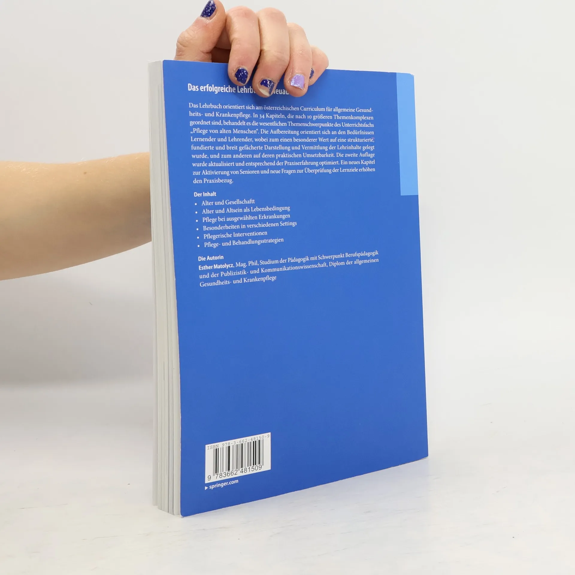 Das vorliegende Lehrbuch orientiert sich am österreichischen Curriculum für allgemeine Gesundheits- und Krankenpflege. In 33 Kapiteln, die nach 9 größeren Themenkomplexen geordnet sind, behandelt es die wesentlichen Themenschwerpunkte des Unterrichtsfachs „Pflege von alten Menschen“. Die Aufbereitung ist an den Bedürfnissen Lernender und Lehrender orientiert, wobei einerseits besonderer Wert auf eine strukturierte, fundierte und breit gefächerte Darstellung und Vermittlung der Lehrinhalte gelegt ist, andererseits auf deren praktischen Umsetzbarkeit. Die zweite Auflage wurde komplett überarbeitet und entsprechend der Praxiserfahrung optimiert. Ein neues Kapitel zur Aktivierung von Senioren und neue Fragen zur Überprüfung der Lernziele erhöhen den Praxisbezug.