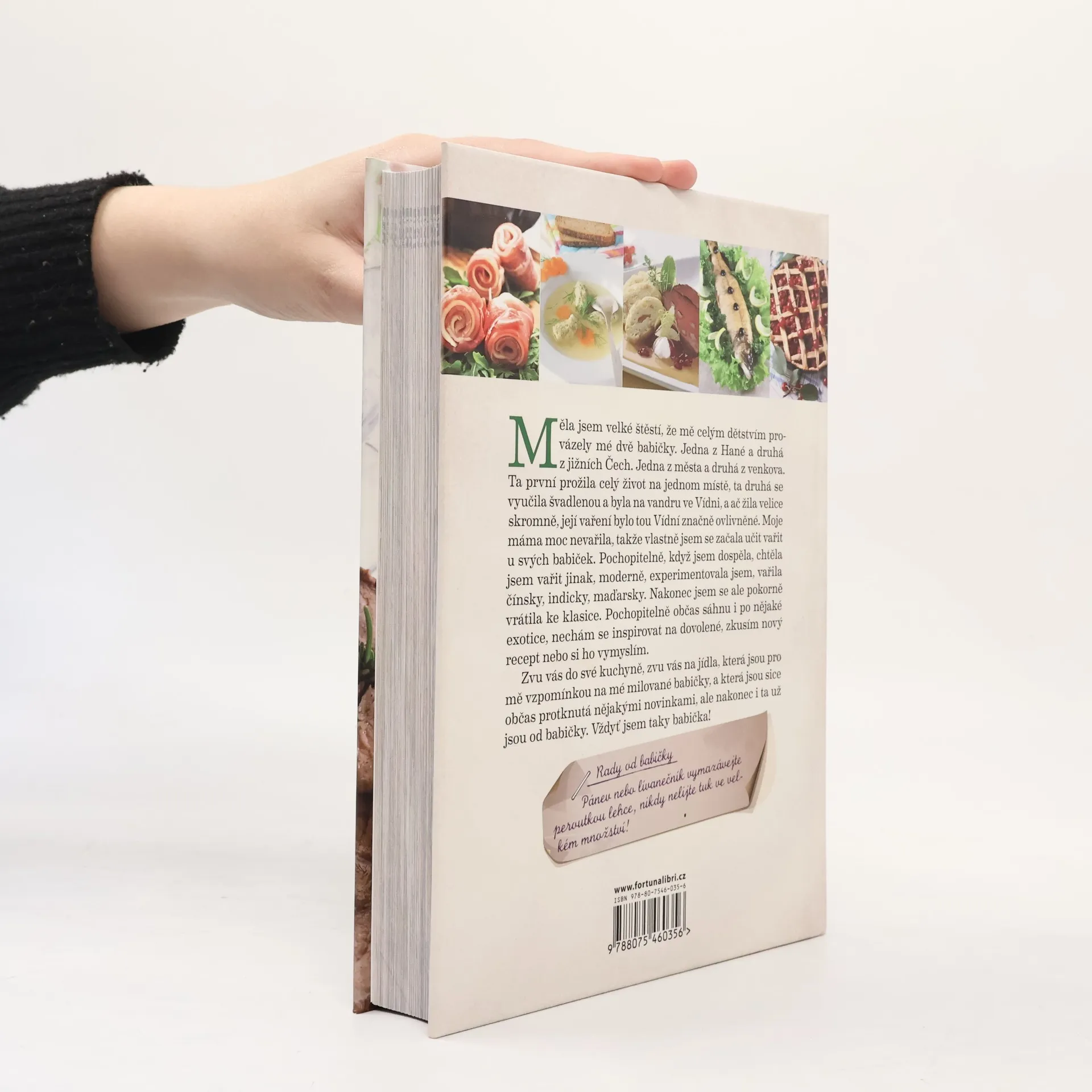 Měla jsem velké štěstí, že mě celým dětstvím provázely mé dvě babičky. Jedna z Hané a druhá z jižních Čech. Jedna z města a druhá z venkova. Ta první prožila celý život na jednom místě, ta druhá se vyučila švadlenou a byla na vandru ve Vídni, a ač žila velice skromně, její vaření bylo tou Vídní značně ovlivněné. Moje máma moc nevařila, takže vlastně jsem se začala učit vařit u svých babiček. Pochopitelně, když jsem dospěla, chtěla jsem vařit jinak, moderně, experimentovala jsem, vařila čínsky, indicky, maďarsky. Nakonec jsem se ale pokorně vrátila ke klasice. Pochopitelně občas sáhnu i po nějaké exotice, nechám se inspirovat na dovolené, zkusím nový recept, nebo si ho vymyslím. Zvu vás do své kuchyně, zvu vás na jídla, která jsou pro mě vzpomínkou na mé milované babičky, a která jsou sice občas protknutá nějakými novinkami, ale nakonec i ta už jsou od babičky. Vždyť jsem taky babička!