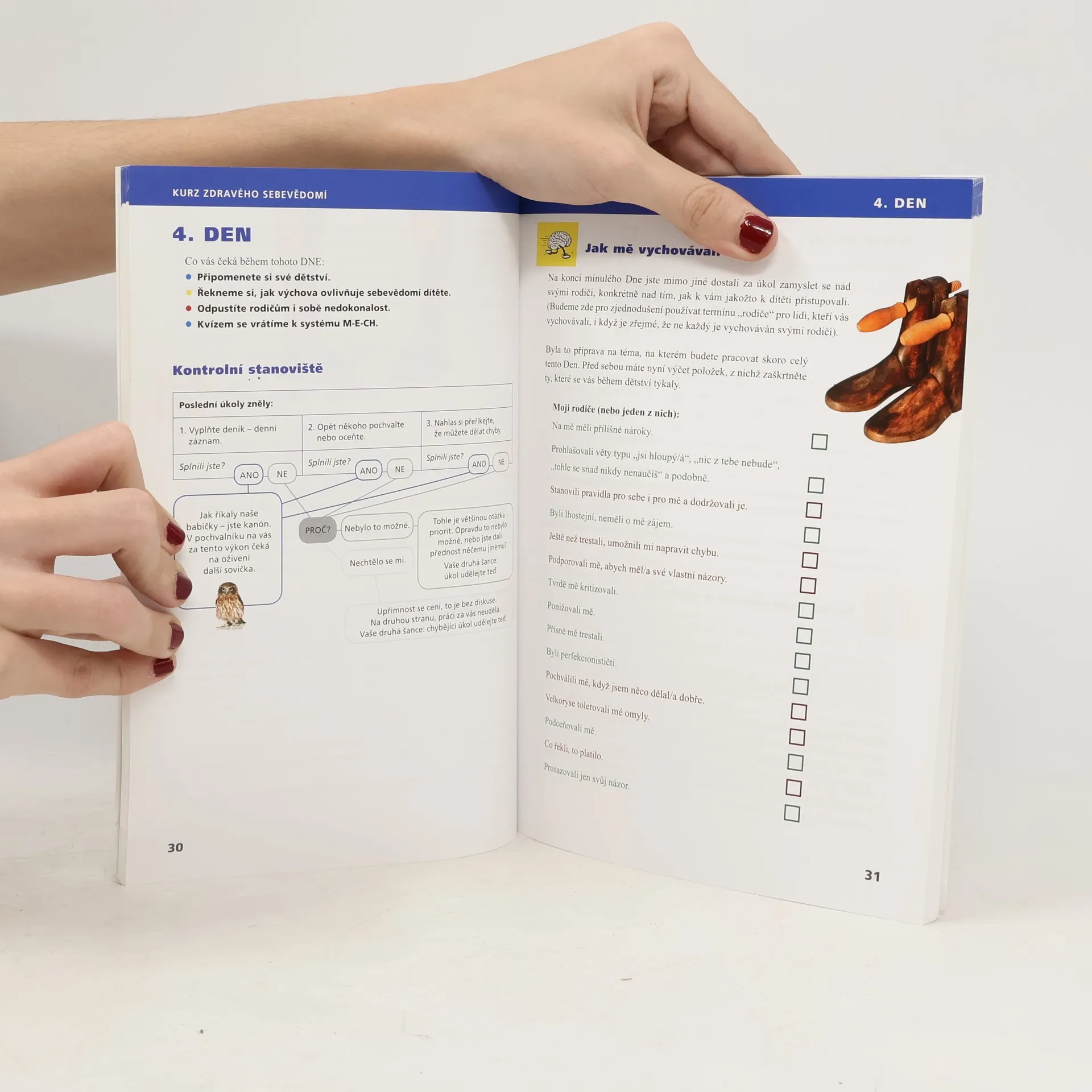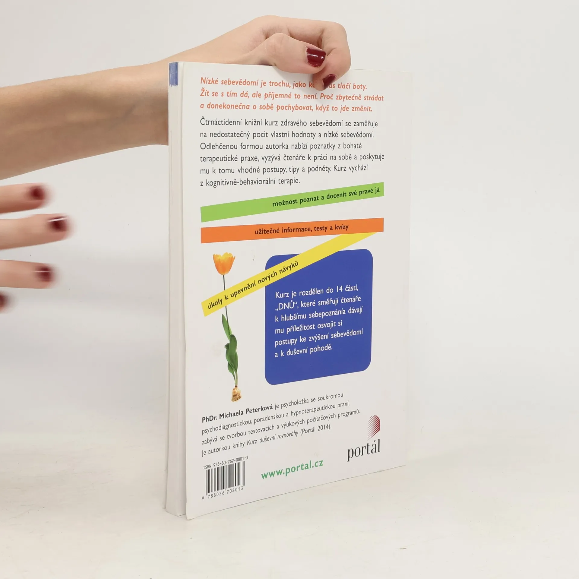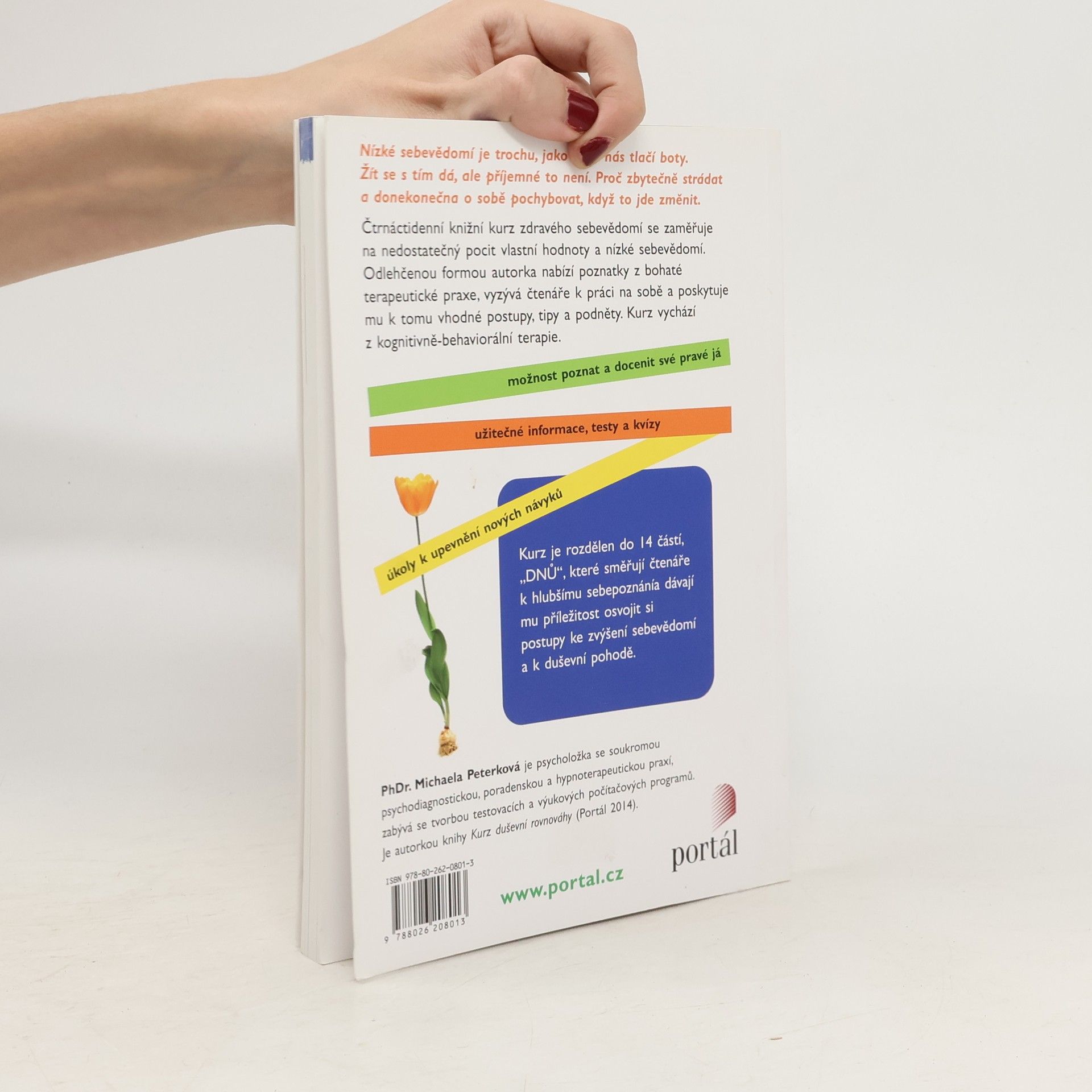 Nízké sebevědomí je trochu, jako když nás tlačí boty. Žít se s tím dá, ale příjemné to není. Proč zbytečně strádat a do nekonečna o sobě pochybovat, když to jde změnit. Čtrnáctidenní knižní kurz zdravého sebevědomí je pokračováním série tréninků duševního zdraví a zaměřuje se na nedostatečný pocit vlastní hodnoty a nízké sebevědomí. Odlehčenou formou nabízí autorka poznatky z bohaté terapeutické praxe, vyzývá čtenáře k práci na sobě a poskytuje mu k tomu vhodné postupy, tipy a podněty. Kurz vychází z kognitivně-behaviorální terapie. Kurz je rozdělen do 14 částí, „DNŮ“, které směřují čtenáře k hlubšímu sebepoznání a dávají mu příležitost osvojit si postupy ke zvýšení sebevědomí a duševní pohody.