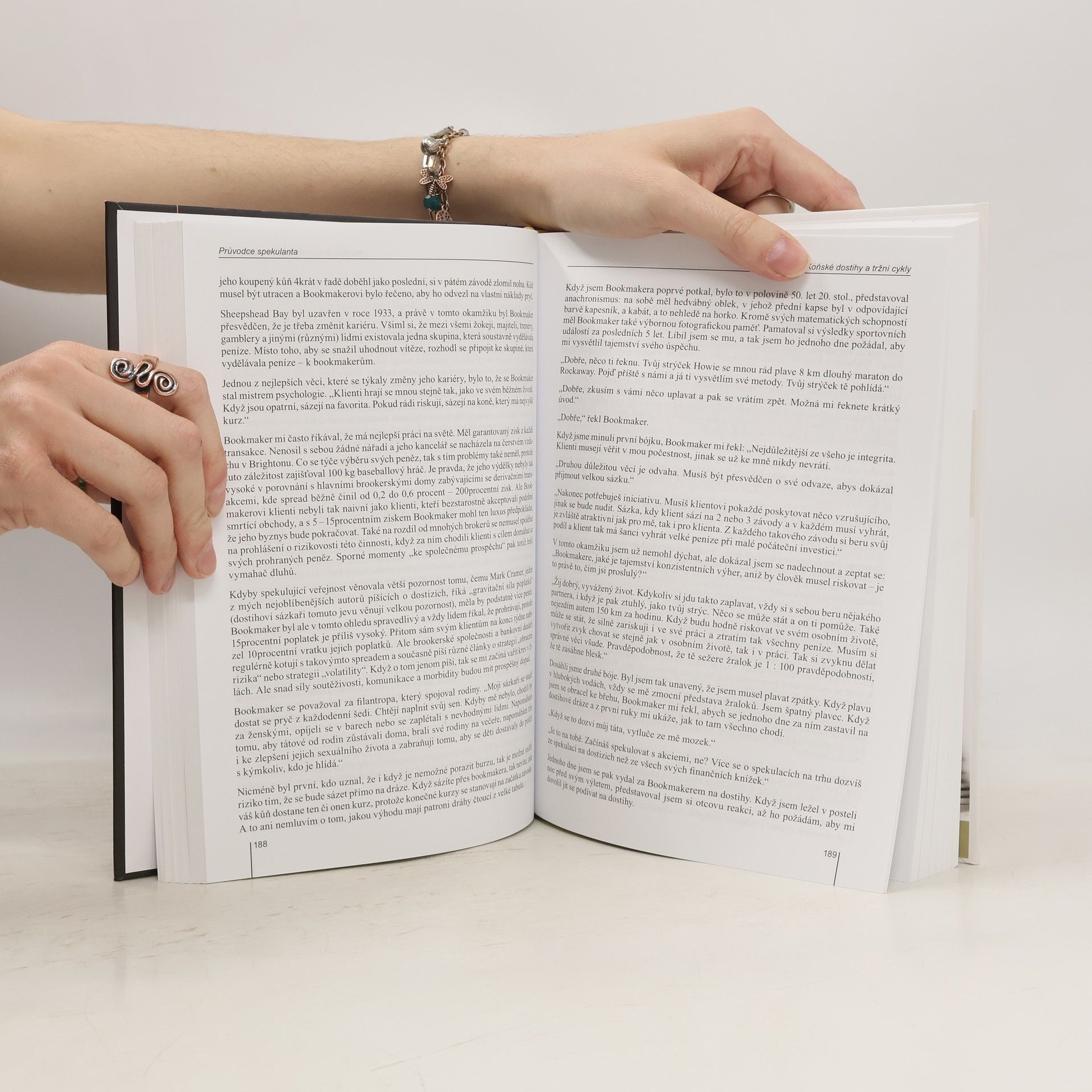 Anotace Kniha známého spekulanta je nezaměnitelnou biblí pro každého, kdo chce dosáhnout úspěchu na komoditních trzích. Autor vysvětluje způsob myšlení a chování během obchodování na trhu. Krok za krokem podrobně popisuje jak techniku, tak i styl svého obchodování. Kniha bude užitečná jak pro začátečníky, tak i pro profesionální tradery. Publikace, která je ve Spojených státech bestsellerem, bude velice cenná pro všechny zájemce o finanční trhy, neboť je unikátním zdrojem informací o myšlení jednoho z nejúspěšnějších traderů 90. let. Z obsahu Úvodem Předmluva Poděkování Starý trader a jen Kapitola 1: Hodiny na Brighton Beach Kapitola 2: Paniky a ti, co přinášejí smůlu Kapitola 3: Delfští věštci a věda Kapitola 4: Ztráty, comebacky, trendy a počasí Kapitola 5: Výhry a samostatnost Kapitola 6: Podstata her Kapitola 7: Základní stolní hry Kapitola 8: Hazard Kapitola 9: Koňské dostihy a tržní cykly Kapitola 10: Klam a grafy Kapitola 11: Sex Kapitola 12: Zisk a náhoda: vědecký styl Kapitola 13: Spojení s monitorem Kapitola 14: Hudba a počítání Kapitola 15: Ekologie trhů Závěr Poznámky Vybraná literatura