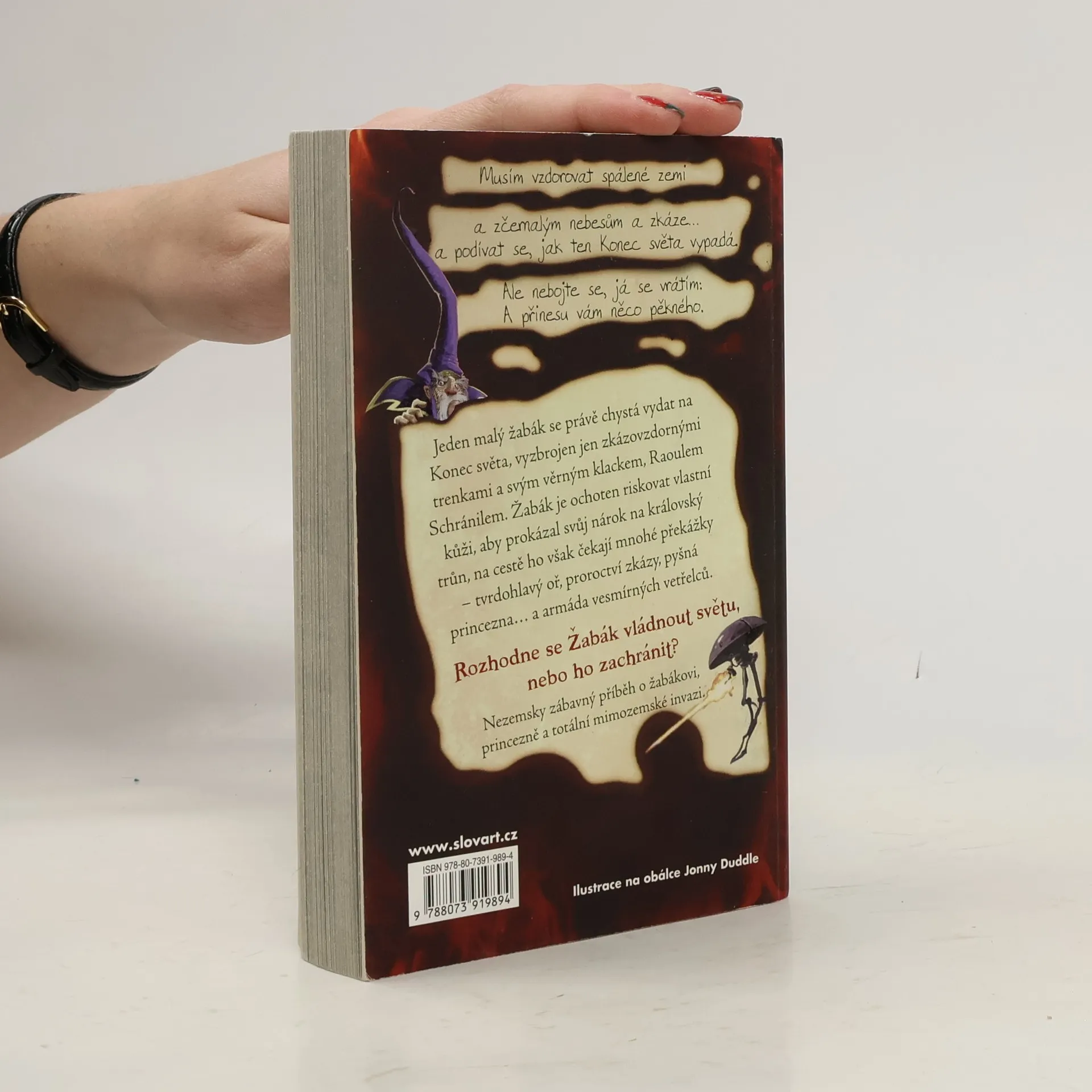 Nová série od autora úspěšné tetralogie o Filínu Fidlovi začíná příběhem Žabáka, který žije sám s pěstounkou na osamělém ostrově daleko od všeho. Je přesvědčený, že se narodil jako princ. Jednoho dne se vydá na dobrodružnou pouť na konec světa, aby tam jako právoplatný vládce nastoupil na trůn. Do cesty se mu však staví jedna překážka za druhou - tvrdohlavá ovce, proroctví věštící záhubu, pyšná princezna, která si z něj chce udělat domácí zvířátko. Navíc ho napadne armáda po zuby ozbrojených mimozemšťanů, kteří se na něj podezřele povyšují. Jaká královská krev mu to vlastně koluje v žilách? Rozhodne se princ Žabák ovládnout svět, nebo ho zachránit?