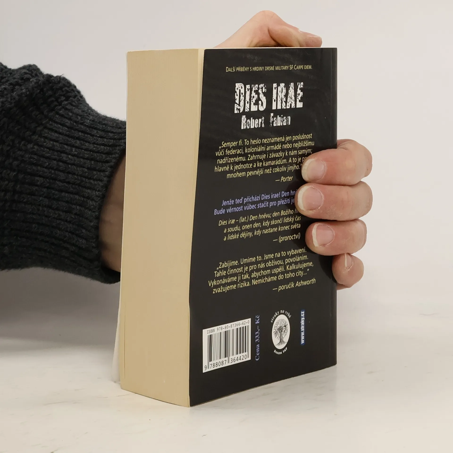 Další příběhy s hrdiny drsné military SF Carpe diem: „Semper fi. To heslo neznamená jen poslušnost vůči federaci, koloniální armádě nebo nejbližšímu nadřízenému. Zahrnuje i závazky k nám samým; hlavně k jednotce a ke kamarádům. A to je pouto mnohem pevnější než cokoliv jinýho.“ --- Porter "Jenže teď přichází Dies irae! Den hněvu! Bude věrnost vůbec stačit pro přežití jednotky?" Dies ira – (lat.) Den hněvu; den Božího hněvu a soudu, onen den, kdy skončí lidský čas a lidské dějiny, kdy nastane konec světa ---(proroctví)" „Zabíjíme. Umíme to. Jsme na to vybavení. Tahle činnost je pro nás obživou, povoláním. Vykonáváme ji tak, abychom uspěli. Kalkulujeme, zvažujeme rizika. Nemícháme do toho city...“ --- poručík Ashworth