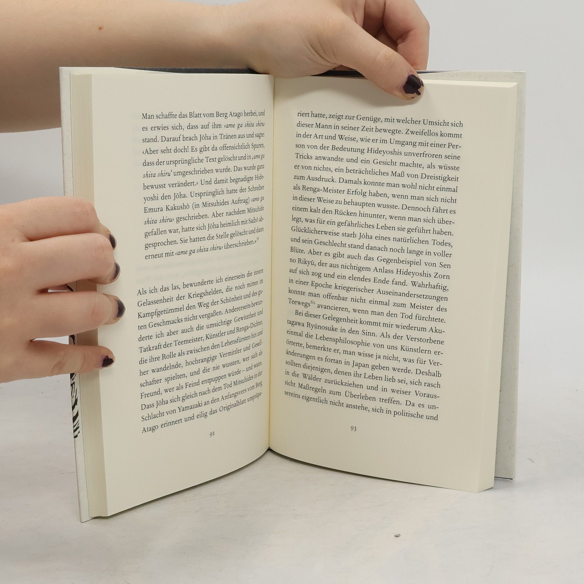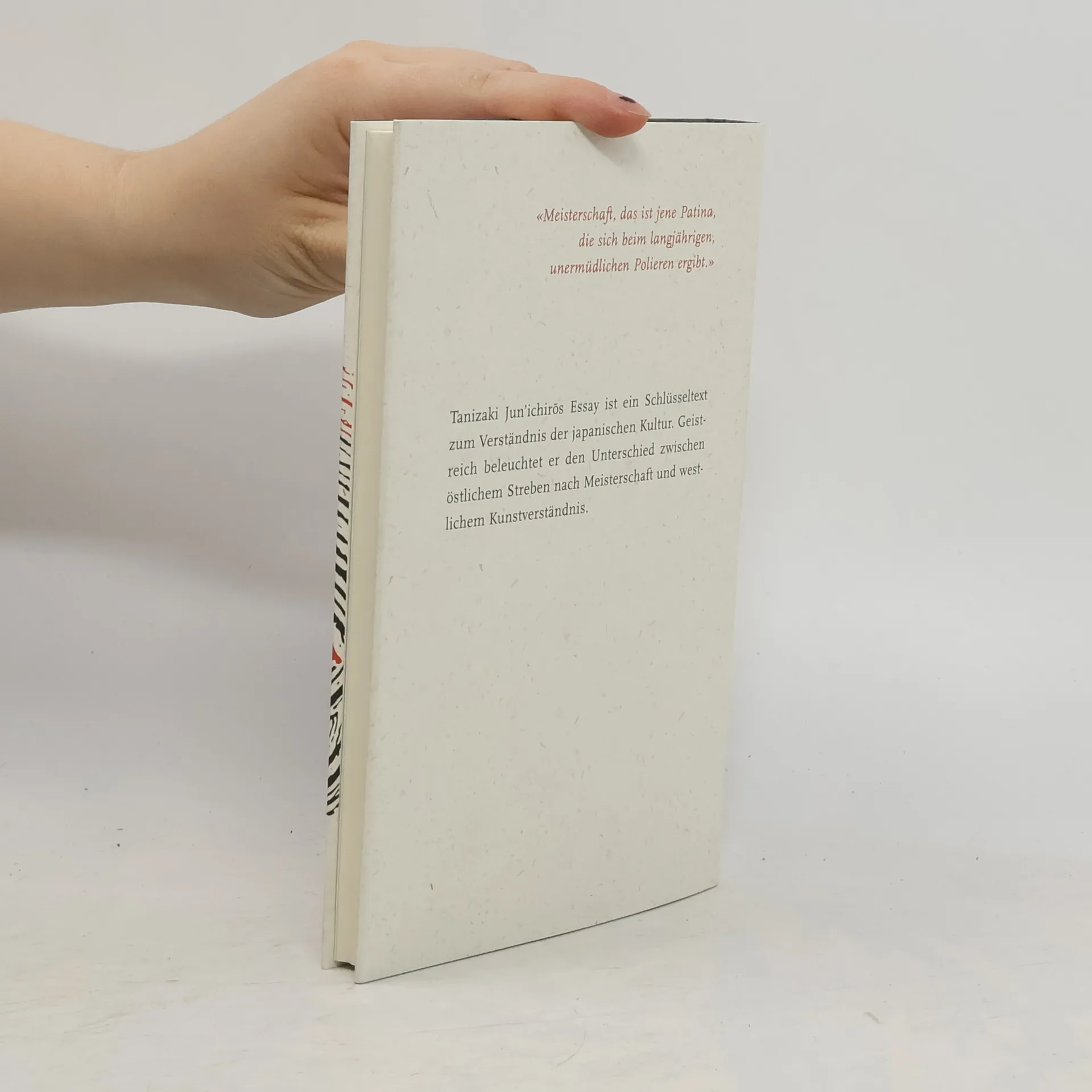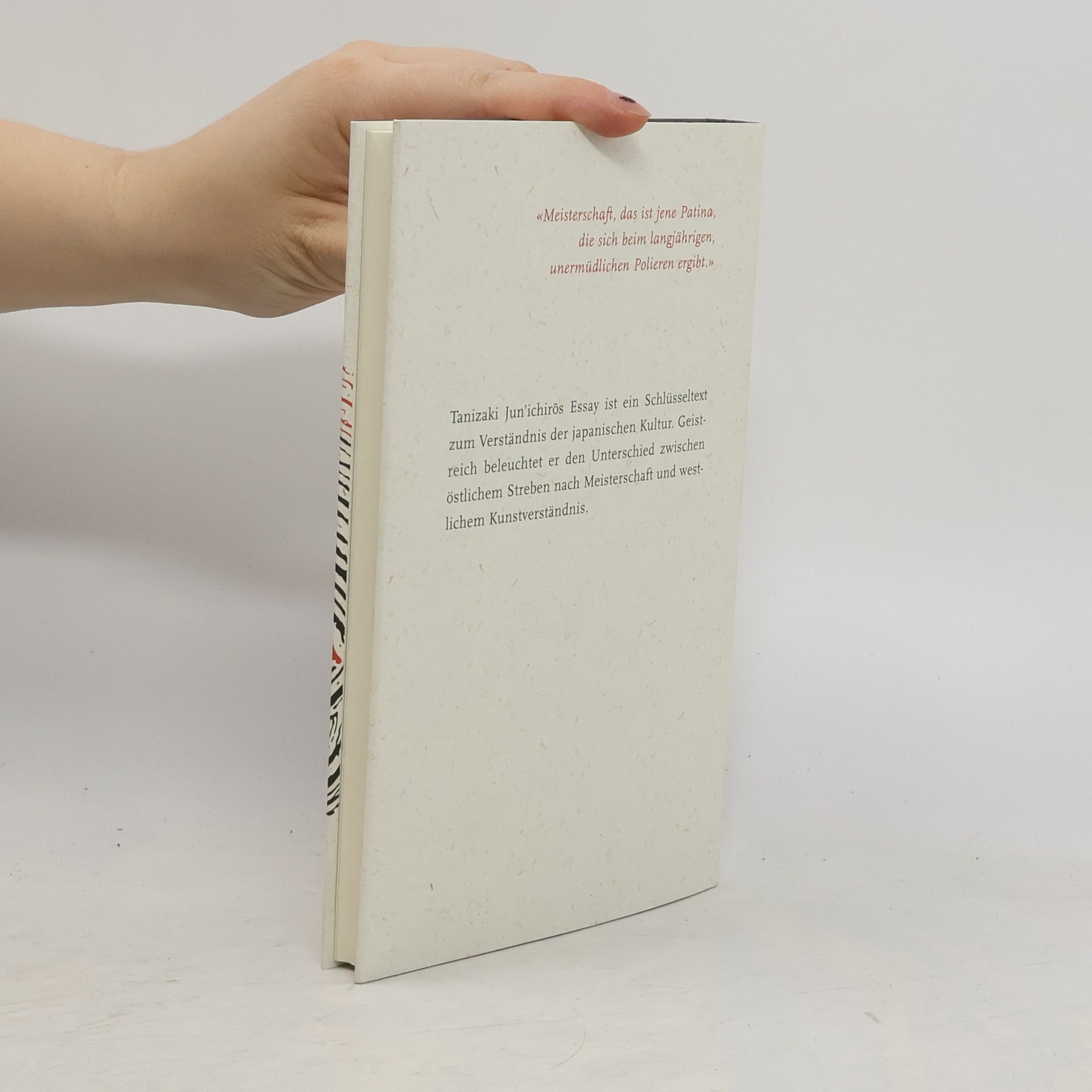 «Meisterschaft, das ist jene Patina, die sich beim langjährigen, unermüdlichen Polieren ergibt.» Tanizaki Jun'ichiros Essay ist ein Schlüsseltext zum Verständnis der japanischen Kultur und beleuchtet den Unterschied zwischen östlichem Streben nach Meisterschaft und westlichem Kunstverständnis. Er untersucht, wie Meisterwerke entstehen und bietet eine Entdeckung für Freunde fernöstlicher Lebensart. Durch das Verständnis des Fremden eröffnet er auch einen neuen Blick auf die eigene Kultur. Tanizaki zieht einprägsame Vergleiche, wenn er Schauspielkunst, Tanz, Literatur und Malerei seiner Heimat analysiert. Bei der Diskussion über «Meisterschaft» vergleicht er stets mit dem Westen, was zu verblüffenden Fragen führt: Warum entspricht Arthur Schnitzlers Schreiben dem japanischen Gemüt, nicht aber das von August Strindberg? Was verbindet den deutschen Stummfilmstar Werner Krauß mit dem Kabuki-Theater? Was ist das typisch Amerikanische an Charlie Chaplins Filmen? Geschrieben in den 1930er-Jahren, hält Tanizaki in diesem Essay fest, was die Identität Japans über Jahrtausende prägte. Erstmals auf Deutsch in bibliophiler Ausstattung mit Schutzumschlag aus Naturpapier, gebunden in schwarzes, geprägtes Strukturpapier, mit Original-Kalligrafie, 9 s/w-Abbildungen und 1 Kalligrafie.