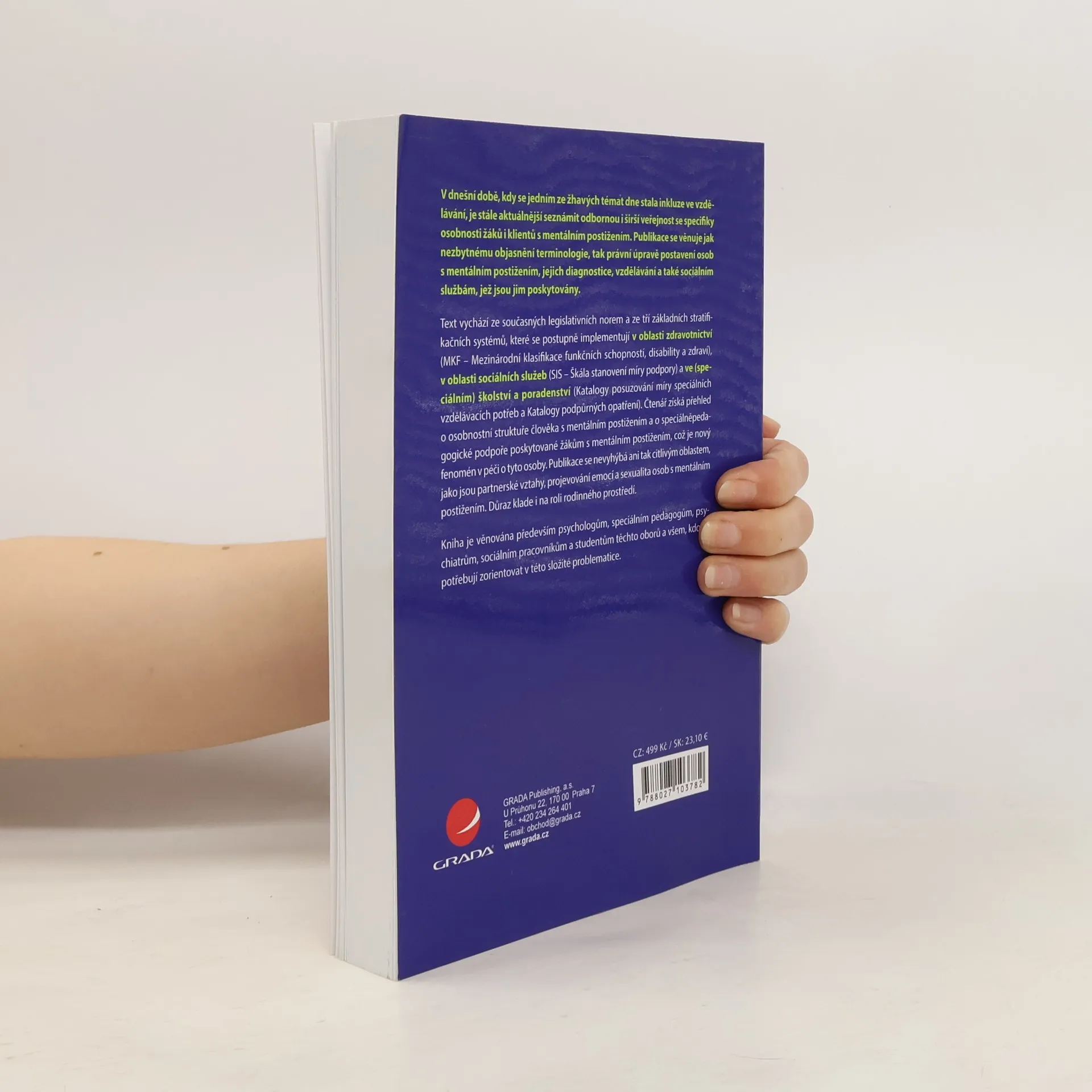 V dnešní době, kdy se jedním ze žhavých témat dne stala inkluze ve vzdělávání, je stále aktuálnější seznámit odbornou i širší veřejnost se specifiky osobnosti žáků i klientů s mentálním postižením. Publikace se věnuje jak nezbytnému objasnění terminologie, tak právní úpravě postavení osob s mentálním postižením, jejich diagnostice, vzdělávání a také sociálním službám, jež jsou jim poskytovány. Text vychází ze současných legislativních norem a ze tří základních stratifikačních systémů, které se postupně implementují v oblasti zdravotnictví (MKF – Mezinárodní klasifikace funkčních schopností, disability a zdraví), v oblasti sociálních služeb (SIS – Škála stanovení míry podpory) a ve (speciálním) školství a poradenství (Katalogy posuzování míry speciálních vzdělávacích potřeb a Katalogy podpůrných opatření). Čtenář získá přehled o osobnostní struktuře člověka s mentálním postižením a o speciálněpedagogické podpoře pro žáky s mentálním postižením, což je nový fenomén v péči o tyto osoby. Publikace se nevyhýbá ani tak citlivé oblasti, jako je projevování emocí, partnerské vztahy a sexualita osob s mentálním postižením. Důraz klade i na roli rodinného prostředí. Kniha je věnována především psychologům, speciálním pedagogům, psychiatrům, sociálním pracovníkům a studentům těchto oborů a všem, kdo se potřebují zorientovat v této složité problematice.