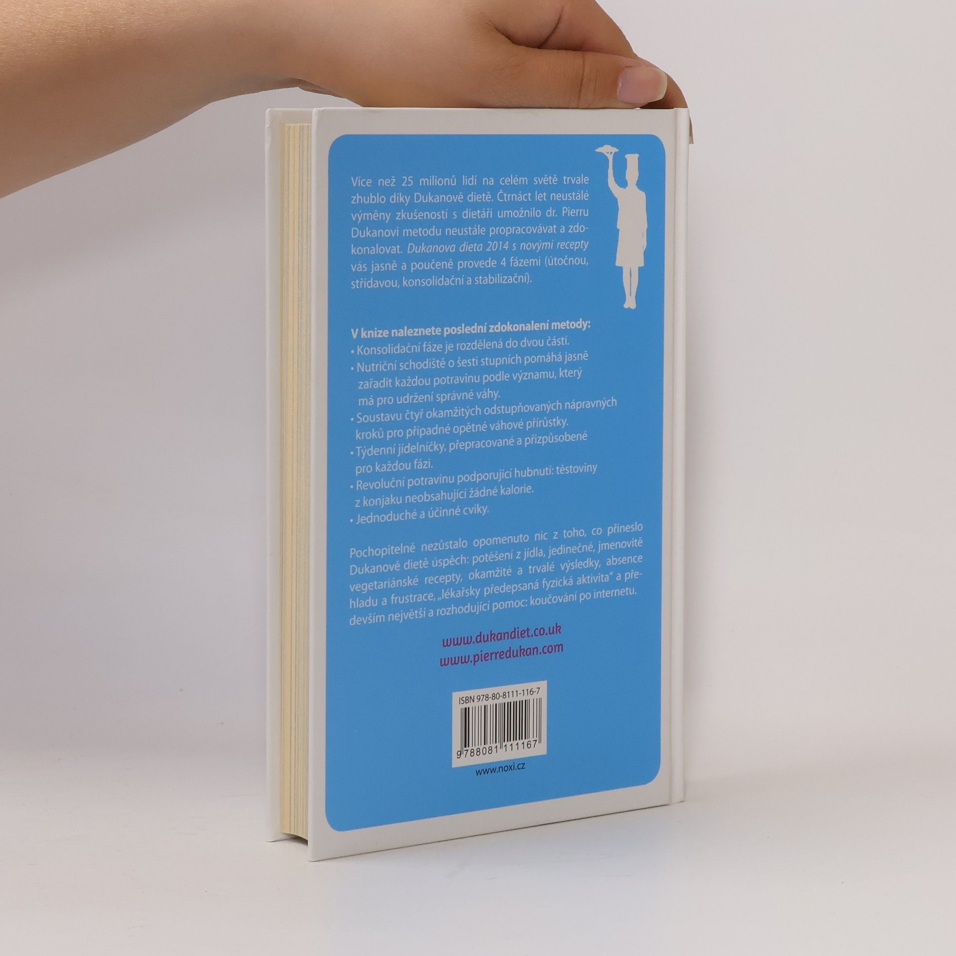 Více než 25 milionů osob na celém světě trvale zhublo díky Dukanově dietě. Čtrnáct let neustálé výměny zkušeností s dietáři umožnilo dr. Pierru Dukanovi metodu neustále propracovávat a zdokonalovat. Dukanova dieta s novými recepty i pro vegetariány vás jasně a poučeně provede 4 fázemi (útočnou, střídavou, konsolidační a stabilizační). V knize nalezete poslední zdokonalení metody: • Konsolidační fáze je rozdělená do dvou částí. • Nutriční schodiště o šesti stupních pomáhá jasně zařadit každou potravinu podle významu, který má pro udržení správné váhy. • Soustavu čtyř okamžitých odstupňovaných nápravných kroků pro případné opětné váhové přírůstky. • Týdenní jídelníčky, přepracované a přizpůsobené pro každou fázi. • Revoluční potravinu podporující hubnutí: těstoviny z konjaku neobsahující žádné kalorie. • Jednoduché a účinné cviky s ilustračními fotografiemi. Pochopitelně nezůstalo opomenuto nic z toho, co přineslo Dukanově dietě úspěch: potěšení z jídla, jedinečné, jmenovitě vegetariánské recepty, okamžité a trvalé výsledky, absence hladu a frustrace, „lékařsky předepsaná fyzická aktivita“, smlouva o krátkodobé, střednědobé a dlouhodobé stabilizaci – a především největší a rozhodující pomoc: koučování po internetu.