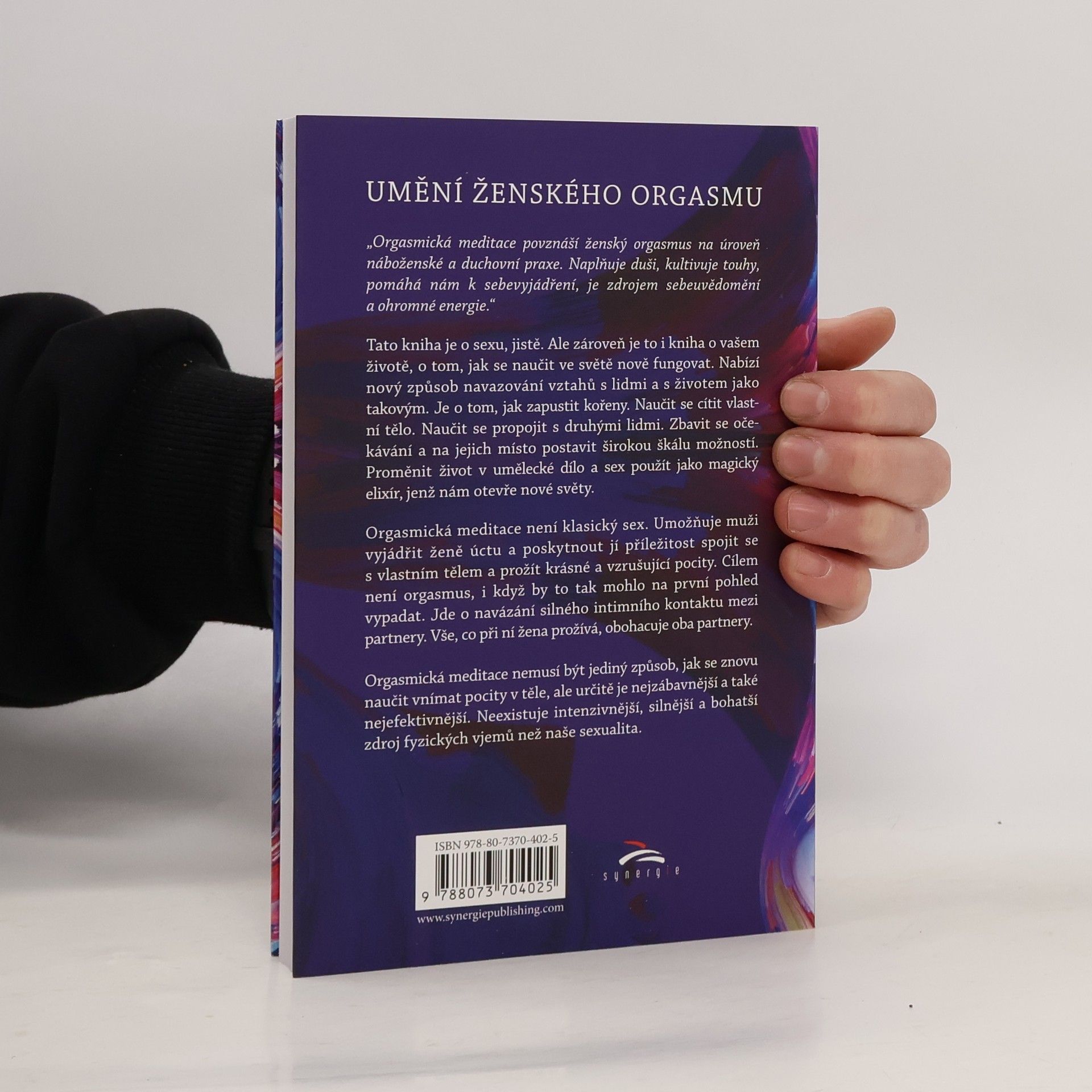 „Orgasmická meditace povznáší ženský orgasmus na úroveň náboženské a duchovní praxe. Naplňuje duši, kultivuje touhy, pomáhá nám k sebevyjádření, je zdrojem sebeuvědomění a ohromné energie.“ Tato kniha je o sexu, jistě. Ale zároveň je to i kniha o vašem životě, o tom, jak se naučit ve světě nově fungovat. Nabízí nový způsob navazování vztahů s lidmi a s životem jako takovým. Je o tom, jak zapustit kořeny. Naučit se cítit vlastní tělo. Naučit se propojit s druhými lidmi. Zbavit se očekávání a na jejich místo postavit širokou škálu možností. Proměnit život v umělecké dílo a sex použít jako magický elixír, jenž nám otevře nové světy. Orgasmická meditace není klasický sex. Umožňuje muži vyjádřit ženě úctu a poskytnout jí příležitost spojit se s vlastním tělem a prožít krásné a vzrušující pocity. Cílem není orgasmus, i když by to tak mohlo na první pohled vypadat. Jde o navázání silného intimního kontaktu mezi partnery. Vše, co při ní žena prožívá, obohacuje oba dva. Orgasmická meditace nemusí být jediný způsob, jak se znovu naučit vnímat pocity v těle, ale určitě je nejzábavnější a také nejefektivnější. Neexistuje intenzivnější, silnější a bohatší zdroj fyzických vjemů než naše sexualita.
