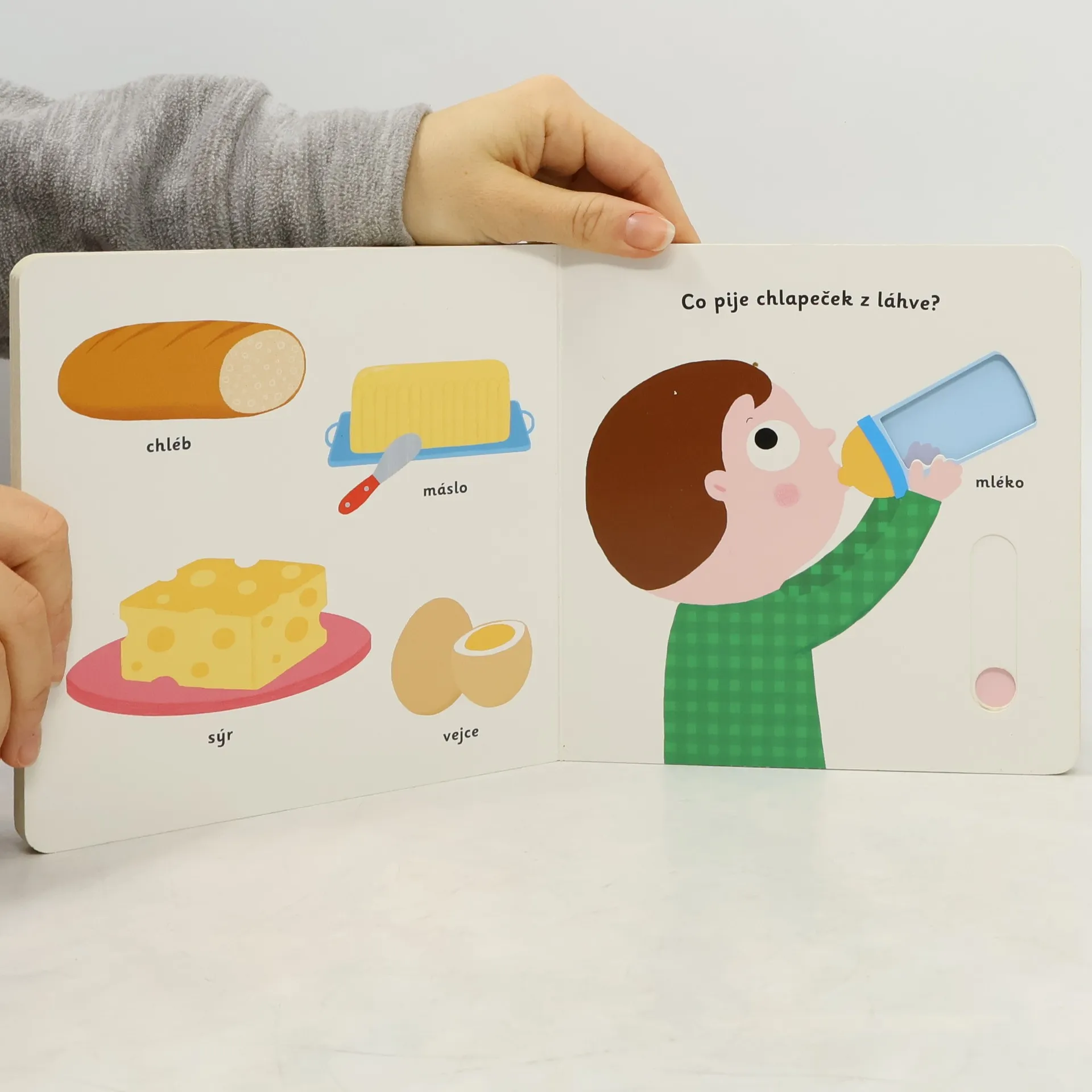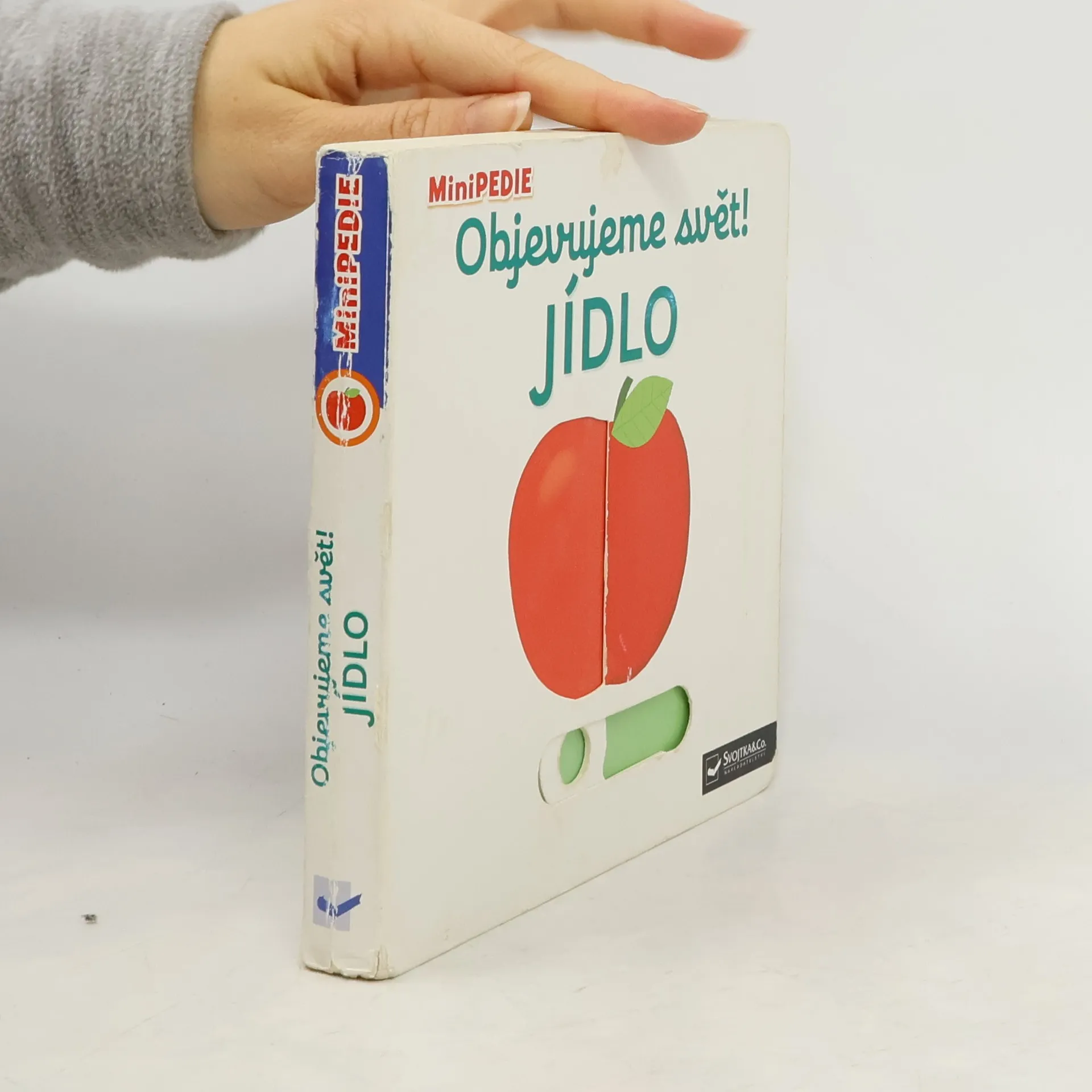 Jak vypadá jablíčko, když se rozkrojí? Co bude dnes k obědu? A co se maže na chleba k snídani? Je zdravější hrášek, nebo hranolky? Které ovoce je oranžové? Rozdělí se mlsná holčička o bonbony? Stačí jen vložit prstík do správného otvoru a lehce vysunout, zatáhnout nebo otočit ve směru šipky a hned bude váš malý objevitel znát odpovědi na všechny tyto otázky o jídle. Leporelo je určeno pro nejmenší děti od jednoho roku a má pevné stránky s posuvnými a otočnými prvky, a tak si naši nejmenší mohou při prohlížení a rozeznávání zvířátek a věcí z farmy procvičit i jemnou motoriku. Knížka s prvky Montessori.