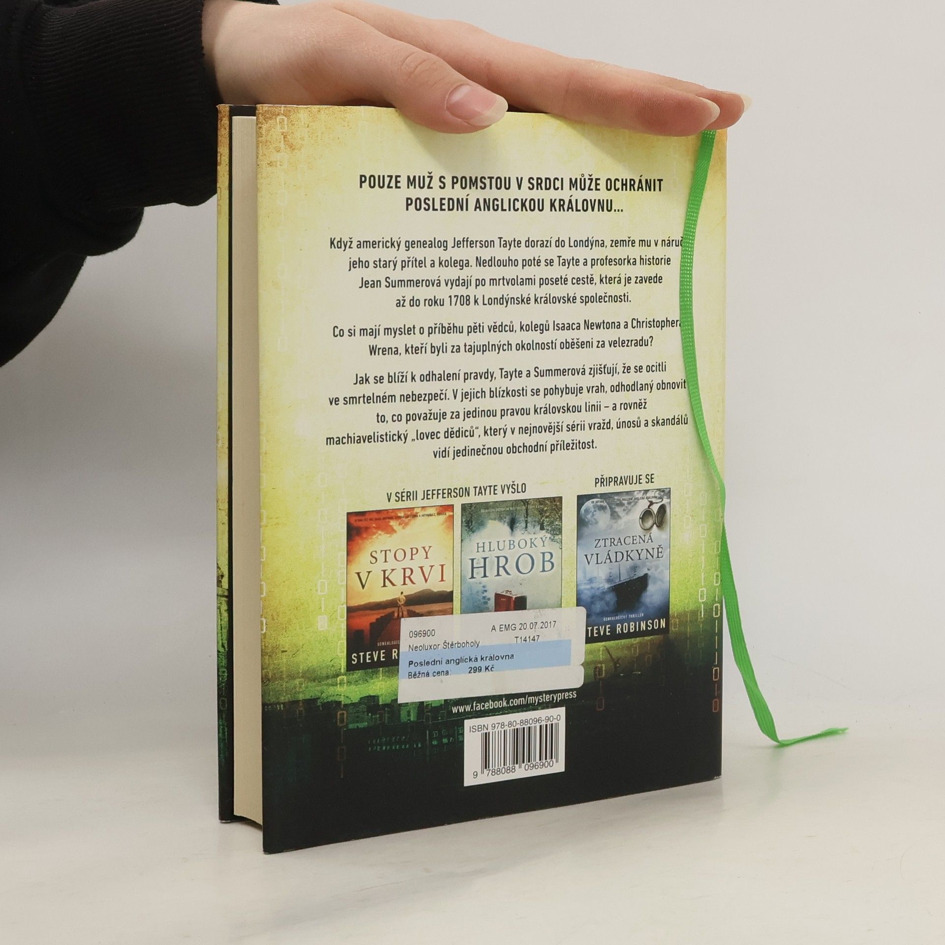 POUZE MUŽ S POMSTOU V SRDCI MŮŽE OCHRÁNIT POSLEDNÍ ANGLICKOU KRÁLOVNU… Když americký genealog Jefferson Tayte dorazí do Londýna, zemře mu v náruči jeho starý přítel a kolega. Nedlouho poté se Tayte a profesorka historie Jean Summerová vydají po mrtvolami poseté cestě, která je zavede až do roku 1708 k Londýnské královské společnosti. Co si mají myslet o příběhu pěti vědců, kolegů Isaaca Newtona a Christophera Wrena, kteří byli za tajuplných okolností oběšeni za velezradu? Jak se blíží k odhalení pravdy, Tayte a Summerová zjišťují, že se ocitli ve smrtelném nebezpečí. V jejich blízkosti se pohybuje vrah, odhodlaný obnovit to, co považuje za jedinou pravou královskou linii – a rovněž machiavelistický „lovec dědiců“, který v nejnovější sérii vražd, únosů a skandálů vidí jedinečnou obchodní příležitost.