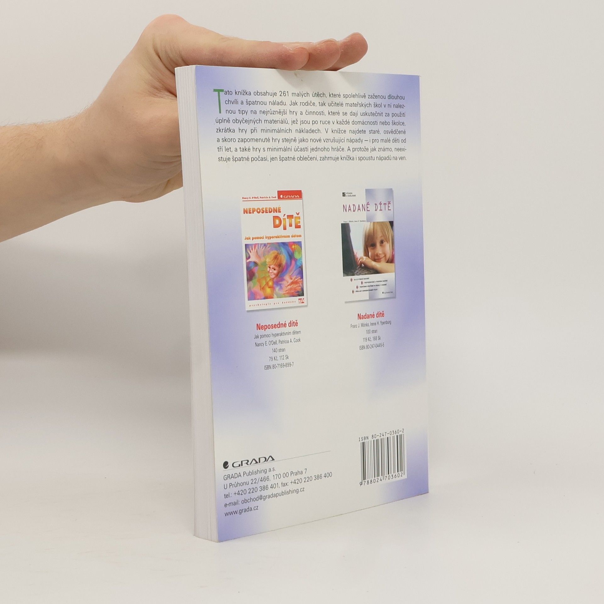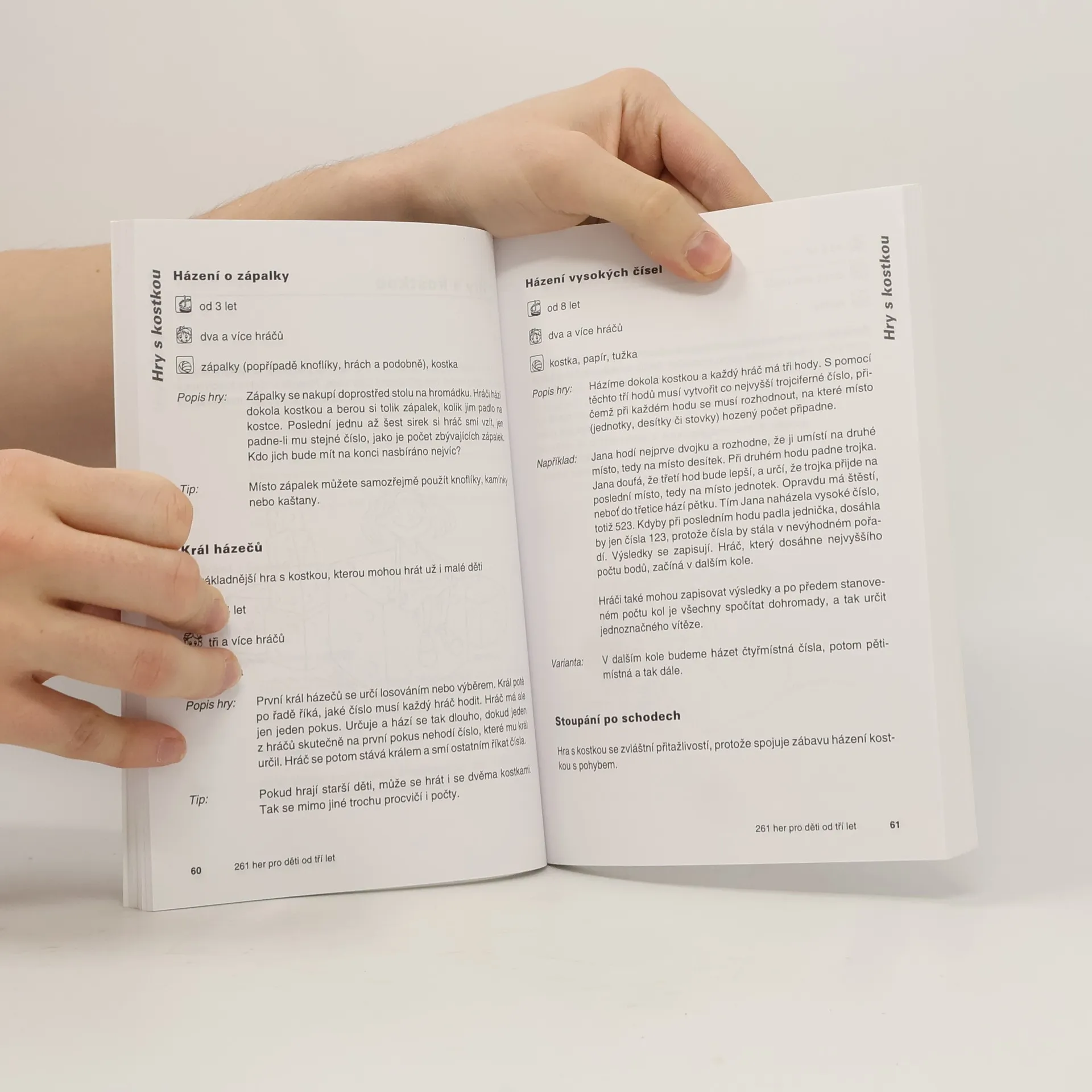 Popisy nenáročných, jednoduchých her pro jednoho i více hráčů, ke kterým nám stačí úplně obyčejné předměty a materiály běžně dostupné v domácnosti či školce. U každé hry je na začátku vždy uveden počet hráčů, vhodný věk dětí (v rozmezí 3 až 9 let) a seznam předmětů nezbytných pro realizaci hry (tužky, kamínky, papíry apod.). Pak už následuje stručný popis hry. Abecední seznam všech her - pro lepší přehled - nalezneme v závěru knihy. Vhodná inspirace pro každého, kdo se stará o malé děti a docházejí mu nápady na co si hrát.