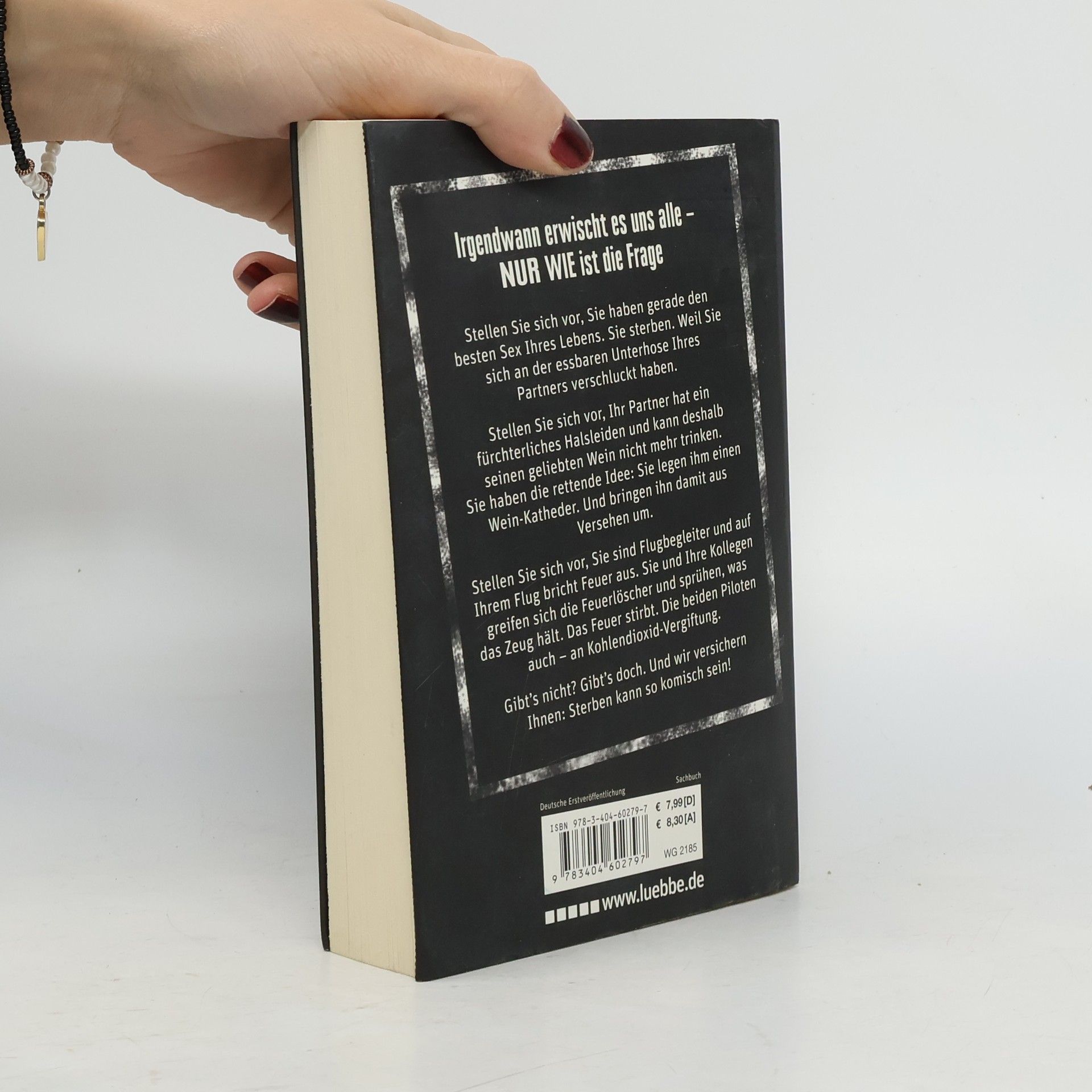 Stellen Sie sich vor, Sie haben gerade den besten Sex Ihres Lebens. Sie sterben. Weil Sie sich an der essbaren Unterhose Ihres Partners verschluckt haben.Stellen Sie sich vor, Ihr Partner hat ein fürchterliches Halsleiden und kann deshalb seinen geliebten Wein nicht mehr trinken. Sie haben die rettende Idee: Sie legen ihm einen Wein-Katheder. Und bringen ihn damit aus Versehen um.Stellen Sie sich vor, Sie sind Flugbegleiter und auf Ihrem Flug bricht Feuer aus. Sie und Ihre Kollegen greifen sich die Feuerlöscher und sprühen, was das Zeug hält. Das Feuer stirbt. Die beiden Piloten auch - an Kohlendioxid-Vergiftung. Gibt's nicht? Gibt's doch. Und wir versichern Ihnen: Sterben kann so komisch sein!