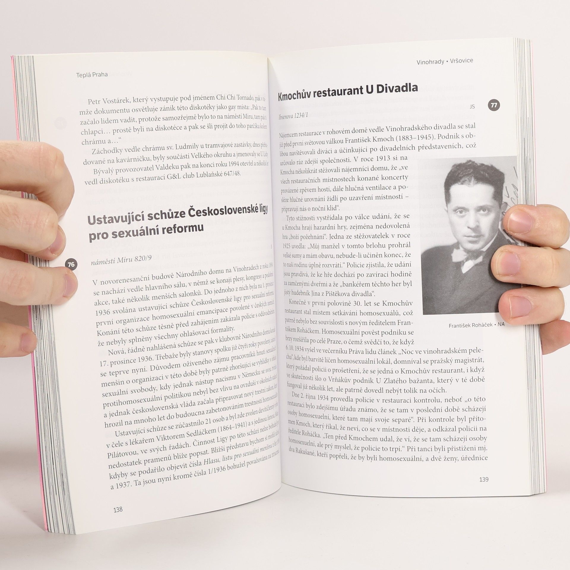 Podívejte se na Prahu jinýma očima. Poněkud neobvyklý průvodce Prahou vám to umožní. Kniha seznamuje se 150 místy, která jsou spojena s queer komunitou. Kniha je rozdělena do několika vycházek, každá vycházka je doplněna mapkou. Nevěnuje se jen centru města, ale zabíhá i do periferních oblastí. Z předmluvy ke knize: Turisté, kteří dnes stojíce před budovou Národního divadla fotografují mozaiku s kněžnou Libuší na průčelí Obecního domu, netuší, že někde v okolí, možná na záchodcíchna dnešním Náměstí Republiky, se v roce 1902 seznámil Gustav Wolf z Františkových Lázní s vojákem, který ho po několika okamžicích horečnaté vášně nedaleko potoka Brusnice zavraždil, že jeden z "mužů října", kteří 28.10. 1918 vyhlásili republiku, byl po deseti letech obětí vymyšlené kampaně v novinách, že měl podíl na "homosexuální aféře ve Vrútkách", že v dnešní budově Komerční banky vlevo od Obecního domu v roce 1956 politbyro KSČ jednalo o odtrestnění homosexuality, ale nakonec rozhodlo odtrestnit raději umělé přerušení těhotenství, a že když se otočí vpravo do Hybernské ulice, spatří bývalé sídlo Sudetoněmecké strany, kde byl v roce 1937 zatčen kvůli paragrafu 129 její čelný politik Heinz Rutha, který za měsíc spáchal ve vězení sebevraždu.