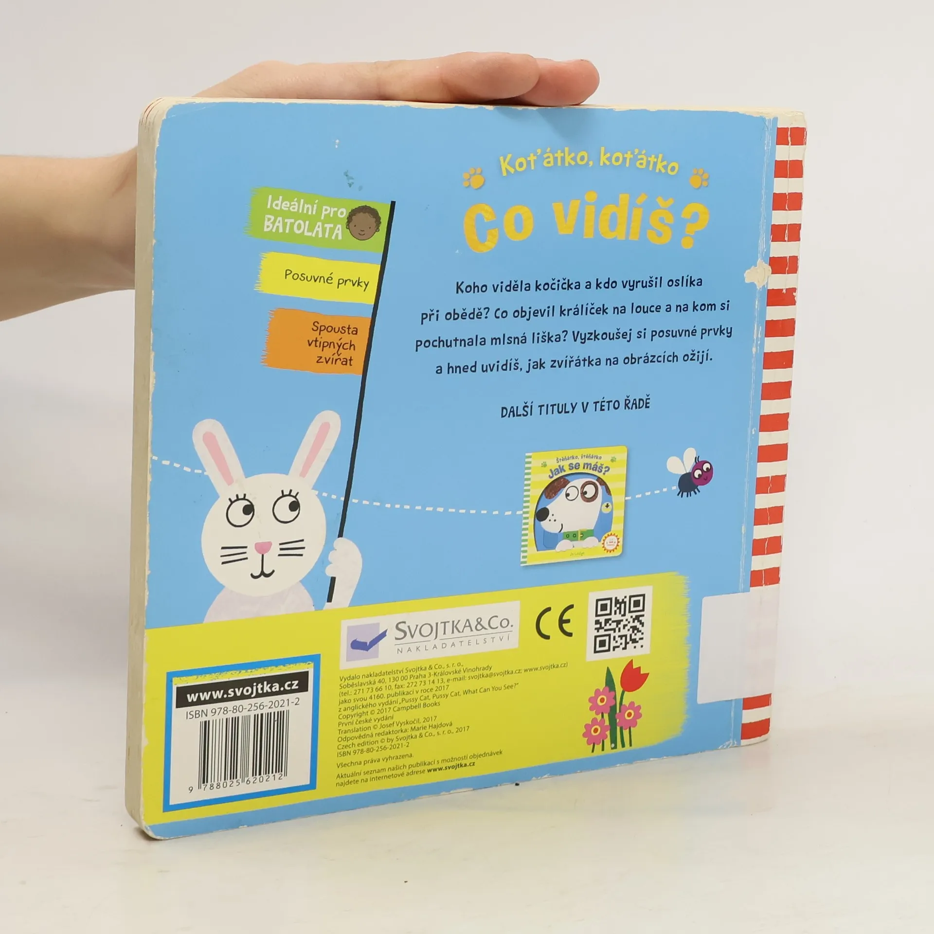 Koho viděla kočička a kdo vyrušil oslíka při obědě? Co objevil králíček na louce a na kom si pochutnala mlsná liška? Vyzkoušej si posuvné prvky a hned uvidíš, jak zvířátka na obrázcích ožijí. Zábavné první čtení – ideální pro batolata, obsahuje posuvné prvky, spoustu vtipných zvířat a hravých veršů. Tato knížka je skvělá na první chvíle společného čtení a smíchu nad veselými pohyblivými obrázky plnými legrace.