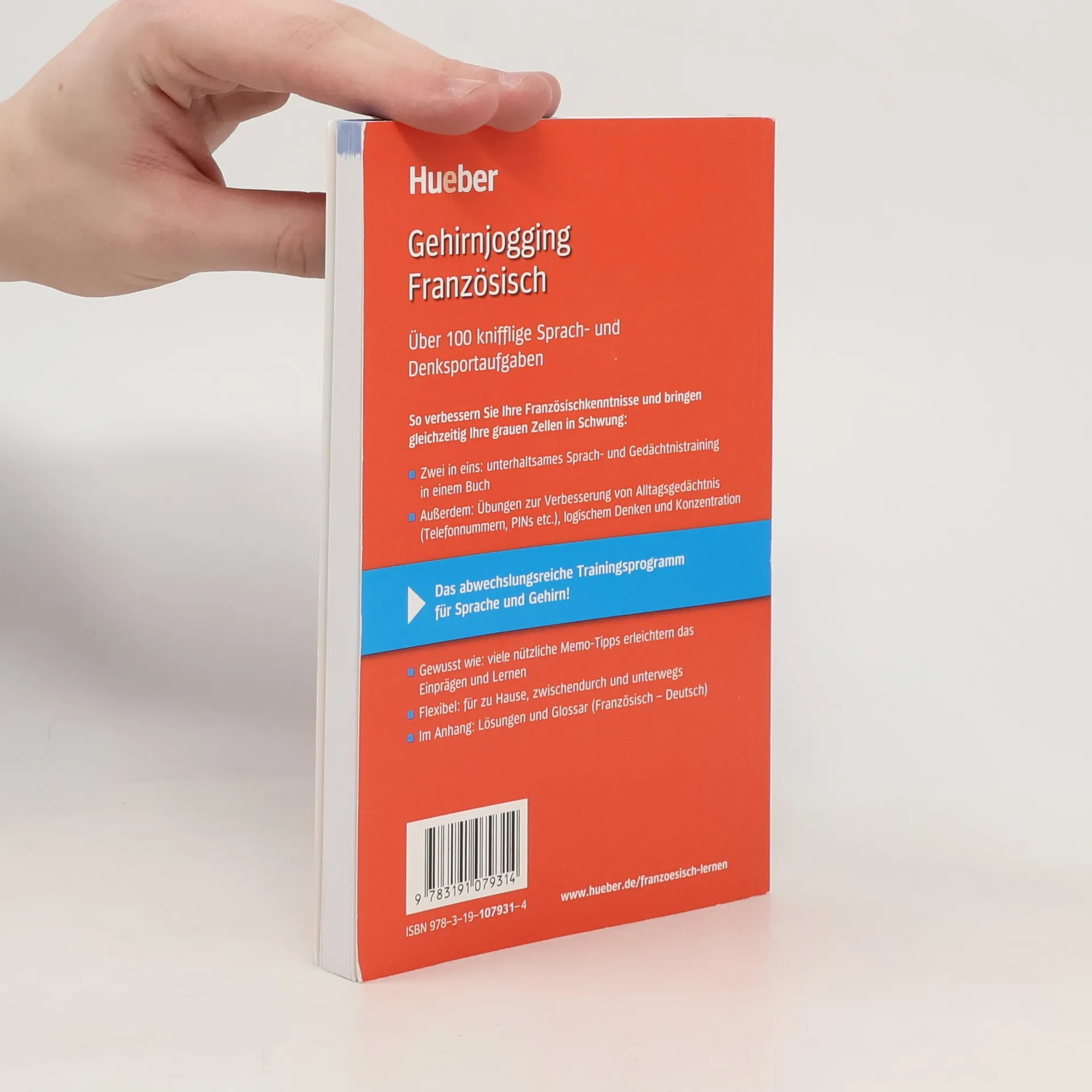 Die neue Reihe Gehirnjogging richtet sich an Lernende mit geringen oder mittleren Kenntnissen, die spielerisch und mühelos ihre Sprach- und Wortschatzkenntnisse sowie ihre Merkfähigkeit verbessern möchten. In über 100 Übungen wird das Gedächtnistraining mit dem Sprachtraining verbunden. Der Aufbau ist klar strukturiert: Die rechte Seite dient zum Einprägen und Üben von Vokabeln, kurzen Texten, Bildern oder Zahlen. Ein Verweis zum entsprechenden Memo-Tipp gibt Hinweise auf die jeweils effektivste Memotechnik. Die linke (Rück-)Seite fordert anhand gezielter Fragen bzw. Aufgaben dazu auf, zu testen, ob man sich alles gemerkt hat. Neben den Übungen zum Wörter- und Alltagsgedächtnis enthält Gehirnjogging Französisch auch Tipps zur Steigerung der Merkfähigkeit, Erläuterungen der wichtigsten Memotechniken sowie Hintergrundinformationen zu Gedächtnis, Gehirn und Lerntypen. Die Lösungen zu den Übungen sowie ein Glossar (Französisch-Deutsch) befinden sich im Anhang.