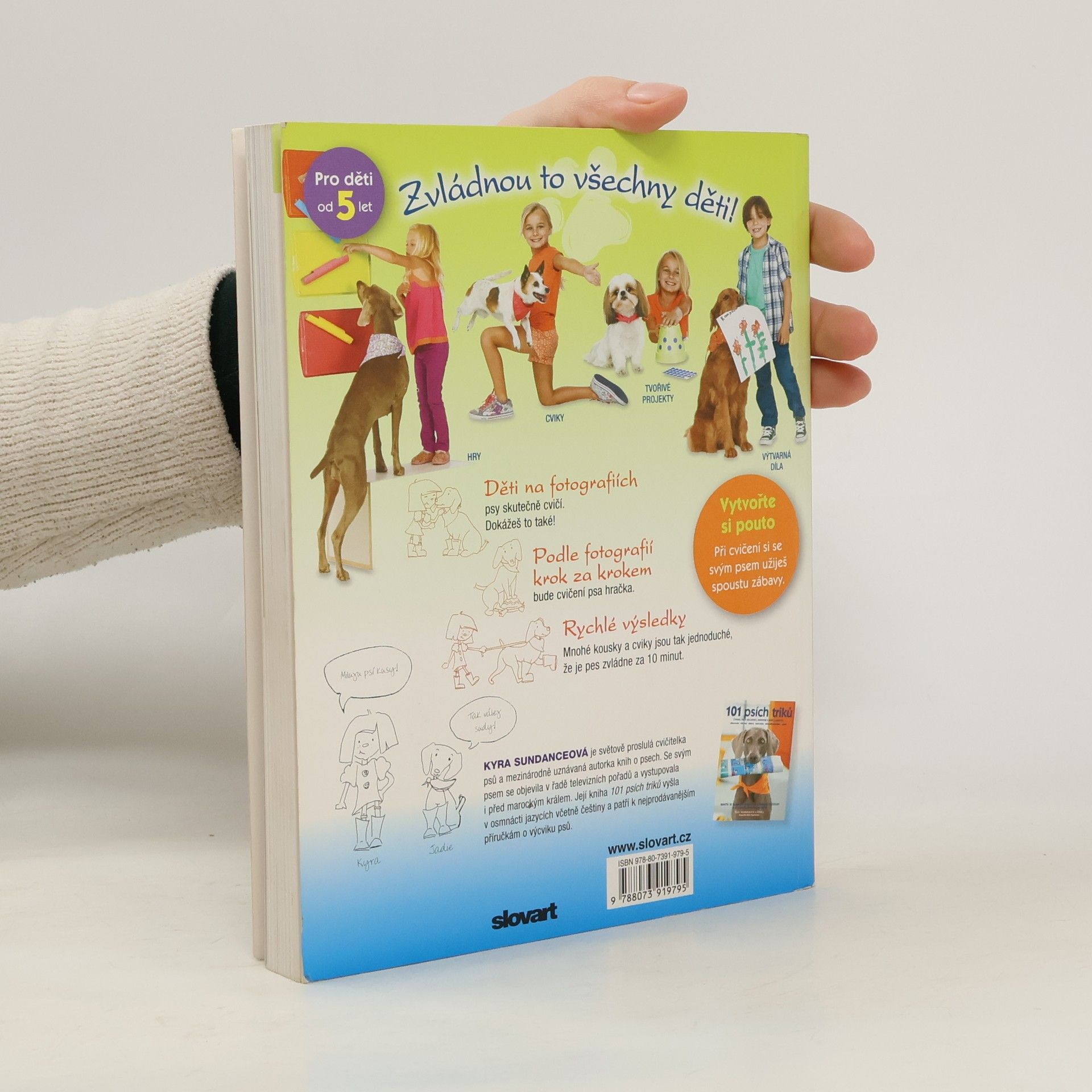 Knížka 101 psích triků pro děti proslulé cvičitelky psů a autorky mnoha bestsellerů Kyry Sundanceové volně navazuje na veleúspěšnou publikaci 101 psích triků téže autorky. Cvičitelka krok za krokem a pro děti přitažlivou formou podává návody, jak mohou děti samy naučit své psí miláčky celé řadě kousků, a dokonce s nimi či pro ně realizovat zajímavé tvořivé projekty. Společný nácvik je skvělý způsob, jak si může dítě se svým psem vybudovat silné pouto, jak mu pomoci začlenit se rodiny a jak jej udržovat v dobré fyzické i psychické kondici. Všechny kousky a cviky byly vybrány s ohledem na dětské schopnosti. Mnohé z nich jsou tak jednoduché, že je pes dokáže zvládnout již během 10 minut. Všechny návody doprovázejí fotografie, které nácvik ilustrují krok za krokem.