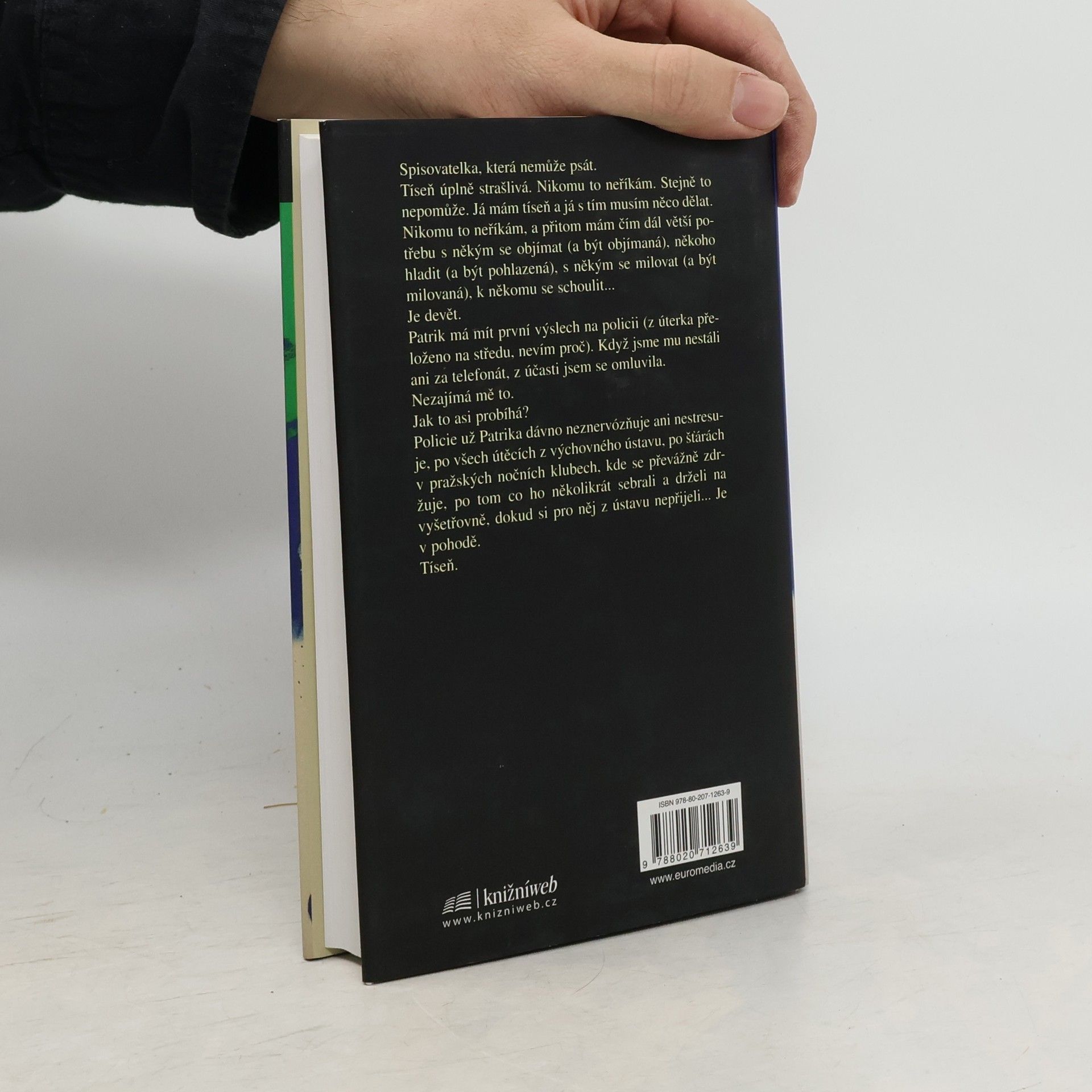 Spisovatelka, která nemůže psát. Tíseň úplně strašlivá. Nikomu to neříkám. Stejně to nepomůže. Já mám tíseň a já s tím musím něco dělat. Nikomu to neříkám a přitom mám čím dál větší potřebu s někým se objímat (a být objímaná), někoho hladit (a být pohlazená), s někým se milovat (a být milovaná), k někomu se schoulit... Je devět. Patrik má mít první výslech na policii (z úterka přeloženo na středu, nevím proč). Když jsme mu nestáli ani za telefonát, z účasti jsem se omluvila. Nezajímá mě to. Jak to asi probíhá? Policie už Patrika dávno neznervózňuje ani nestresuje, po všech útěcích z výchovného ústavu, po šťárách v pražských nočních klubech, kde se převážně zdržuje, po tom, co ho několikrát sebrali a drželi na vyšetřovně, dokud si pro něj z ústavu nepřijeli... Je v pohodě. Tíseň.