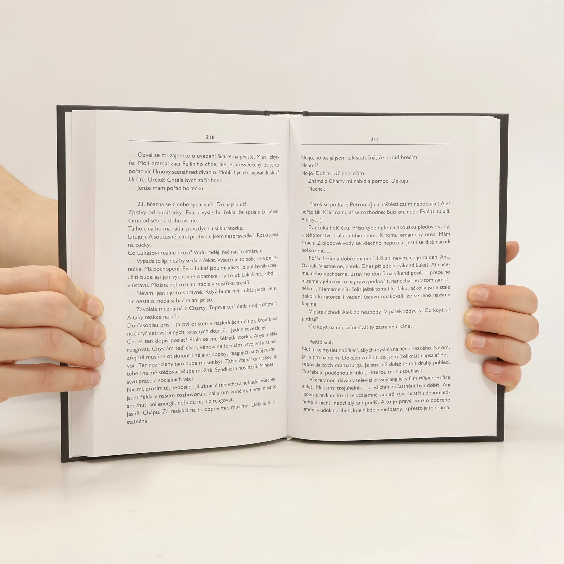 Spisovatelka, která nemůže psát. Tíseň úplně strašlivá. Nikomu to neříkám. Stejně to nepomůže. Já mám tíseň a já s tím musím něco dělat. Nikomu to neříkám a přitom mám čím dál větší potřebu s někým se objímat (a být objímaná), někoho hladit (a být pohlazená), s někým se milovat (a být milovaná), k někomu se schoulit... Je devět. Patrik má mít první výslech na policii (z úterka přeloženo na středu, nevím proč). Když jsme mu nestáli ani za telefonát, z účasti jsem se omluvila. Nezajímá mě to. Jak to asi probíhá? Policie už Patrika dávno neznervózňuje ani nestresuje, po všech útěcích z výchovného ústavu, po šťárách v pražských nočních klubech, kde se převážně zdržuje, po tom, co ho několikrát sebrali a drželi na vyšetřovně, dokud si pro něj z ústavu nepřijeli... Je v pohodě. Tíseň.