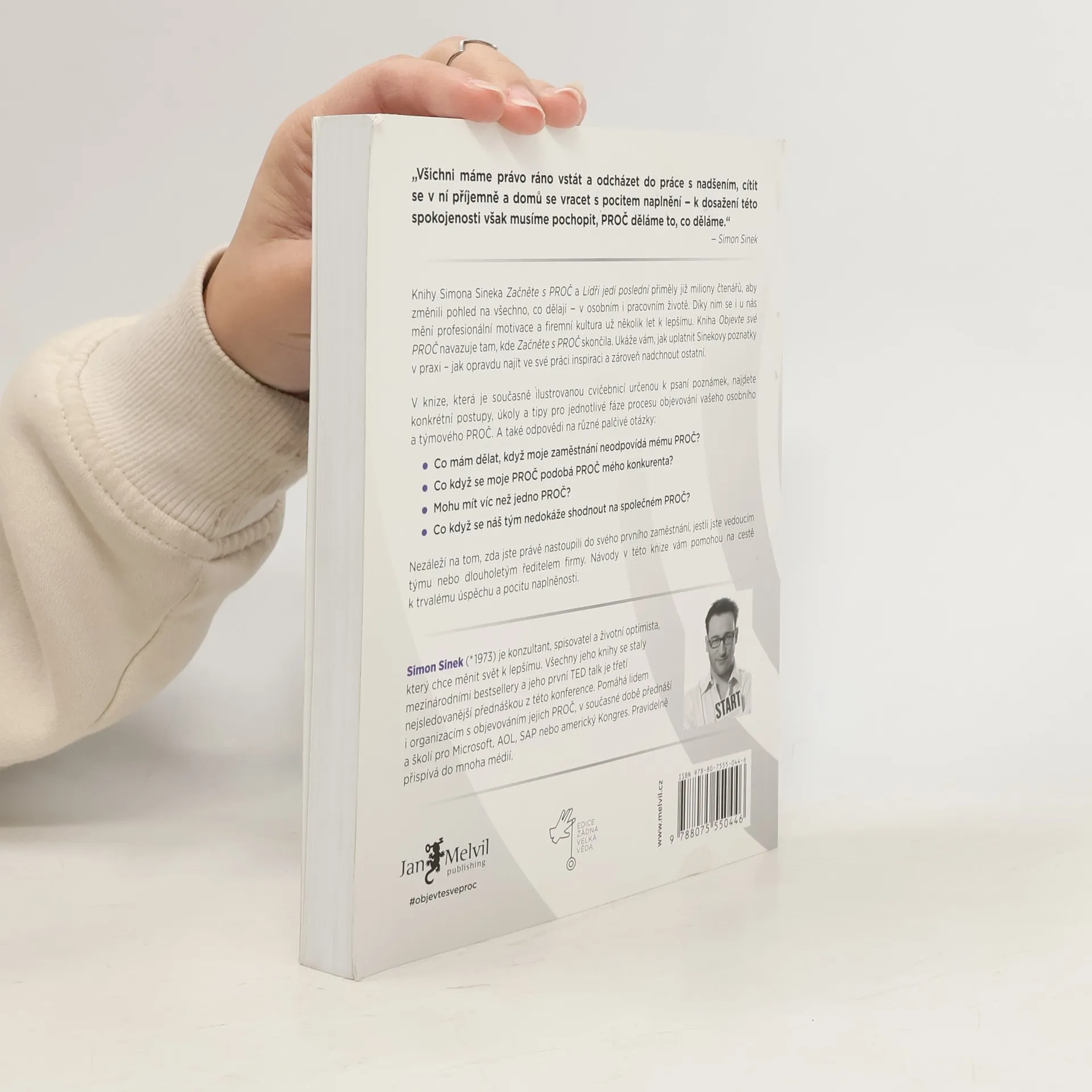 Simona Sinka již znáte, jeho kniha Začněte s PROČ přiměla miliony čtenářů změnit pohled na osobní život, kariéru i organizaci. Společně s Lídři jedí poslední posouvá firemní kulturu, motivaci zaměstnanců a spokojenost k lepšímu. Kniha Objevte své PROČ navazuje na předchozí dílo a ukazuje, jak aplikovat Sinekovy poznatky v praxi, abyste našli inspiraci ve své práci a inspirovali ostatní. Simon Sinek věří, že spokojenost je právem, nikoliv privilegiem. Každý by měl mít možnost probouzet se s nadšením, cítit se v práci bezpečně a odcházet s pocitem uspokojení. Dosažení spokojenosti úzce souvisí s pochopením, PROČ děláme to, co děláme. Kniha nabízí konkrétní postupy, cvičení, ilustrace a tipy pro jednotlivé fáze procesu. Odpovídá na důležité otázky, jako například: Co když se moje PROČ podobá PROČ mého konkurenta? Mohu mít víc než jedno PROČ? Co dělat, když moje zaměstnání neodpovídá mému PROČ? Co když se náš tým nedokáže shodnout na společném PROČ? Bez ohledu na to, zda jste na začátku kariéry, vedoucím týmu nebo ředitelem firmy, návody a cvičení v této knize vám pomohou na cestě k dlouhodobému úspěchu a pocitu naplněnosti.